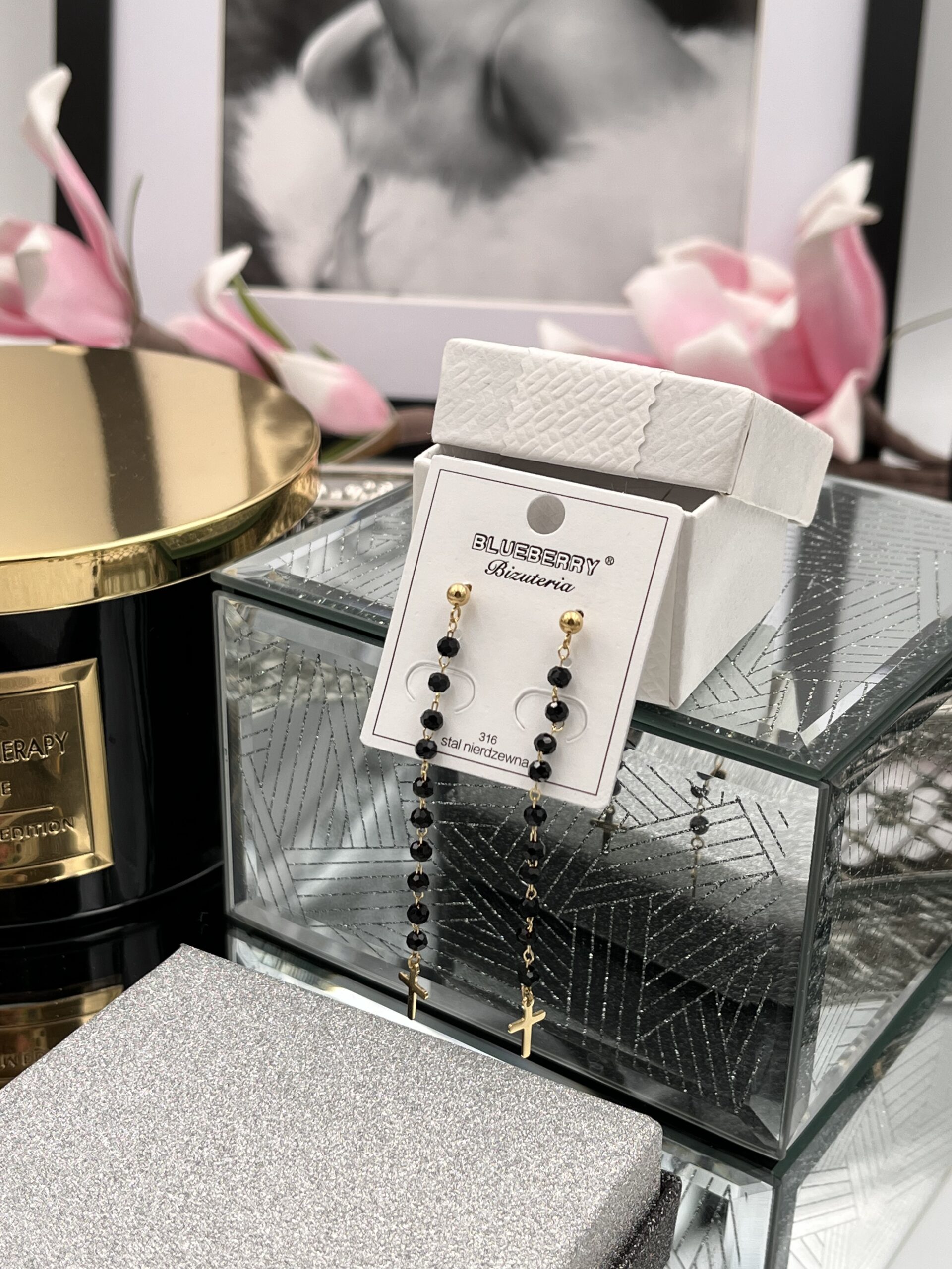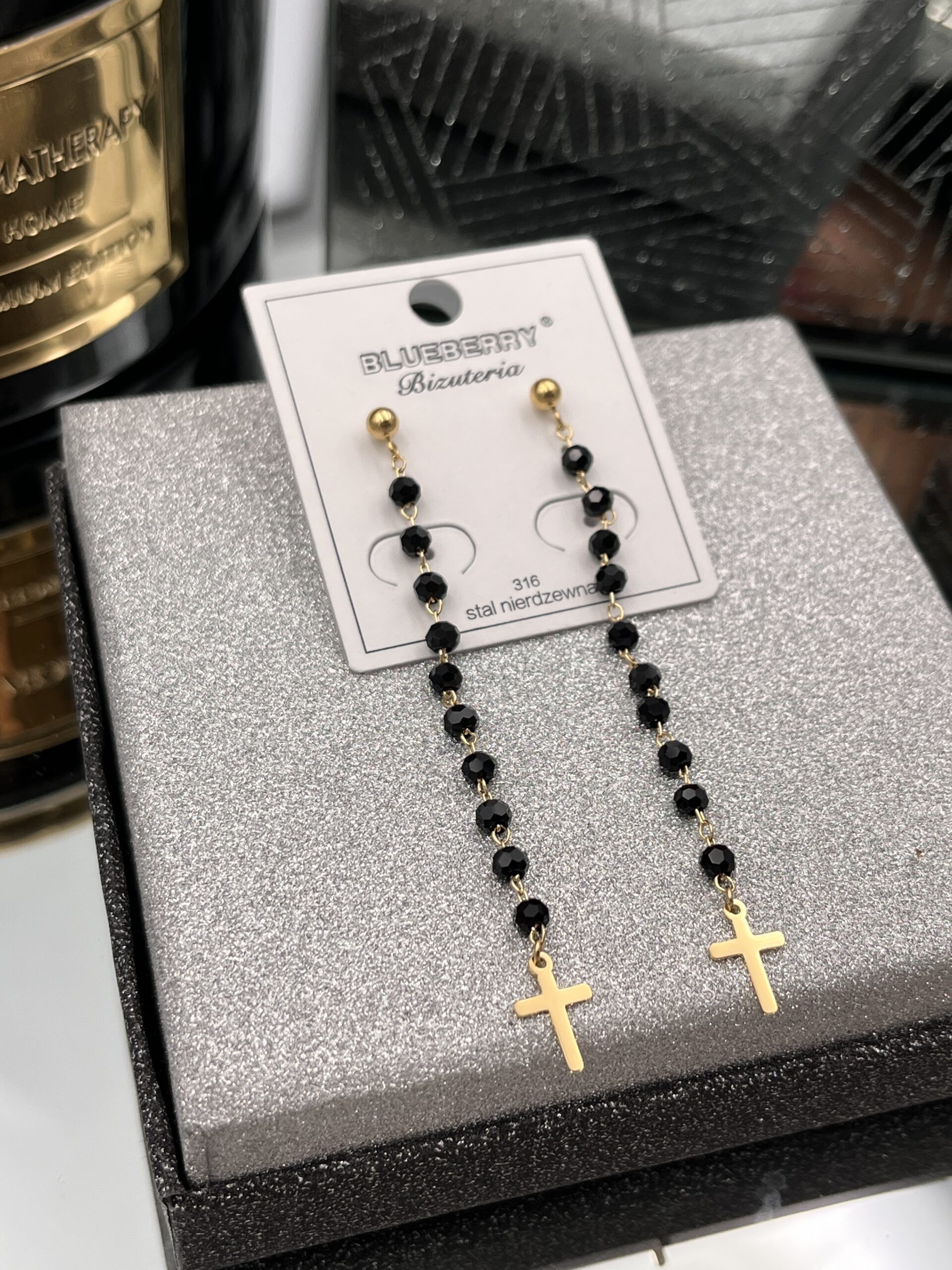 Kolczyki krzyżyki długie kamienie czarne. Kolor złoty.