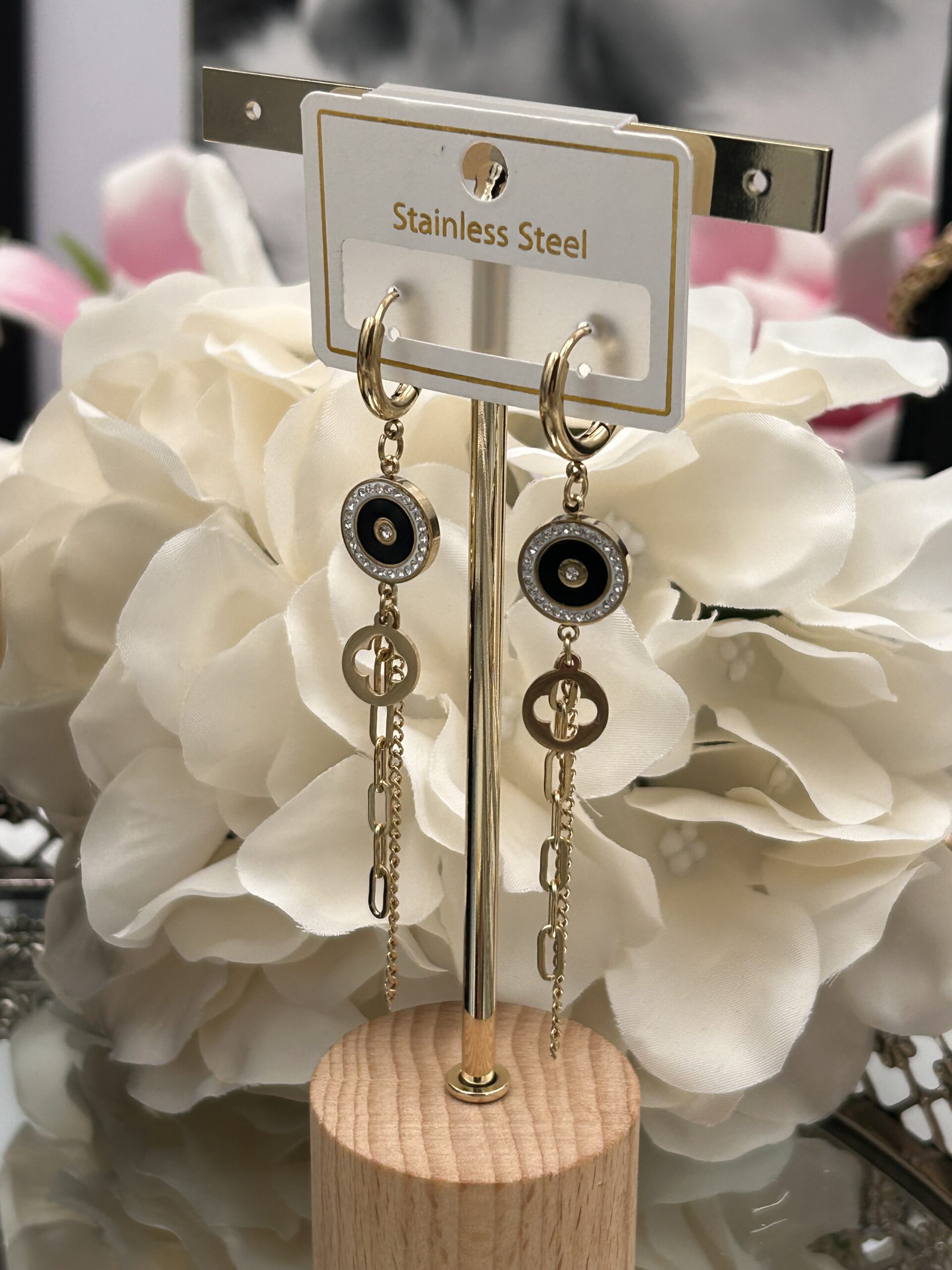 Kolczyki kółka koniczynka kwiatek cyrkonie łańcuszki złote stal 316L