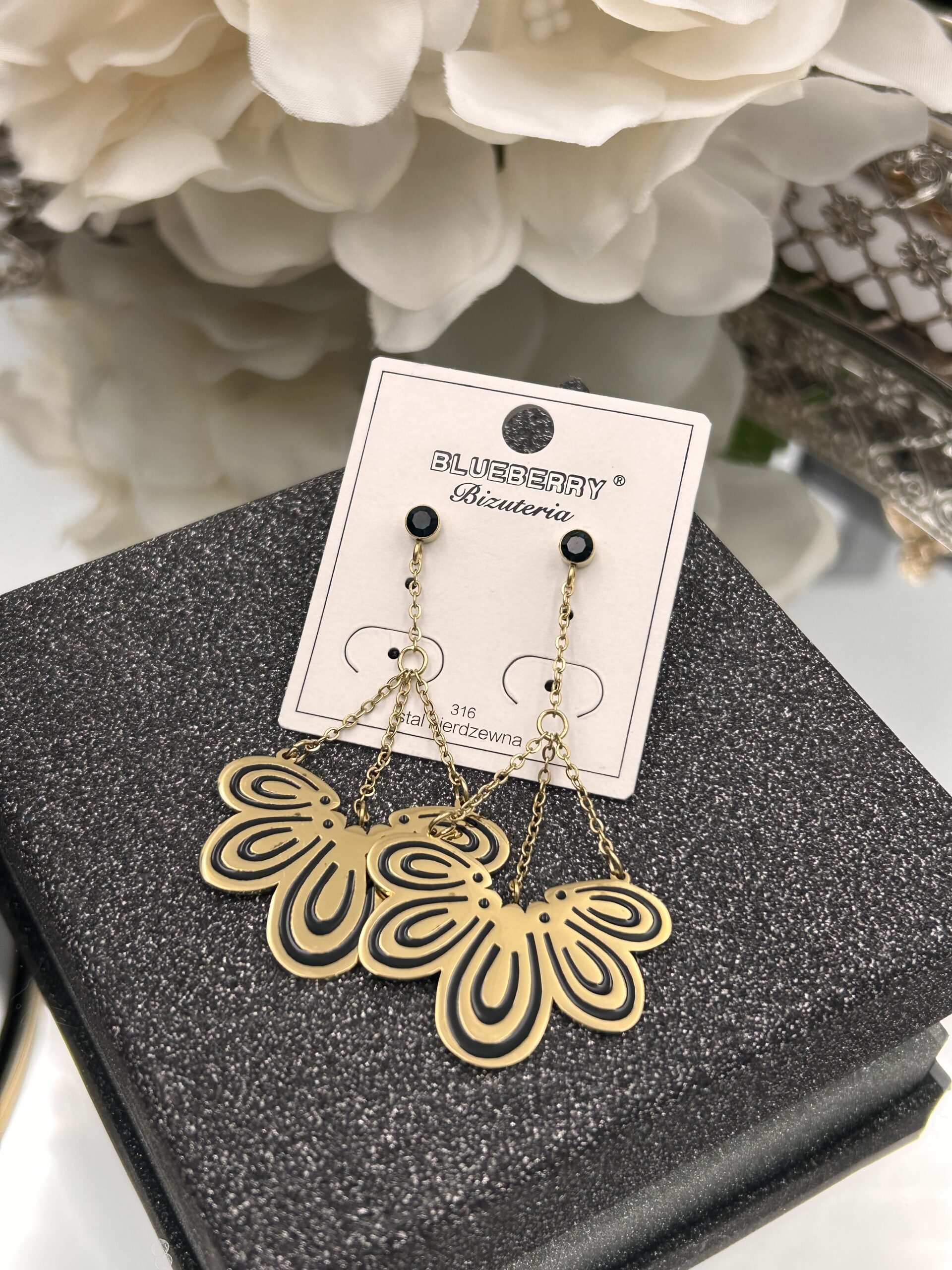 Kolczyki KWIAT czarna cyrkonia. Kolor złoty z czarnym wypełnieniem.