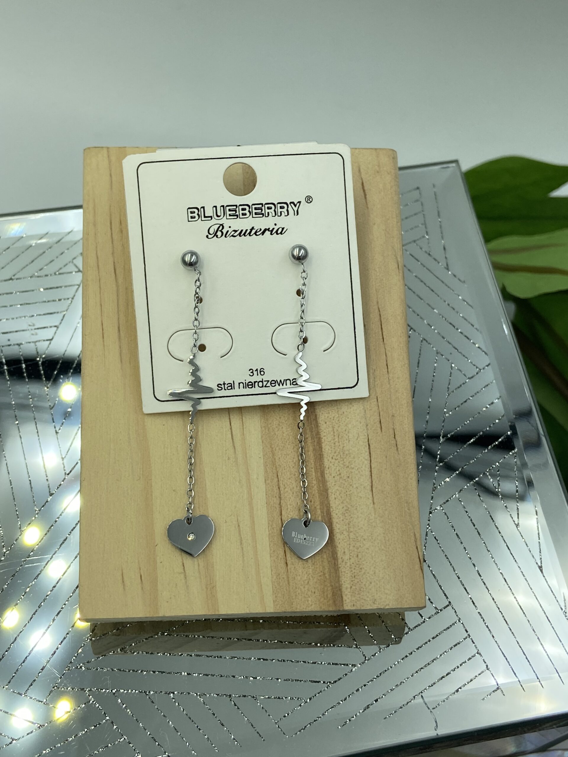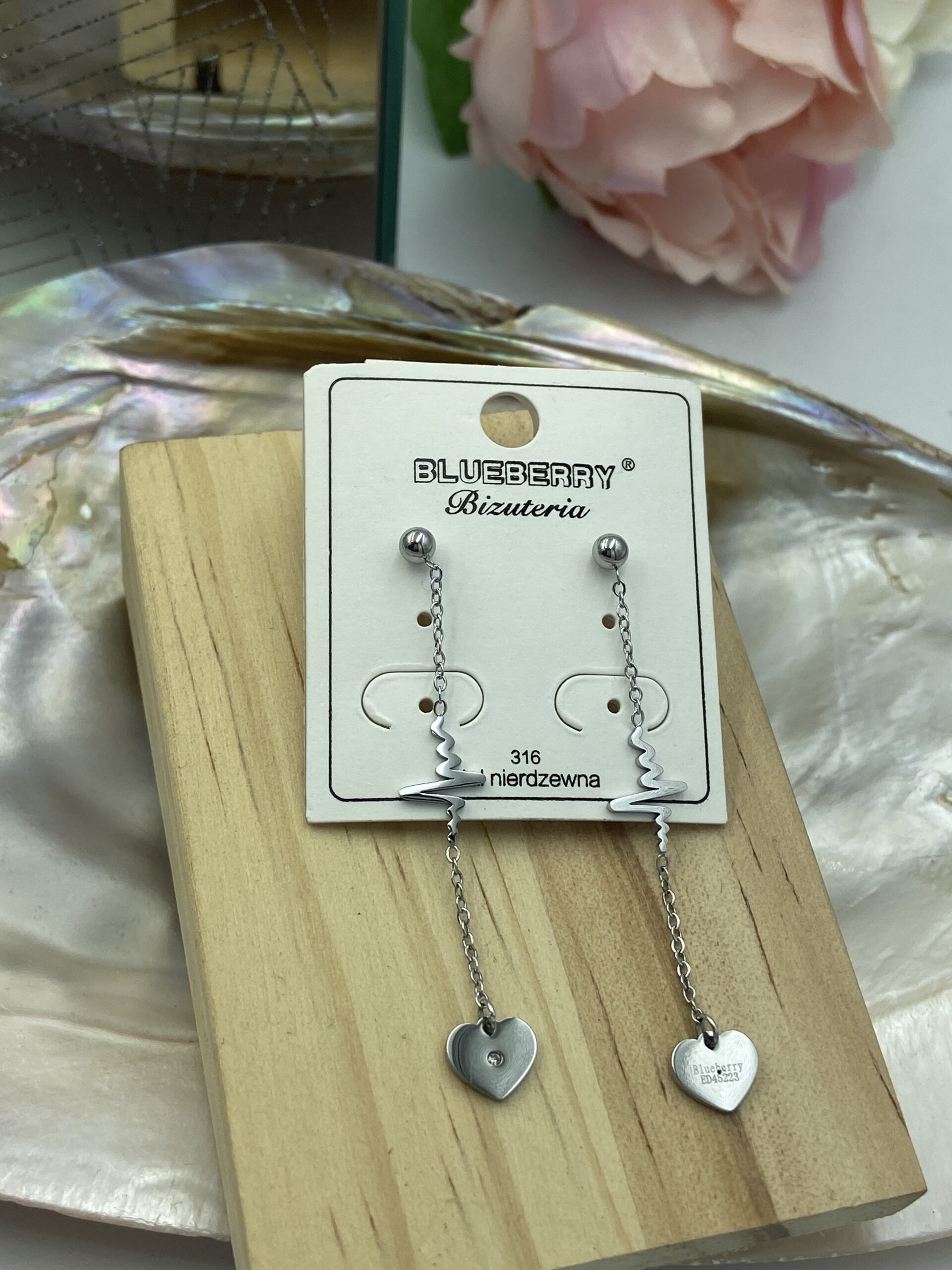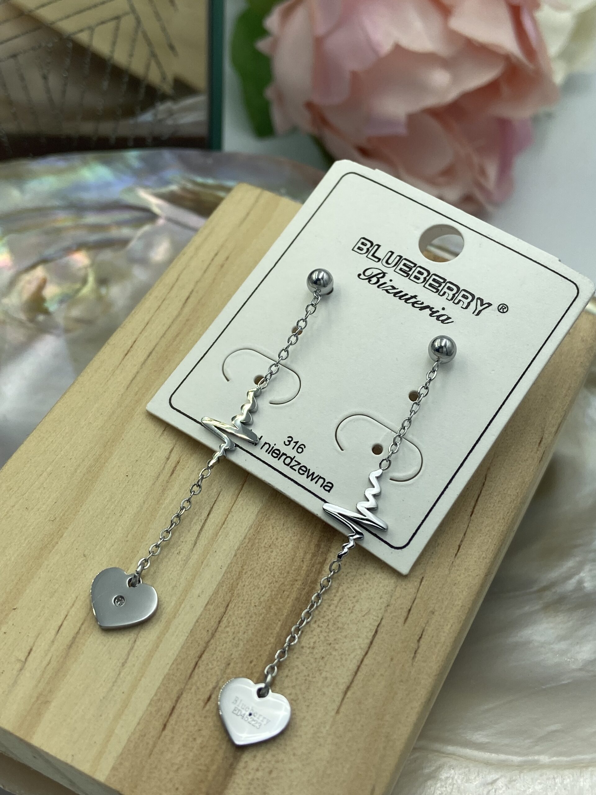Wiszące kolczyki – linia życia i serce z cyrkonią na łańcuszku. Kolor srebrny.
