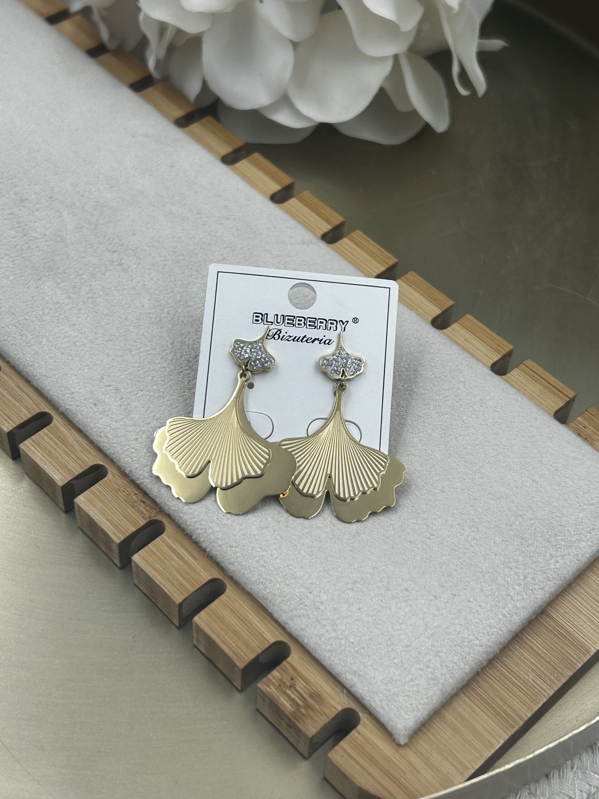 Kolczyki liść listki Miłorzębu cyrkonie stal 316L złote