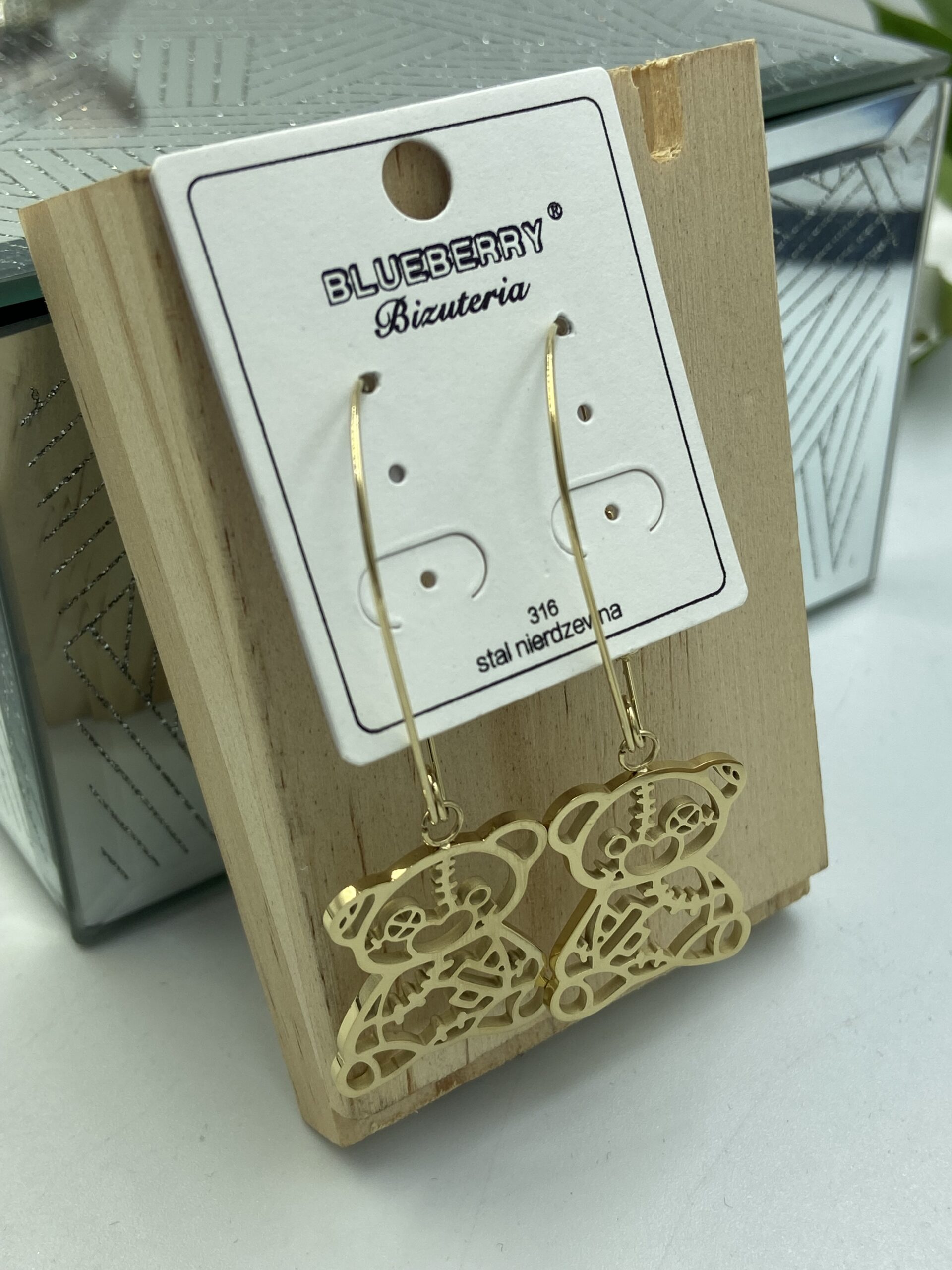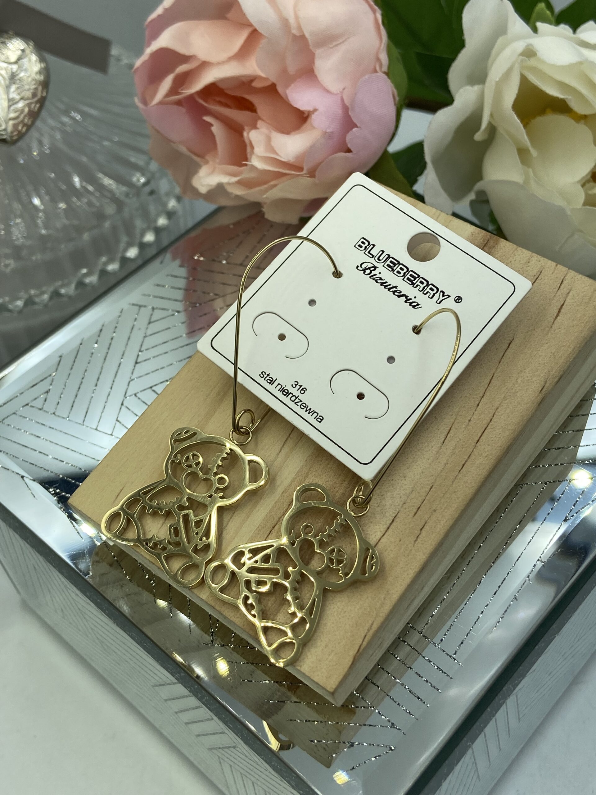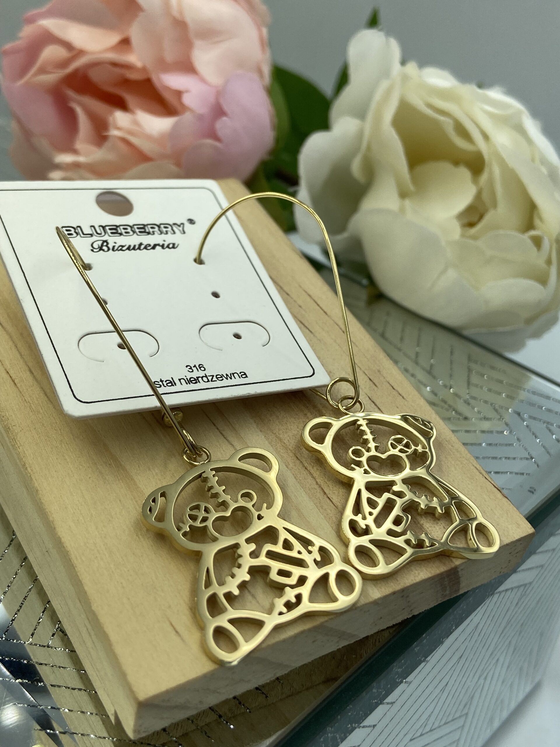 Duże kolczyki wiszące, ażurowe misie. Kolor złoty.