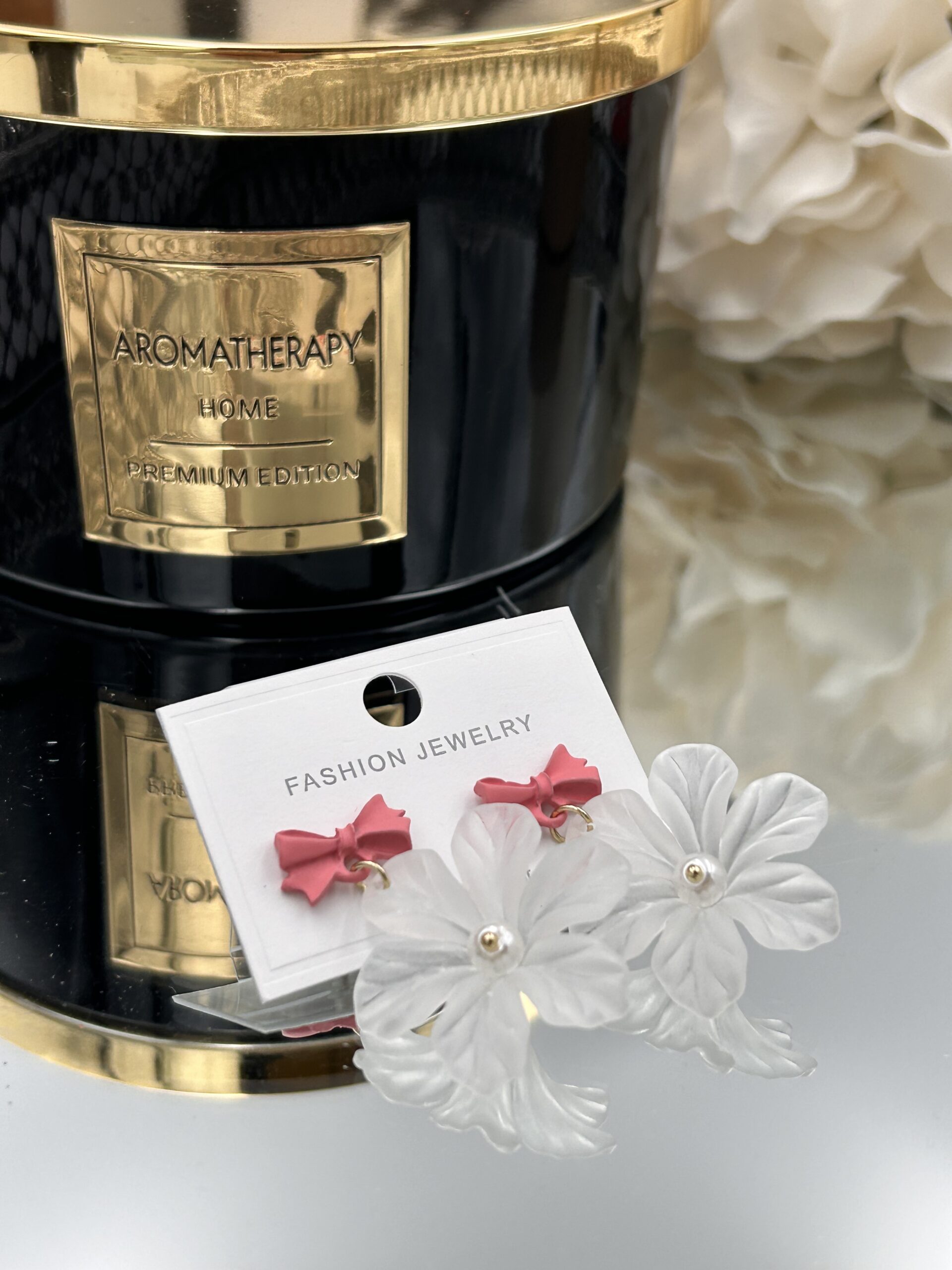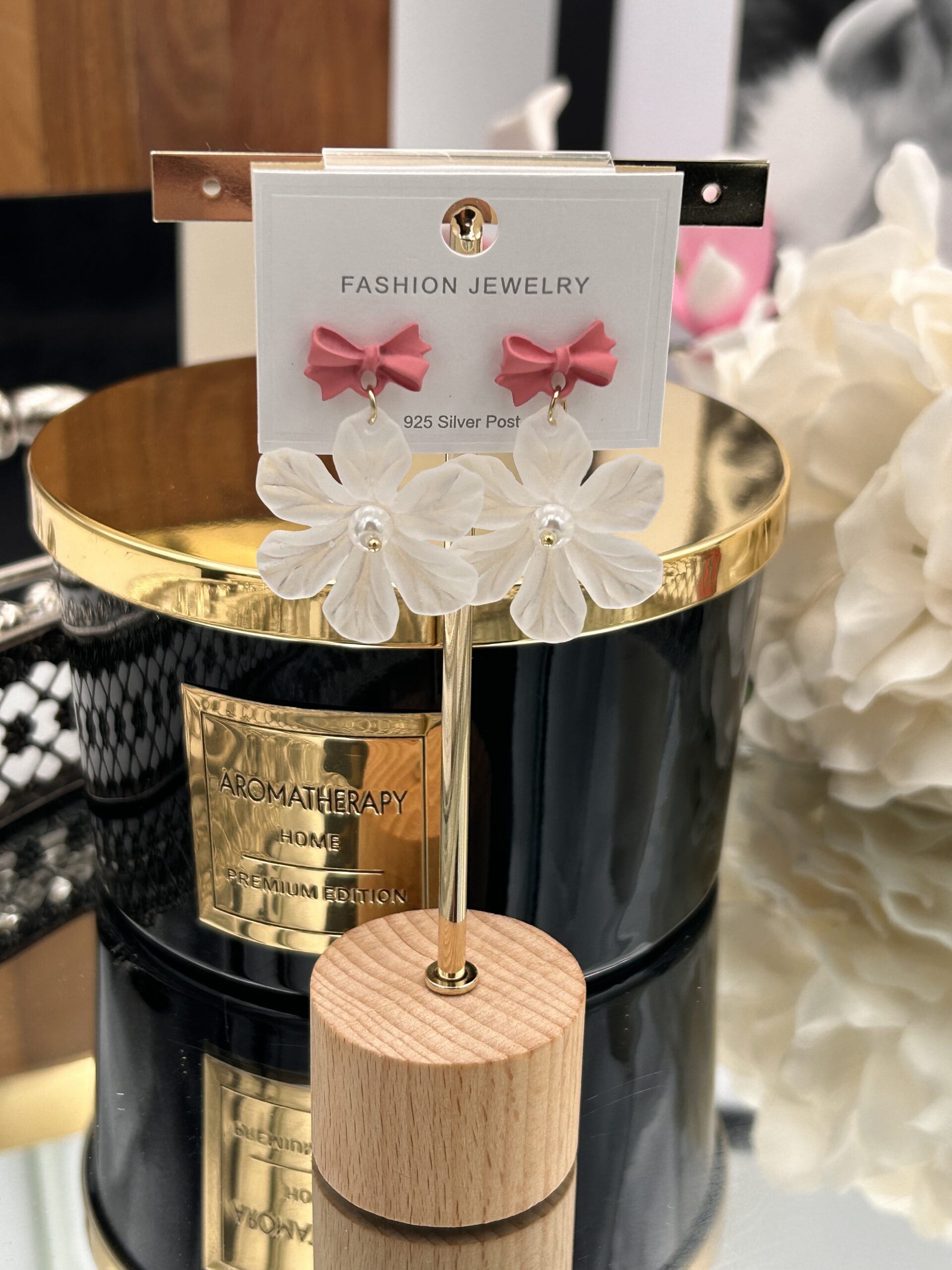 KOLCZYKI białe kwiatuszki z różową kokardką stal 316L