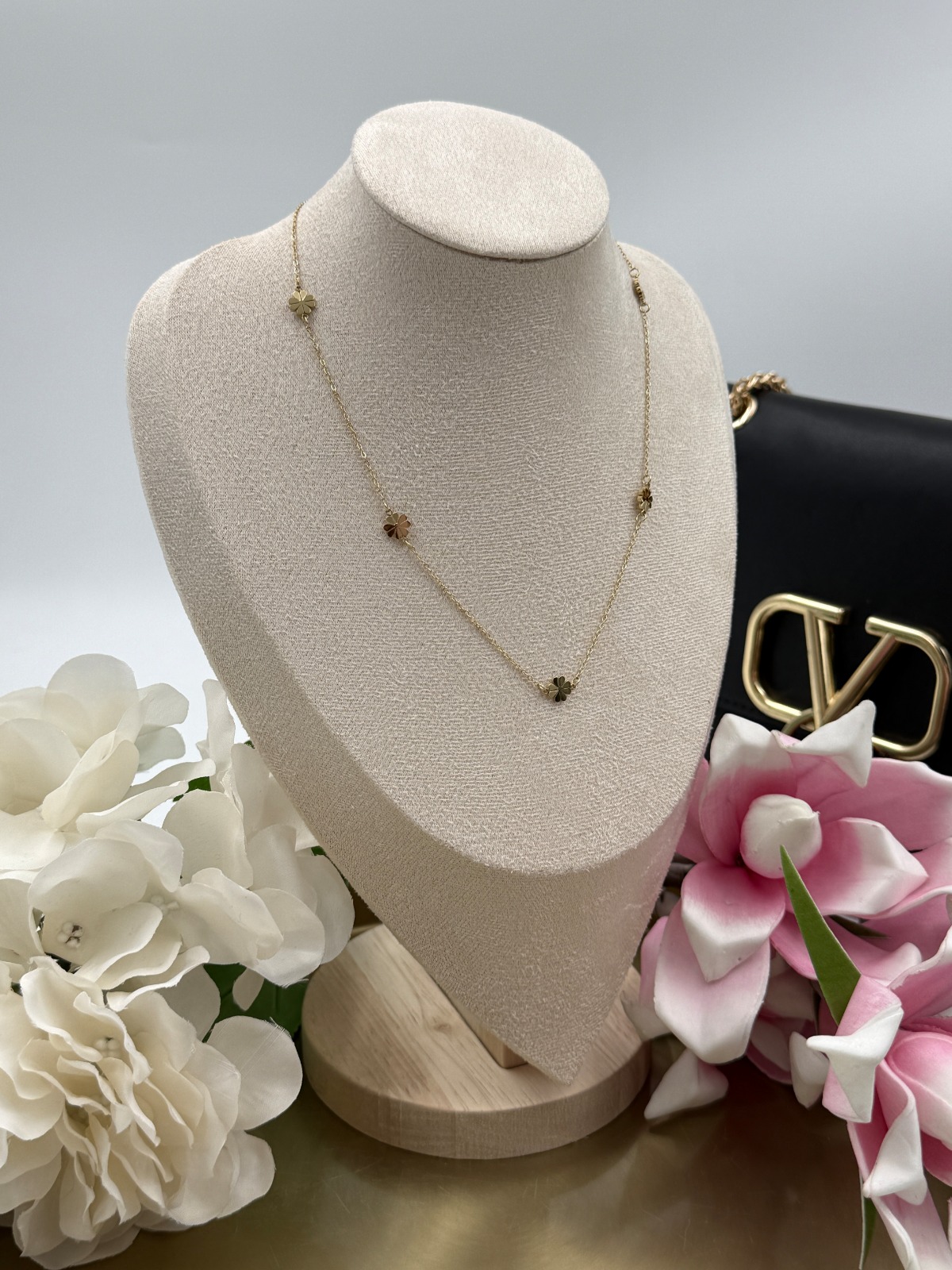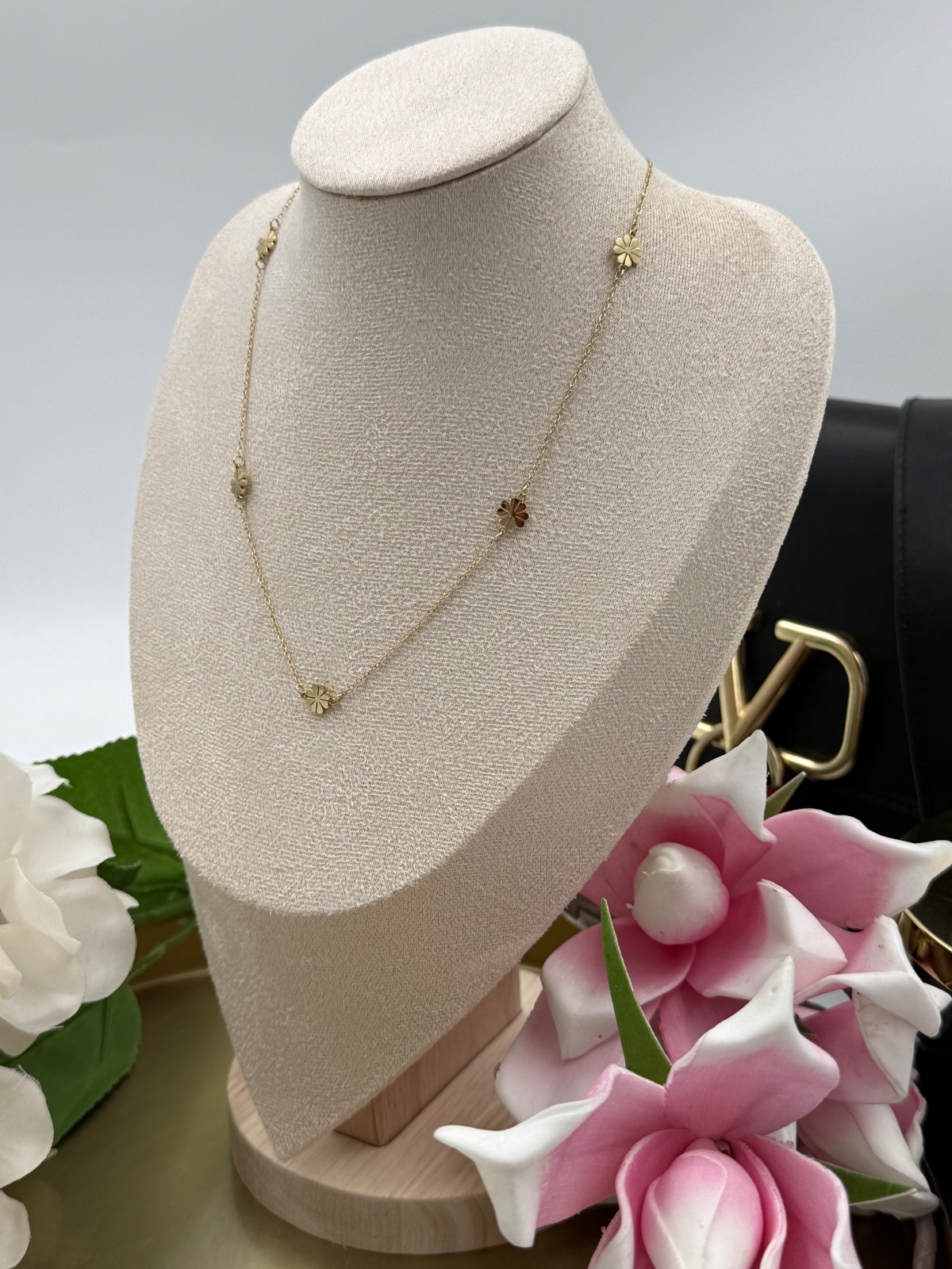 Celebrytka, delikatny łańcuszek – koniczynki, kwiatki, dwa płatki matowe. Kolor złoty.