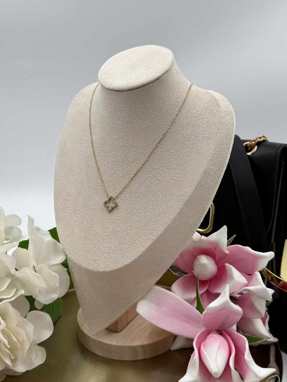 Celebrytka, delikatny łańcuszek – kwiatek, koniczynka, cyrkonie. Kolor złoty.