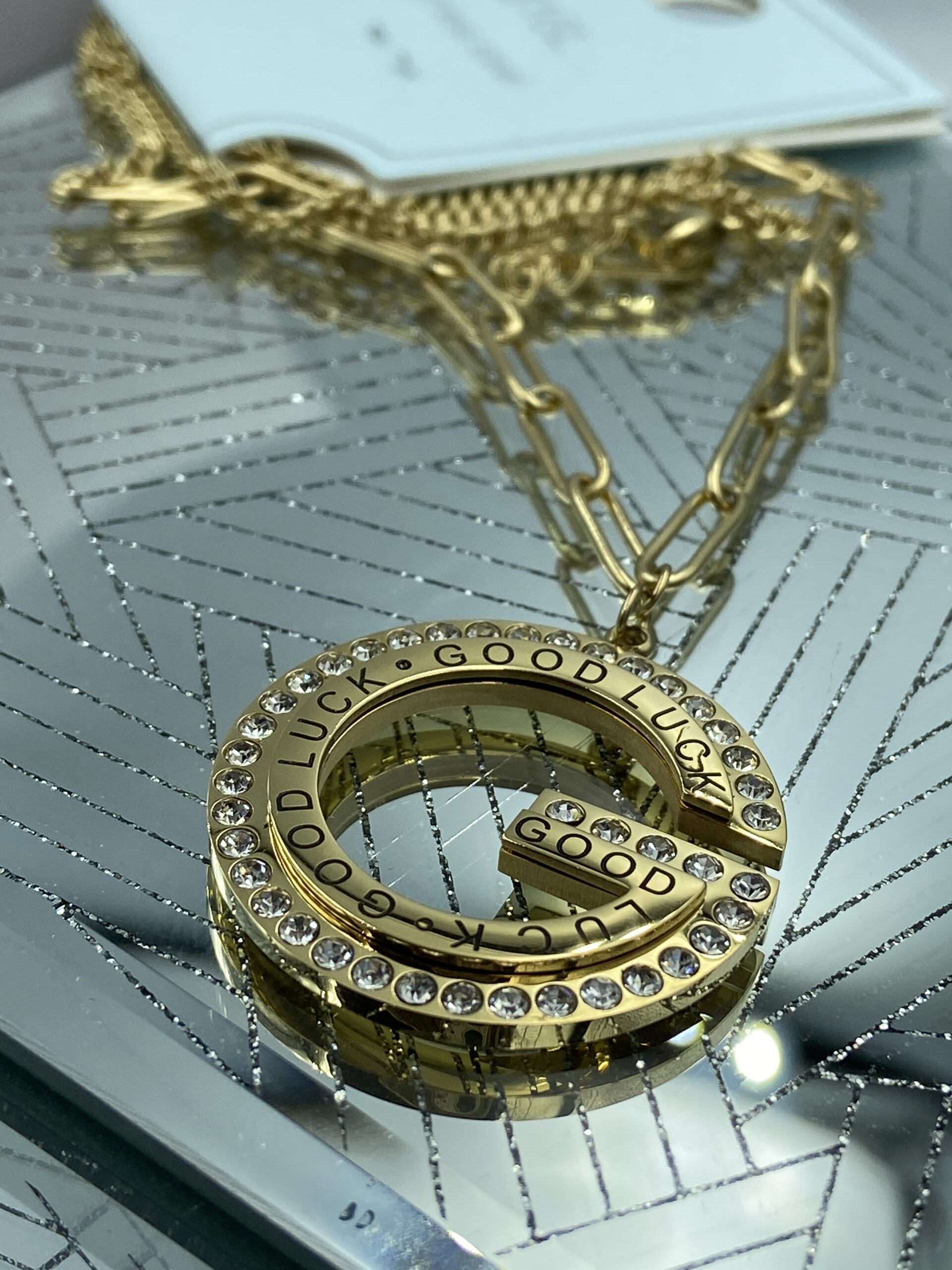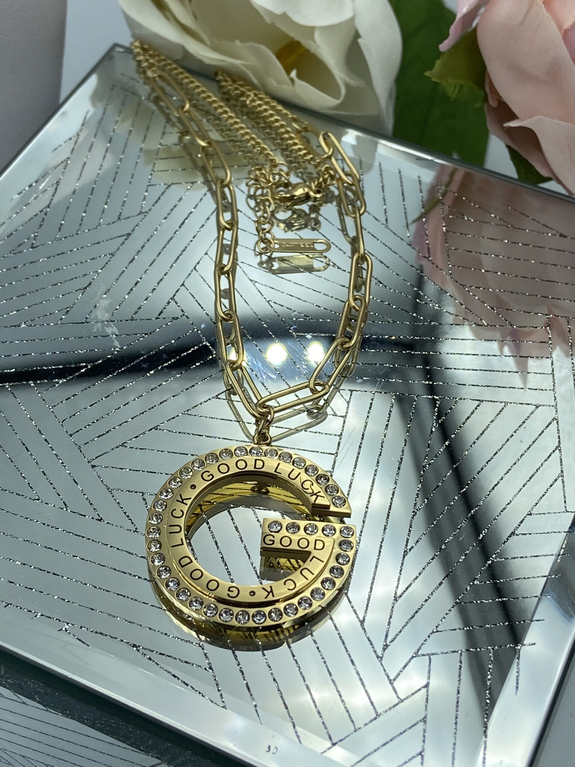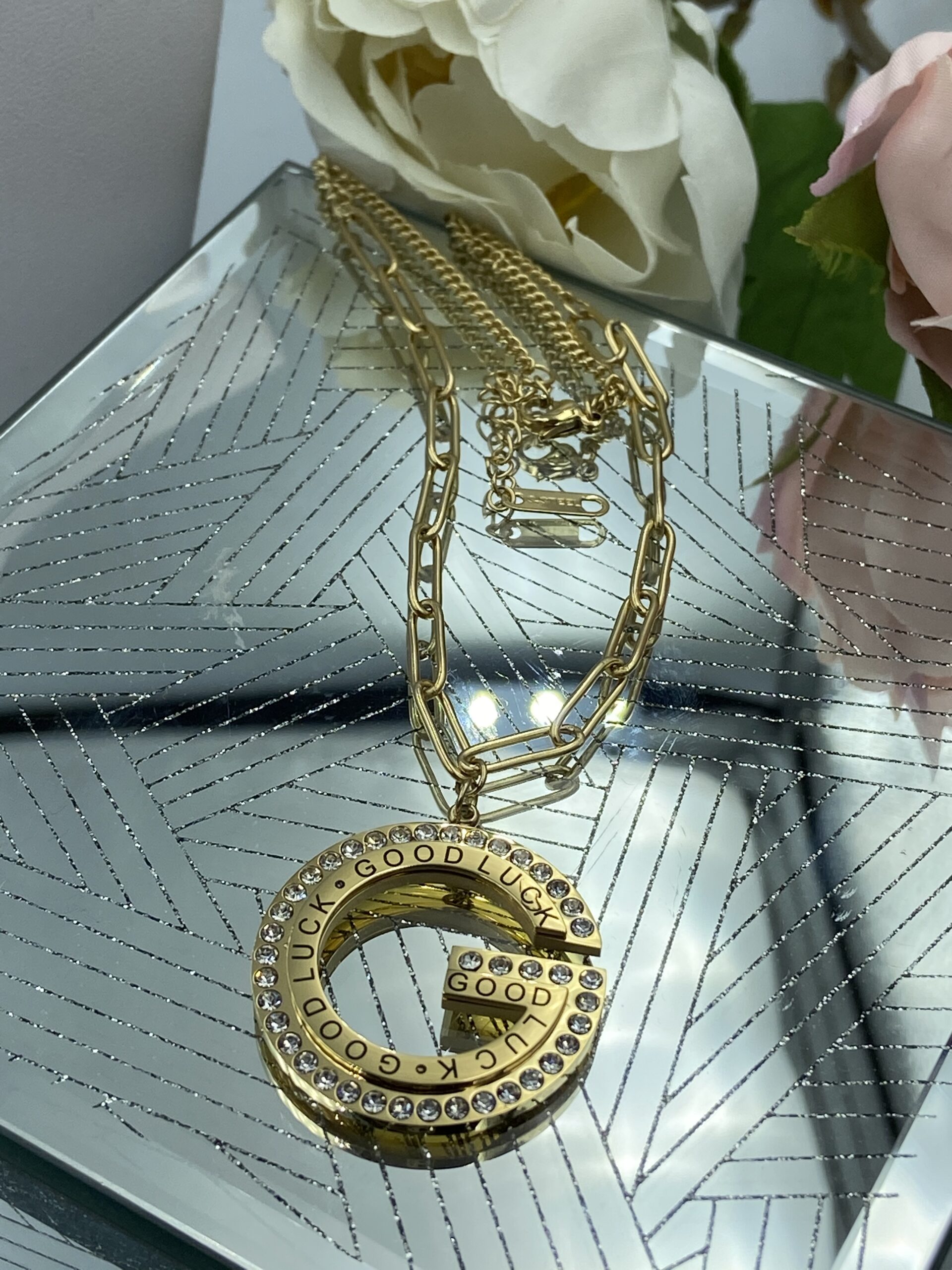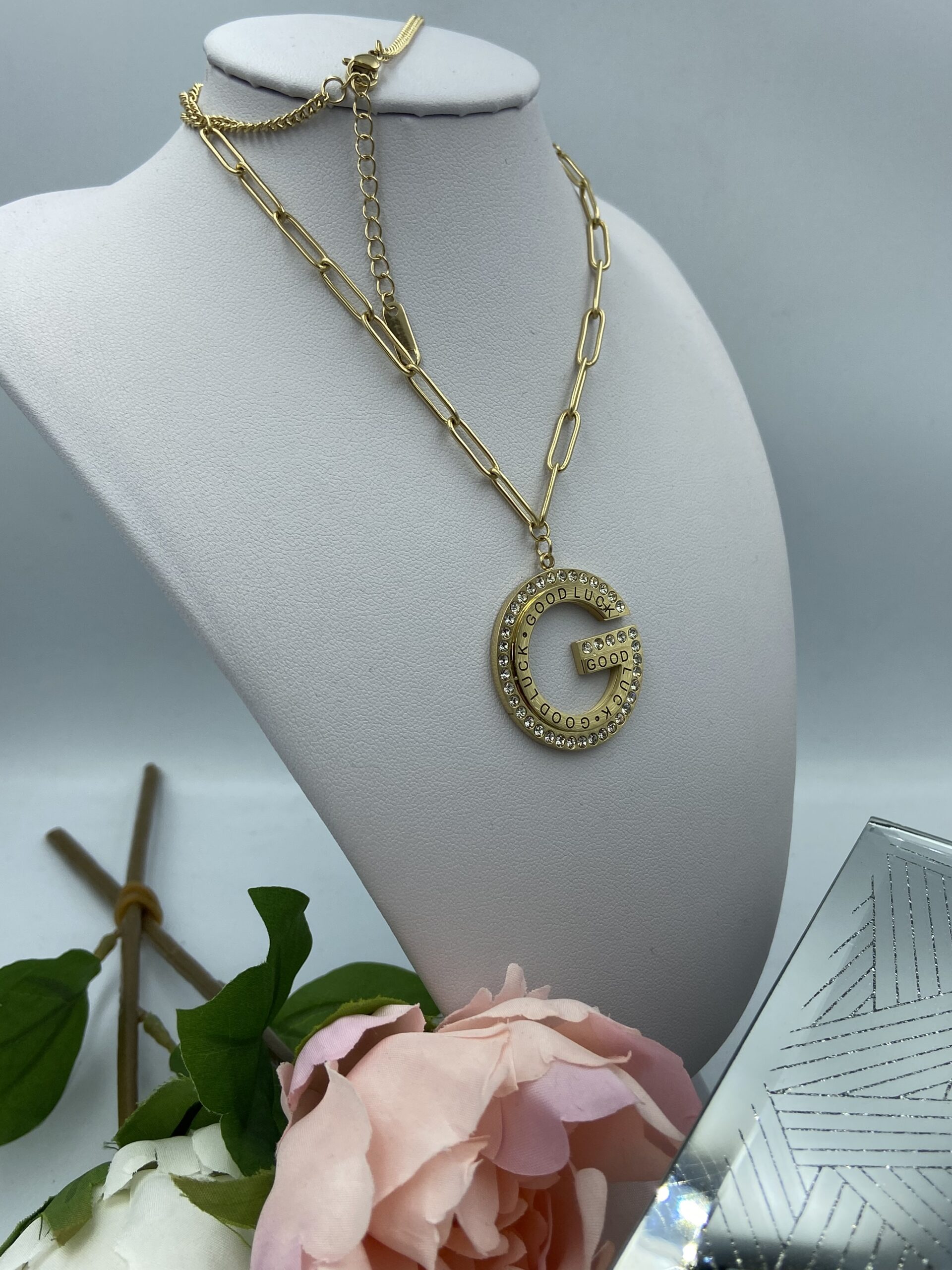 Naszyjnik celebrytka litera G z cyrkoniami. Połączenie dwóch splotów łańcuszka.