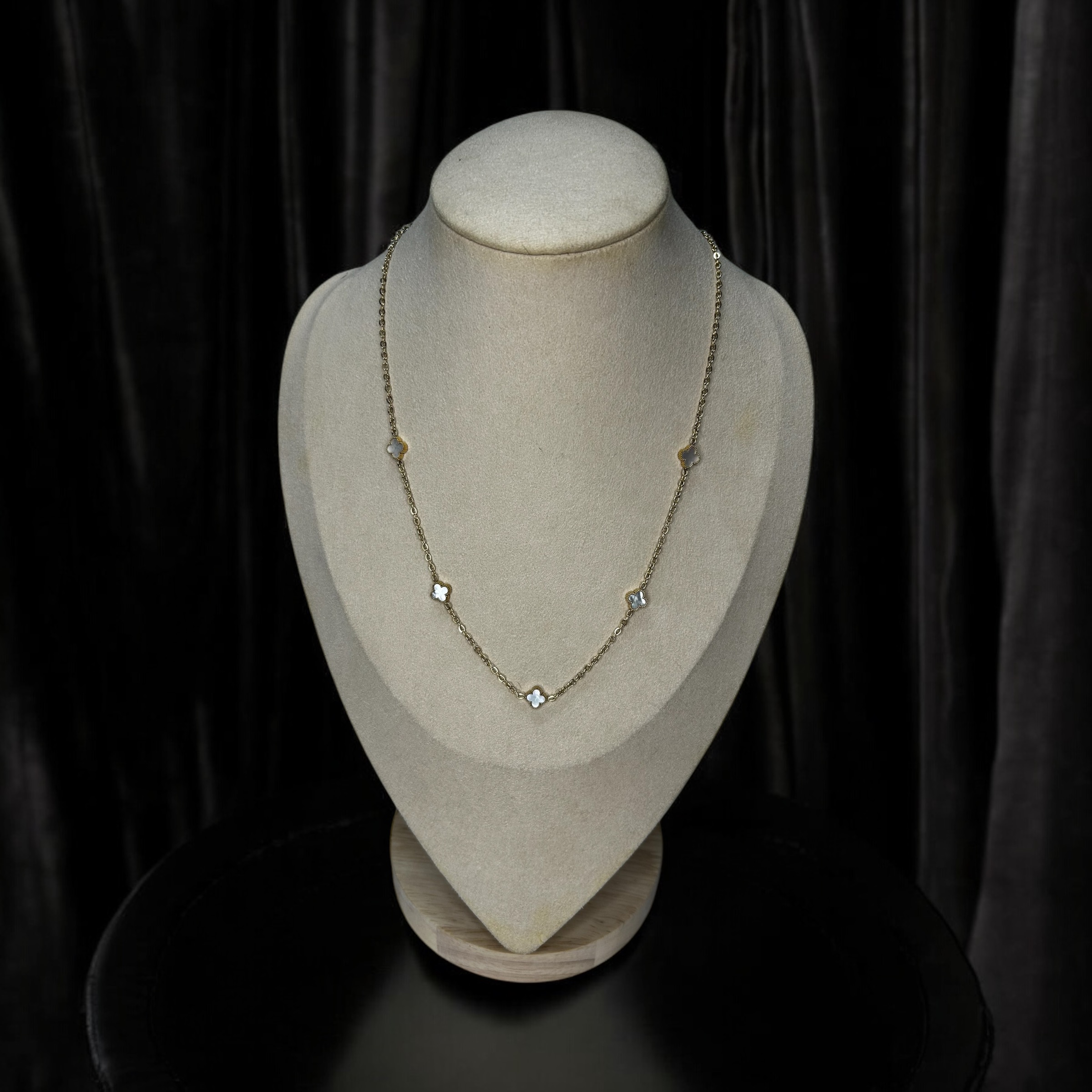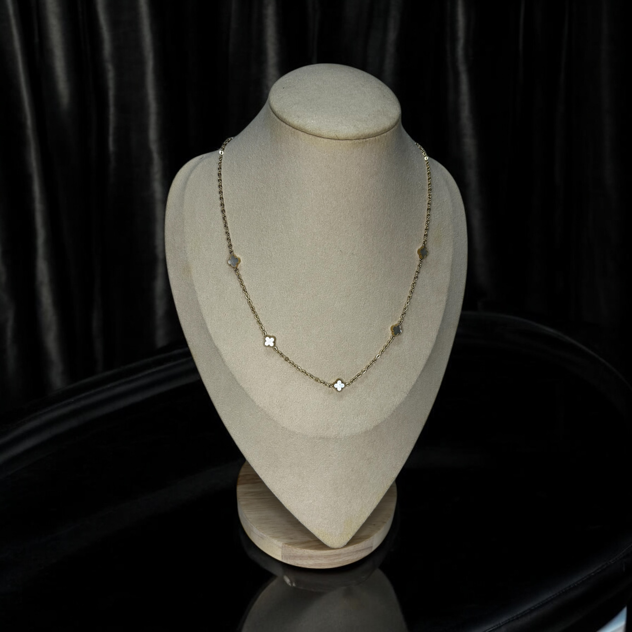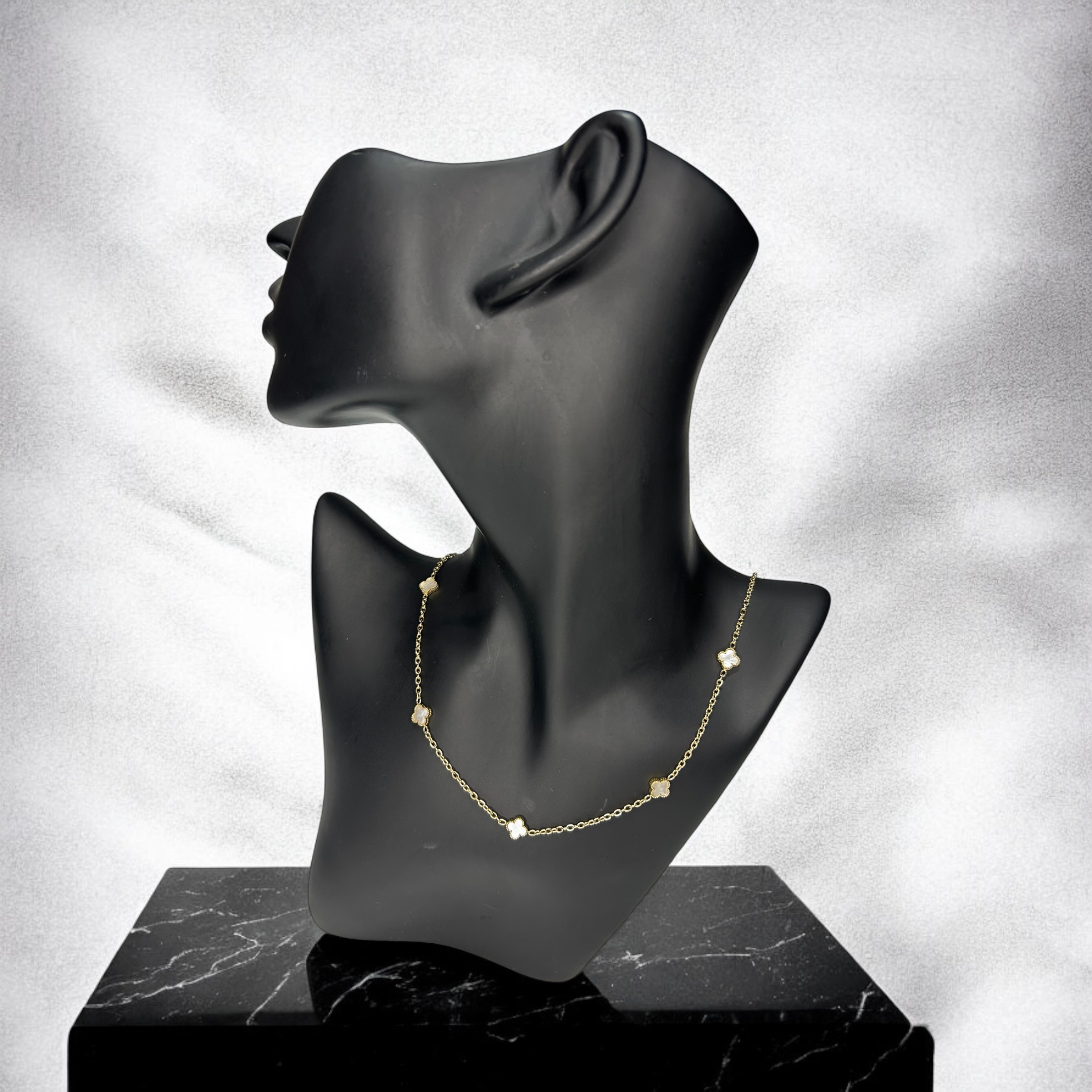 Piękny klasyczny łańcuszek z koniczynkami z masą perłową, kolor złoty.