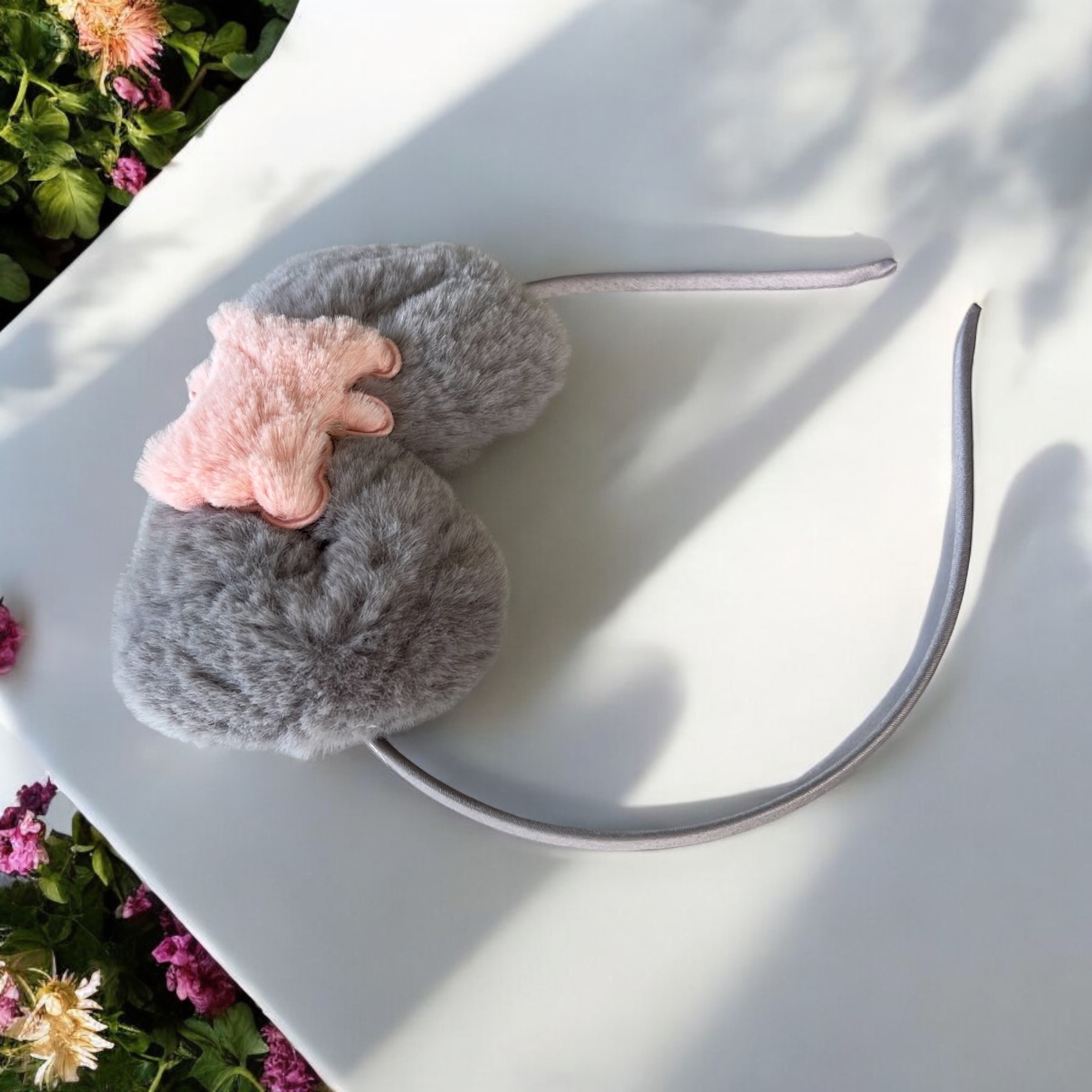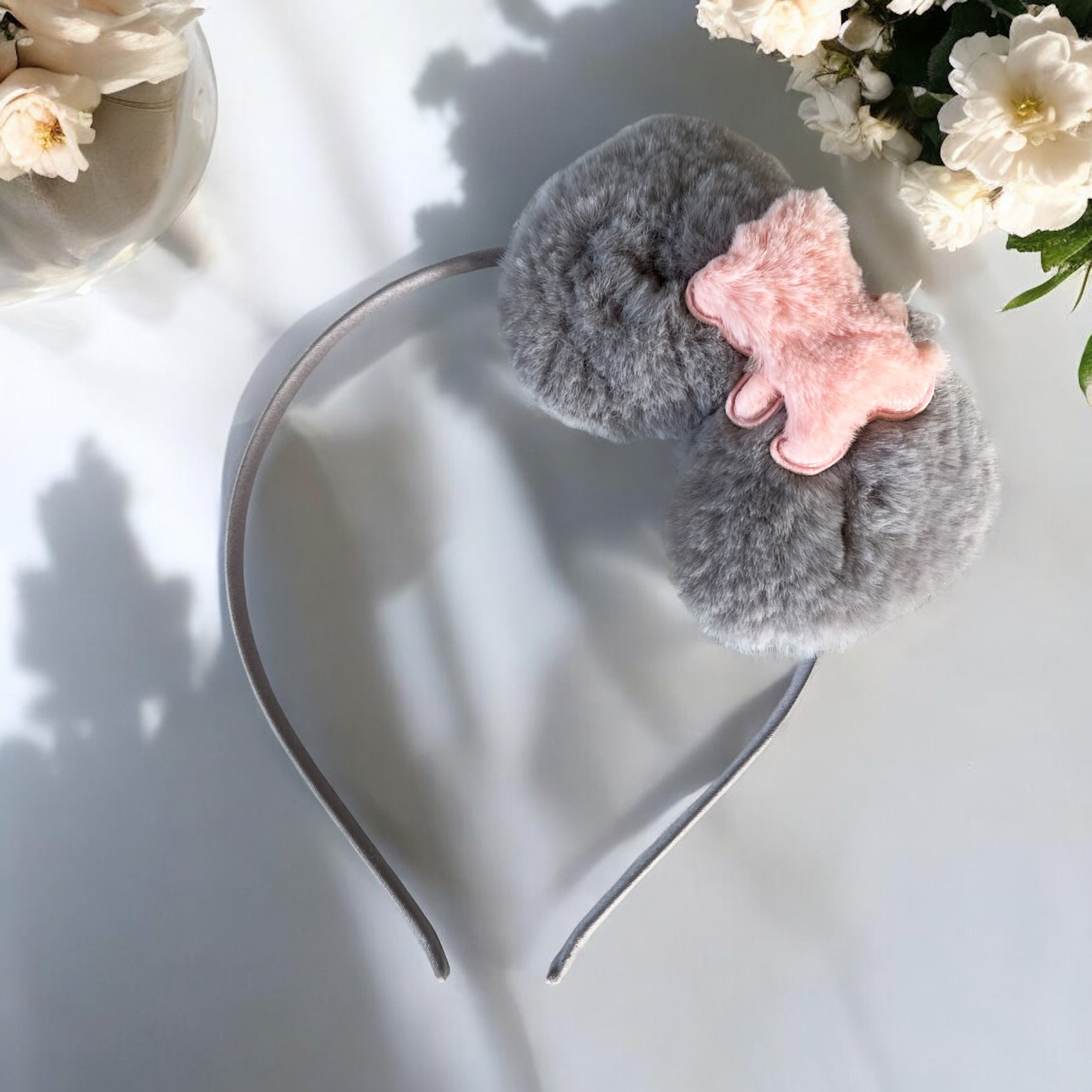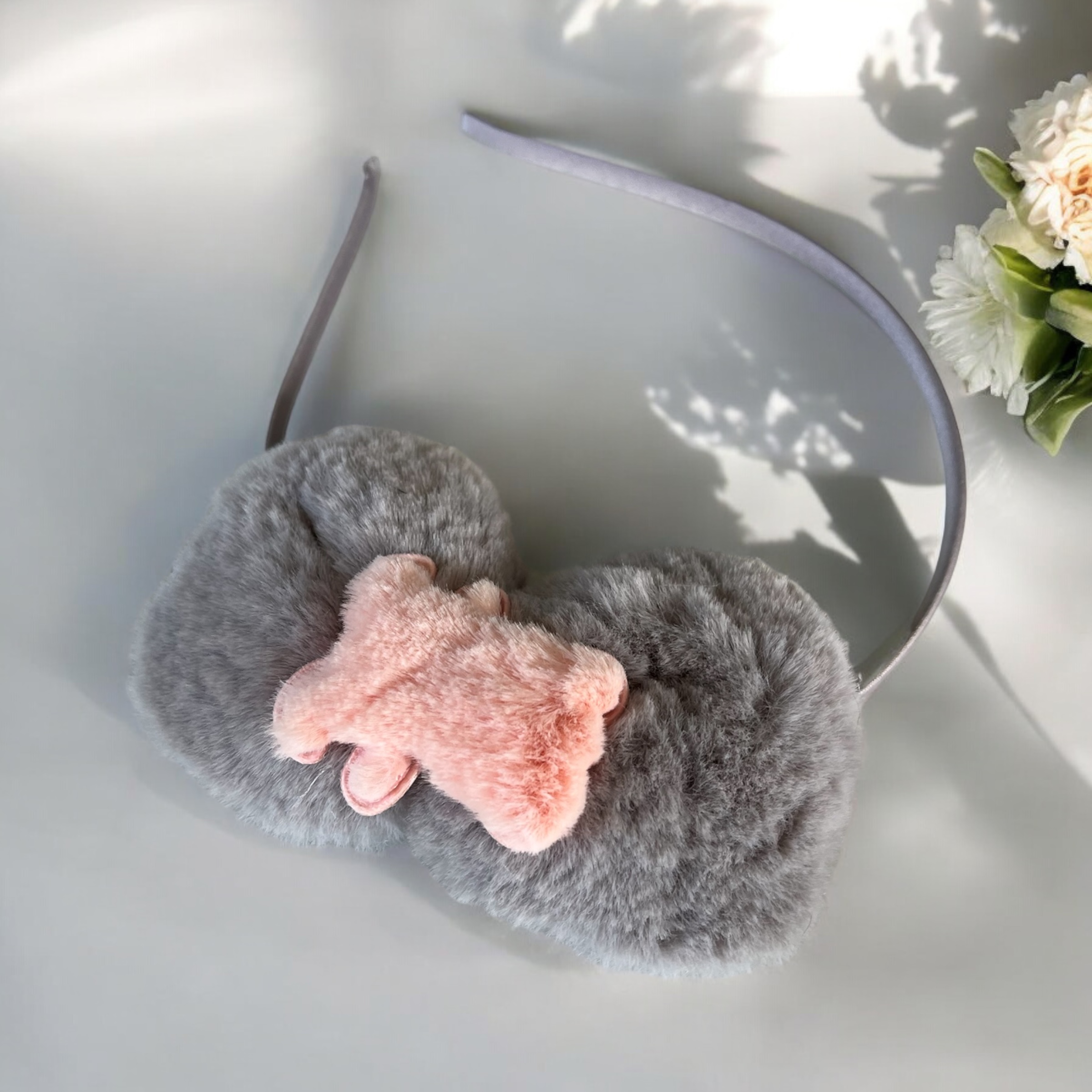 Dziewczęca opaska do włosów z kokardką z misiem w kolorze szarym.