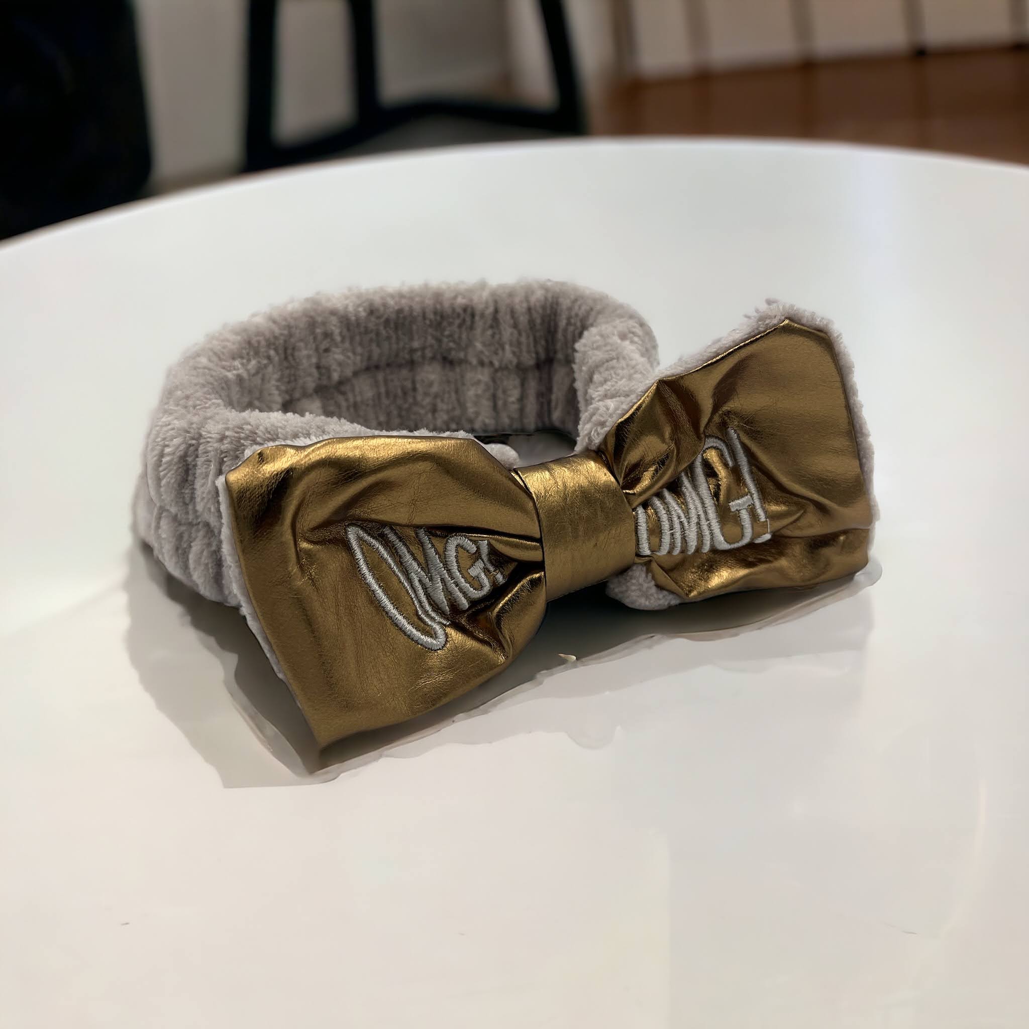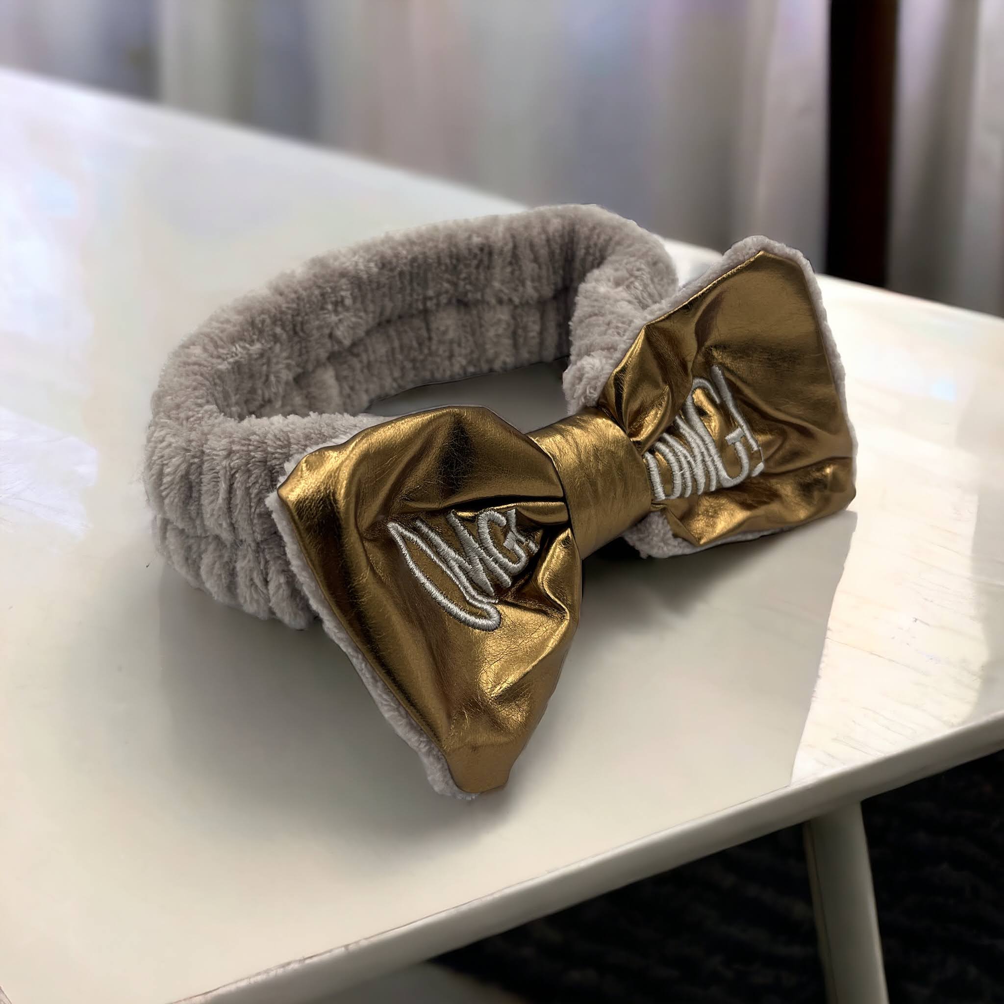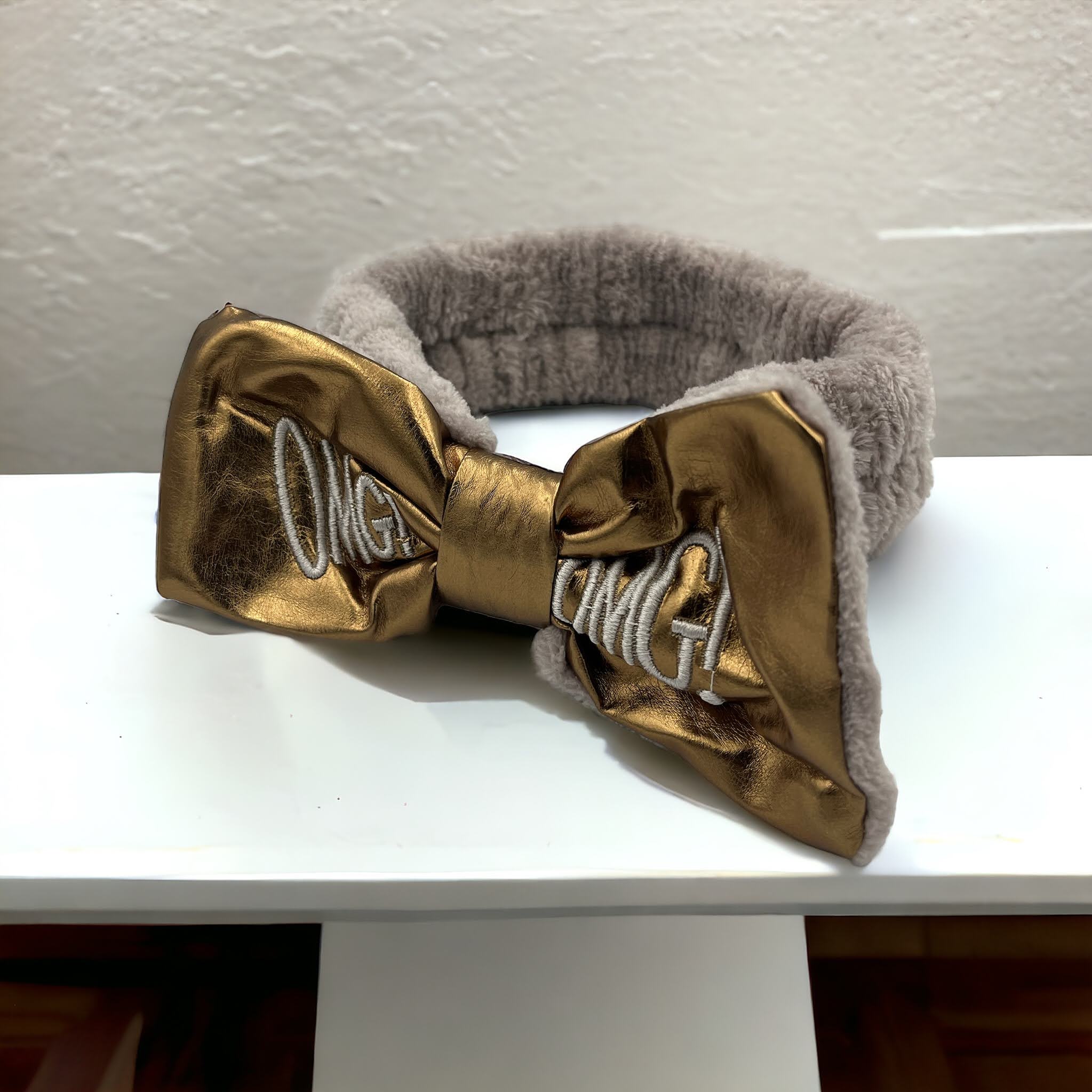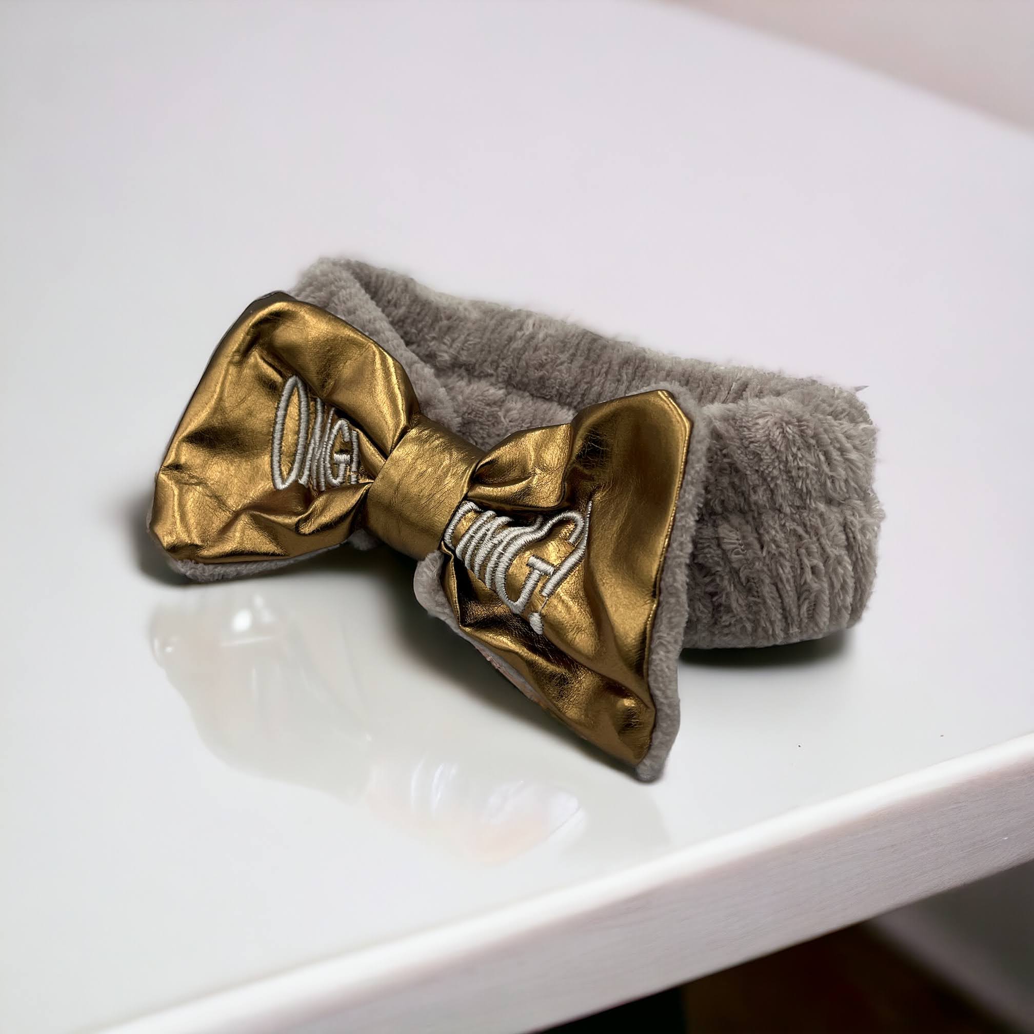 Kokardka z ekoskóry w kolorze złotym z haftem OMG!