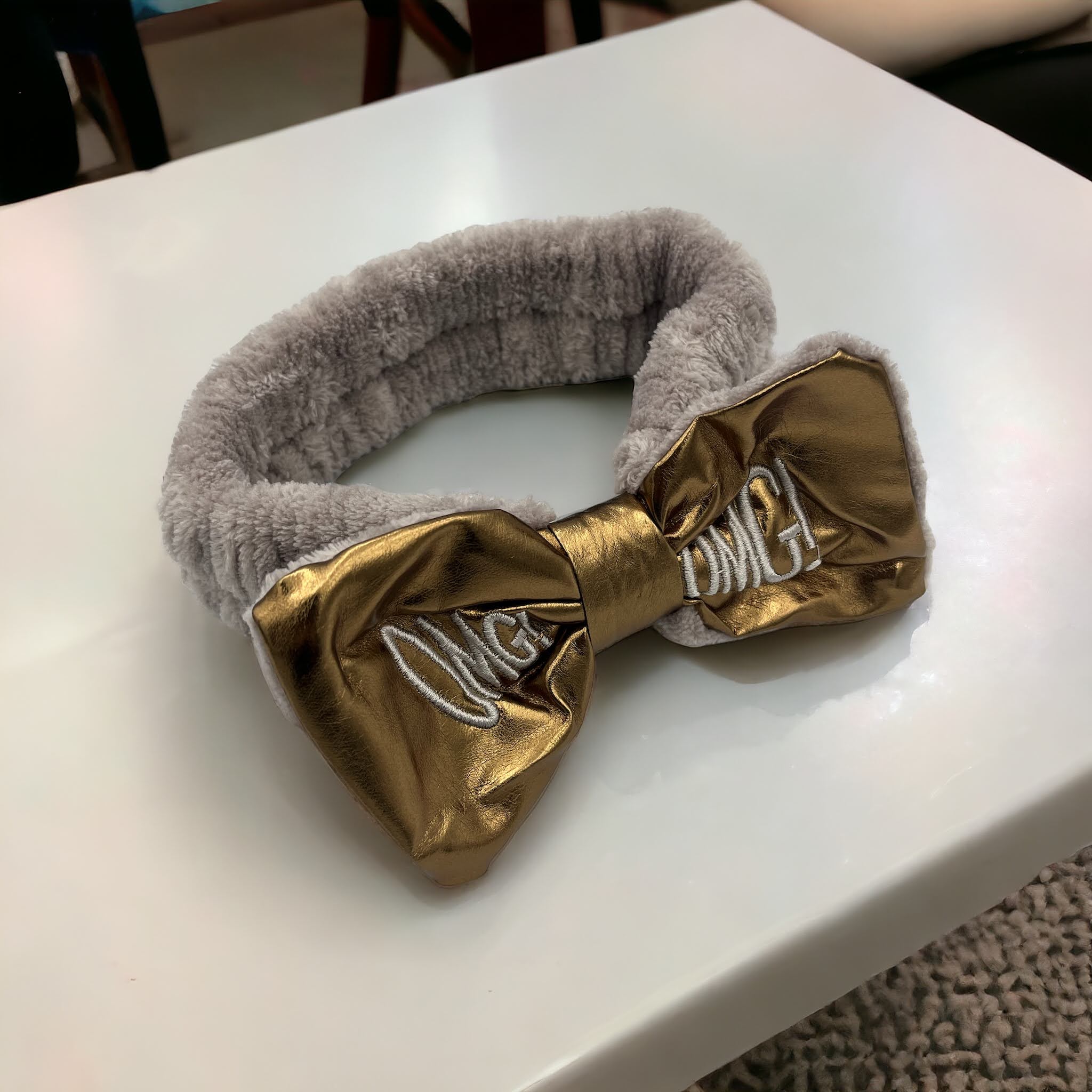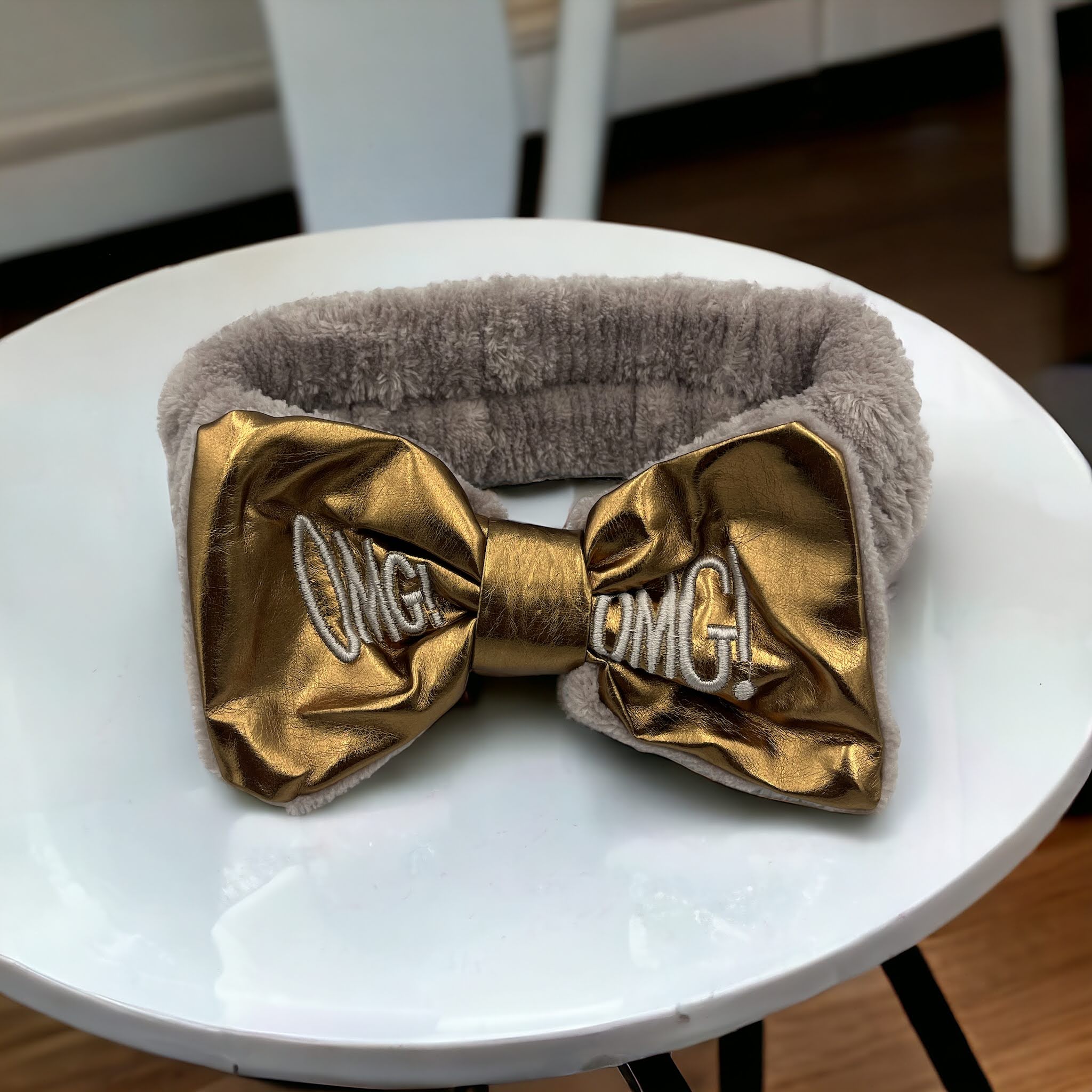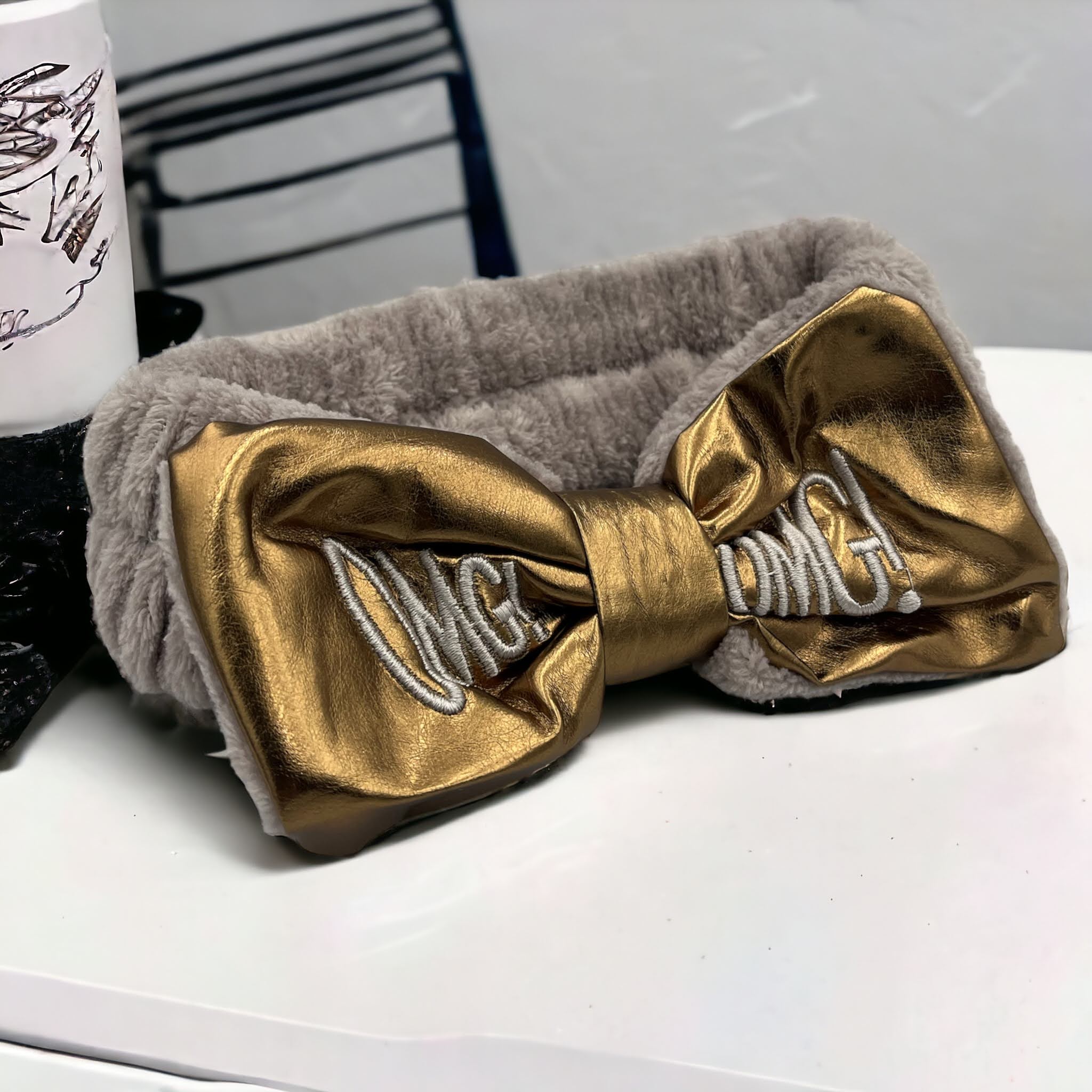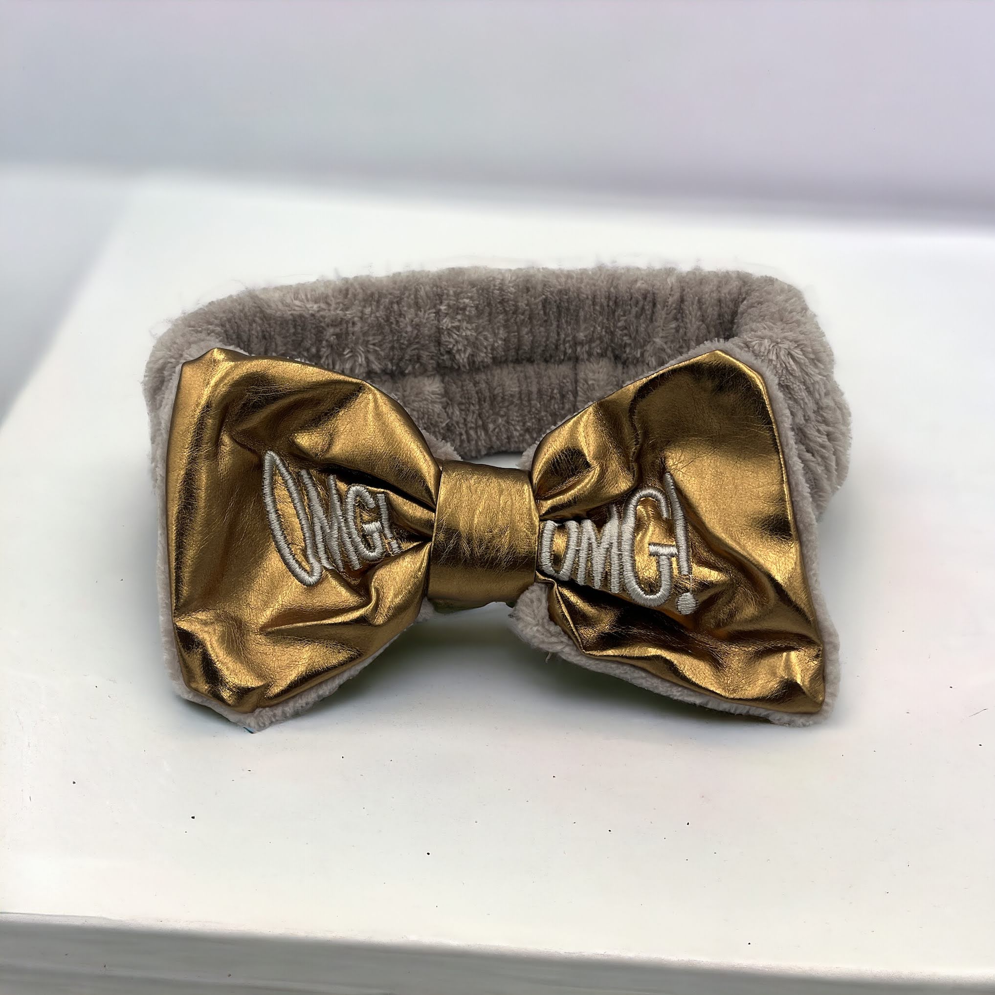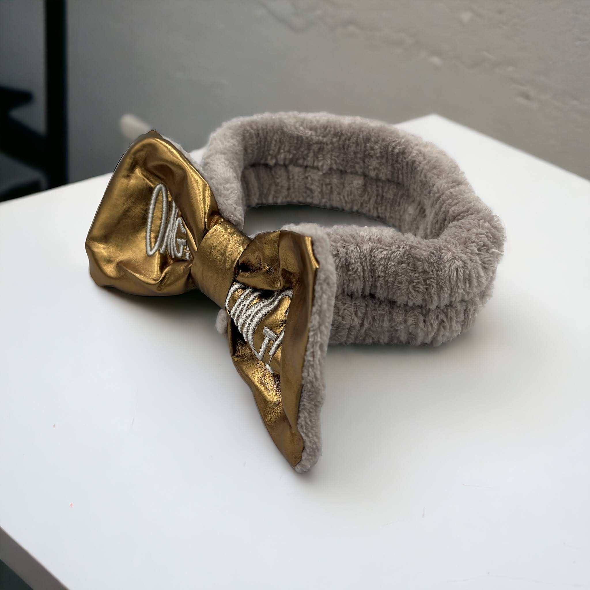 Kokardka z ekoskóry w kolorze złotym z haftem OMG!