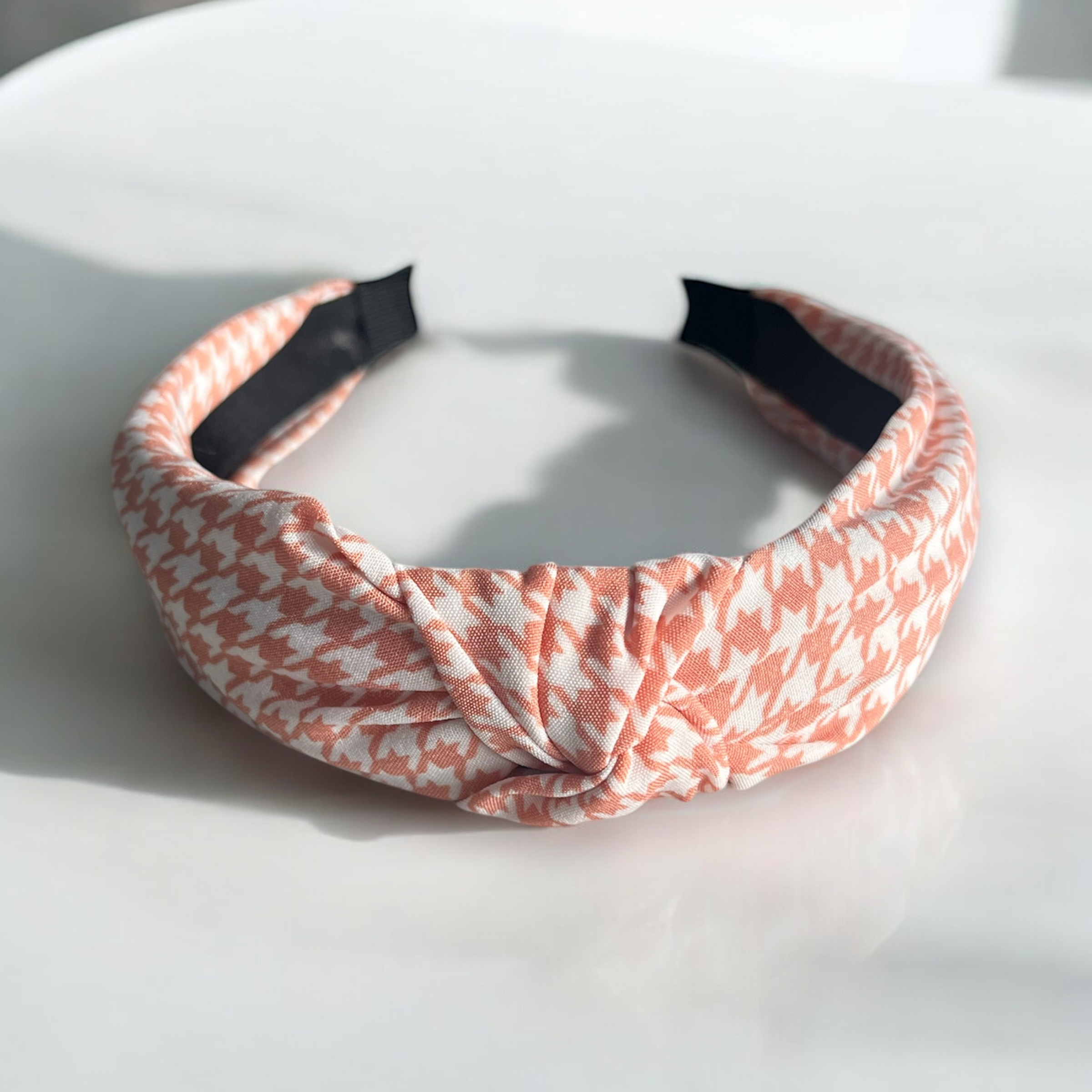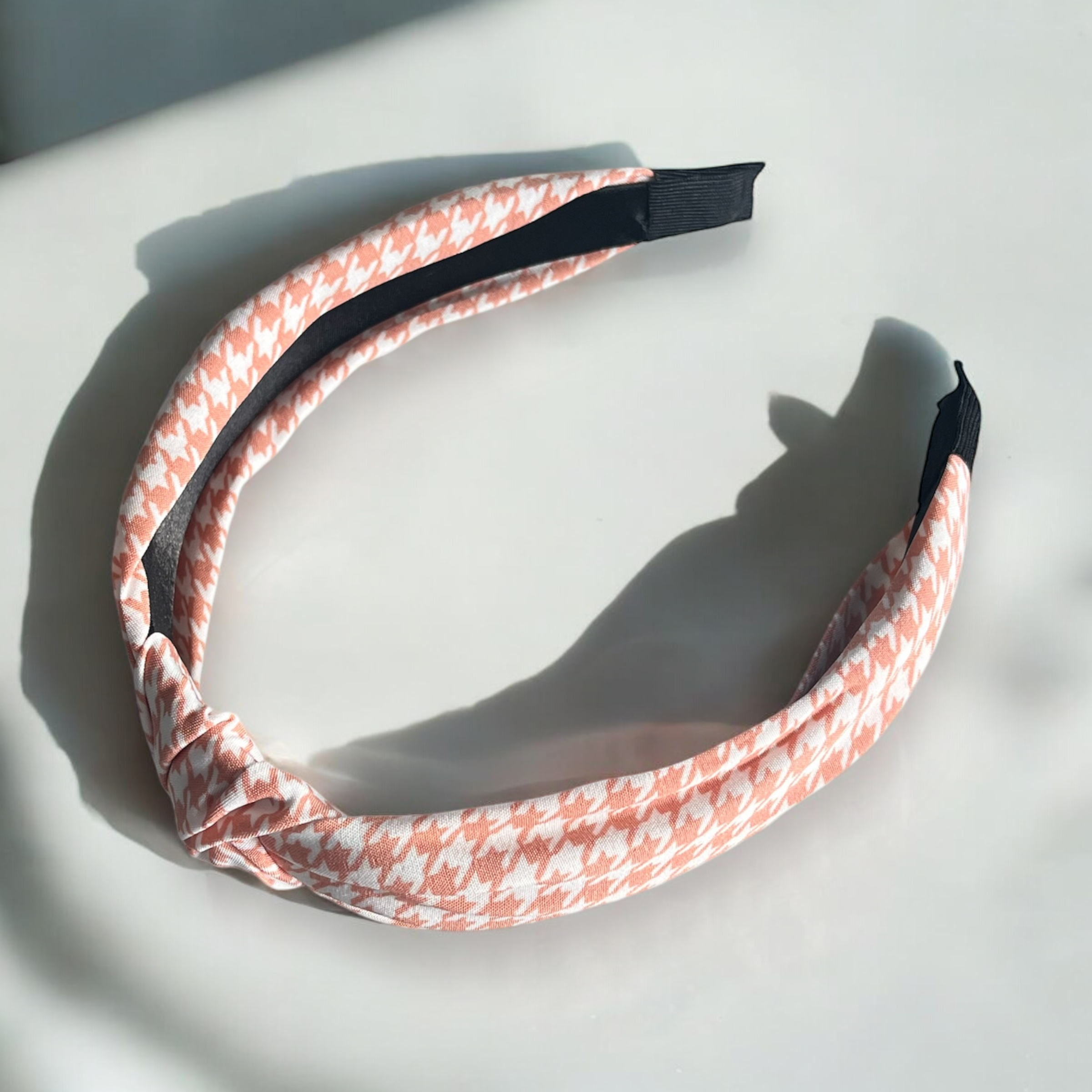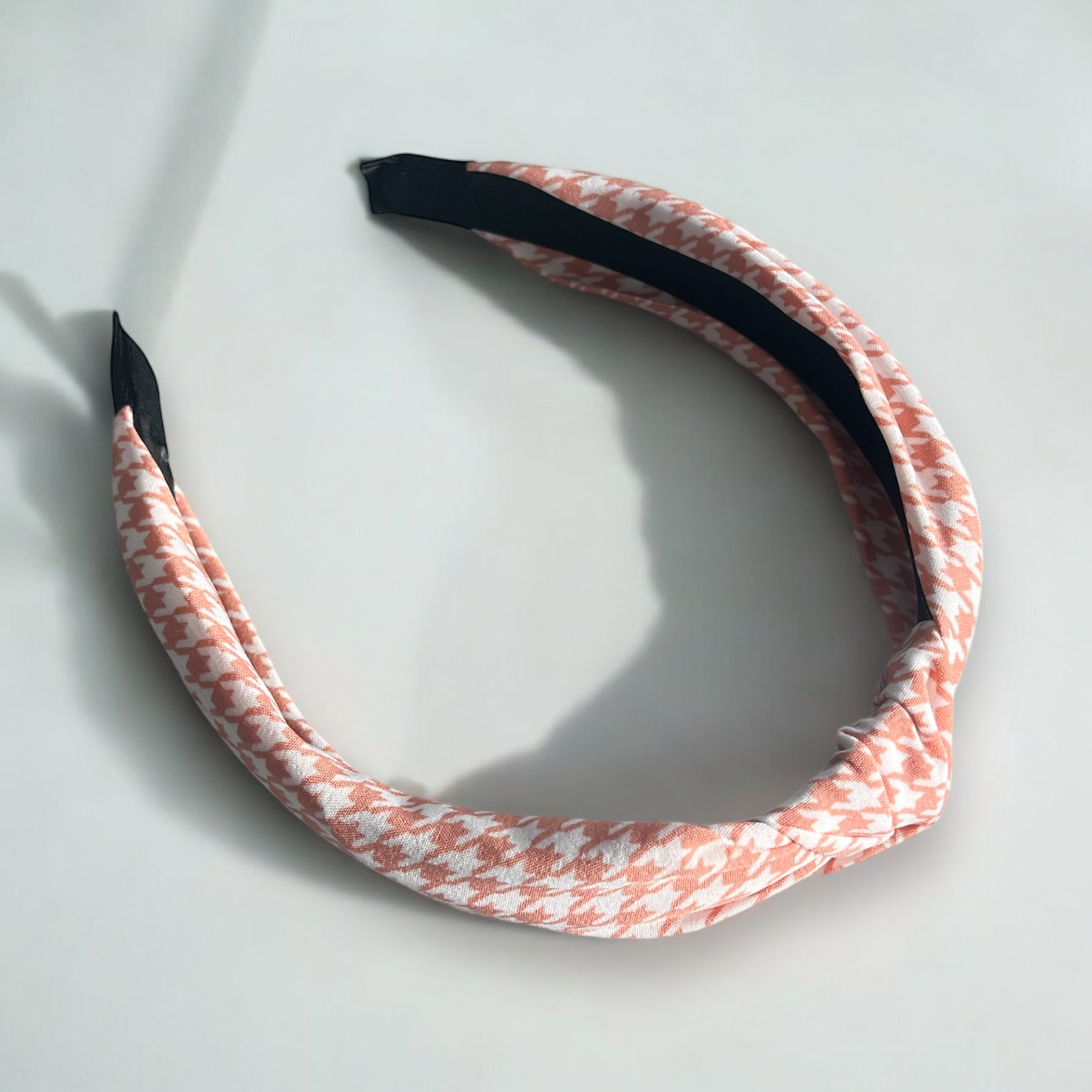 Opaska materiałowa w kolorze łososiowym w pepitkę.