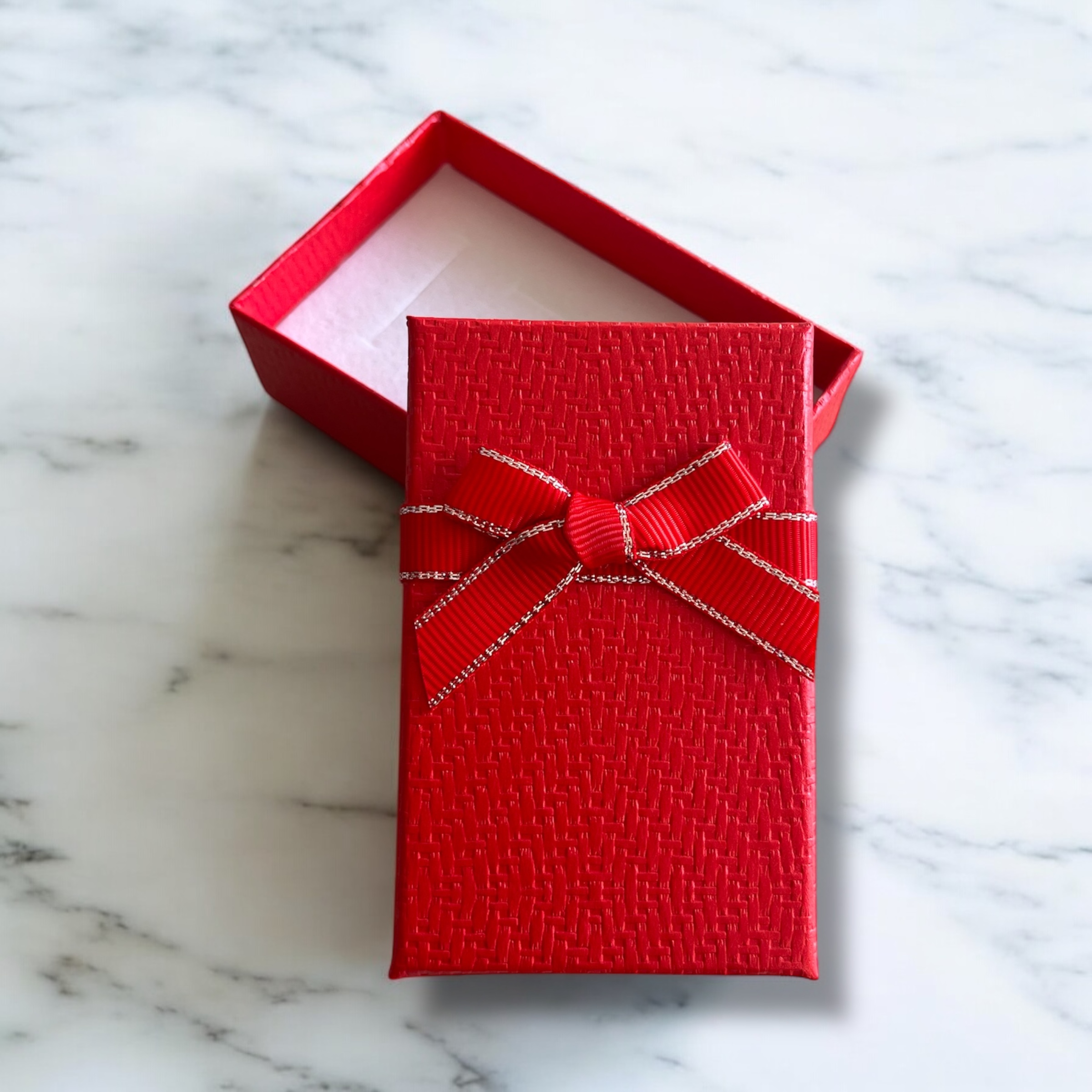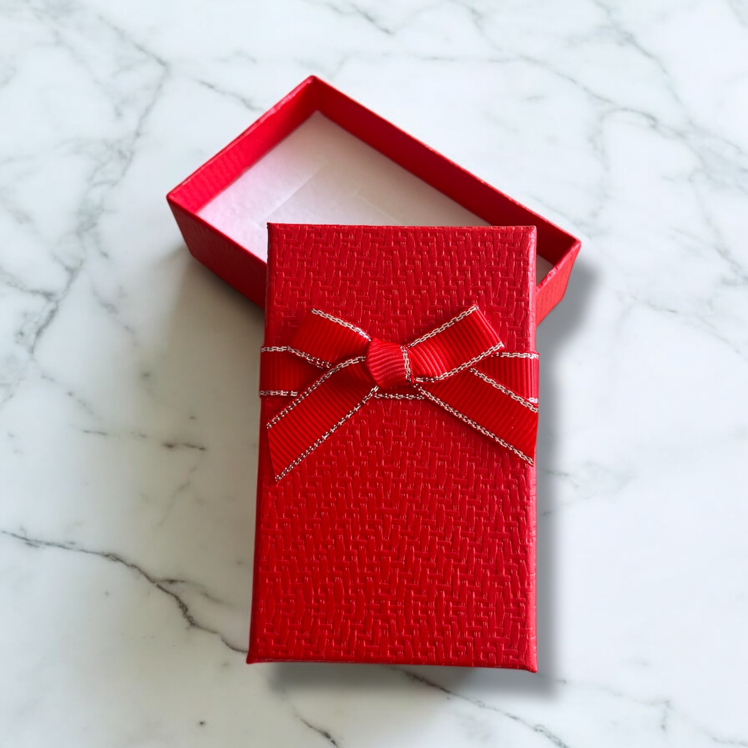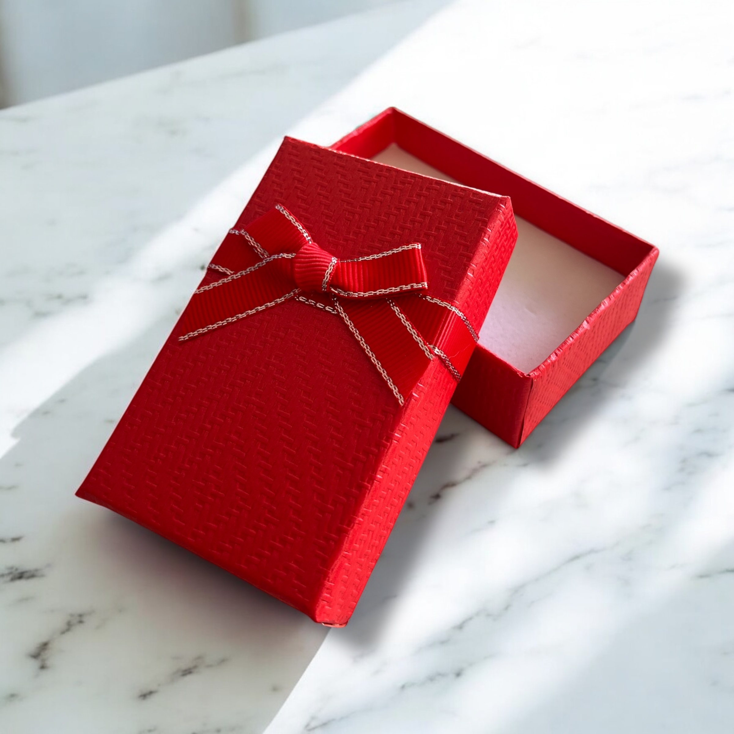 Pudełko prezentowe do zapakowania biżuterii w kolorze czerwonym z kokardką.