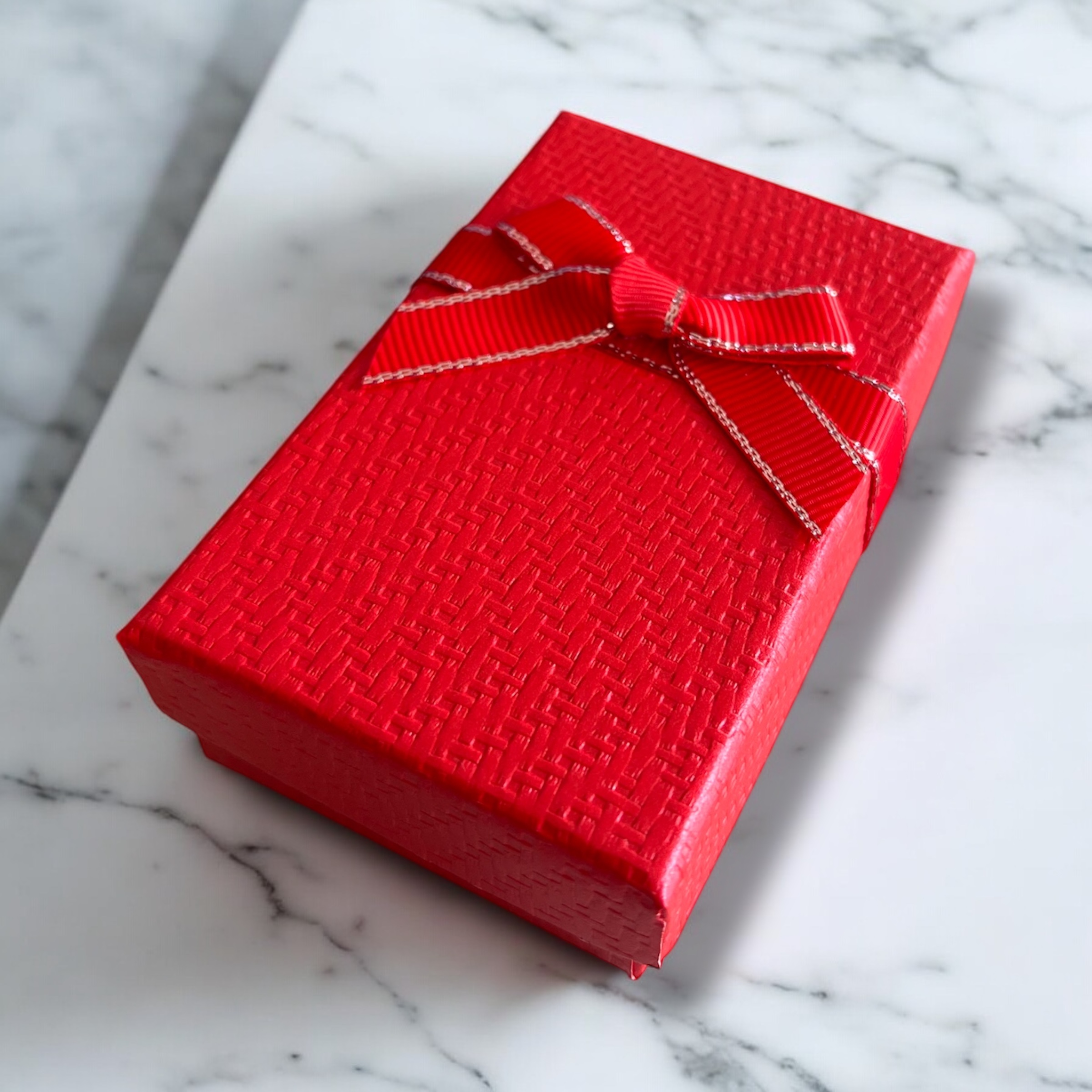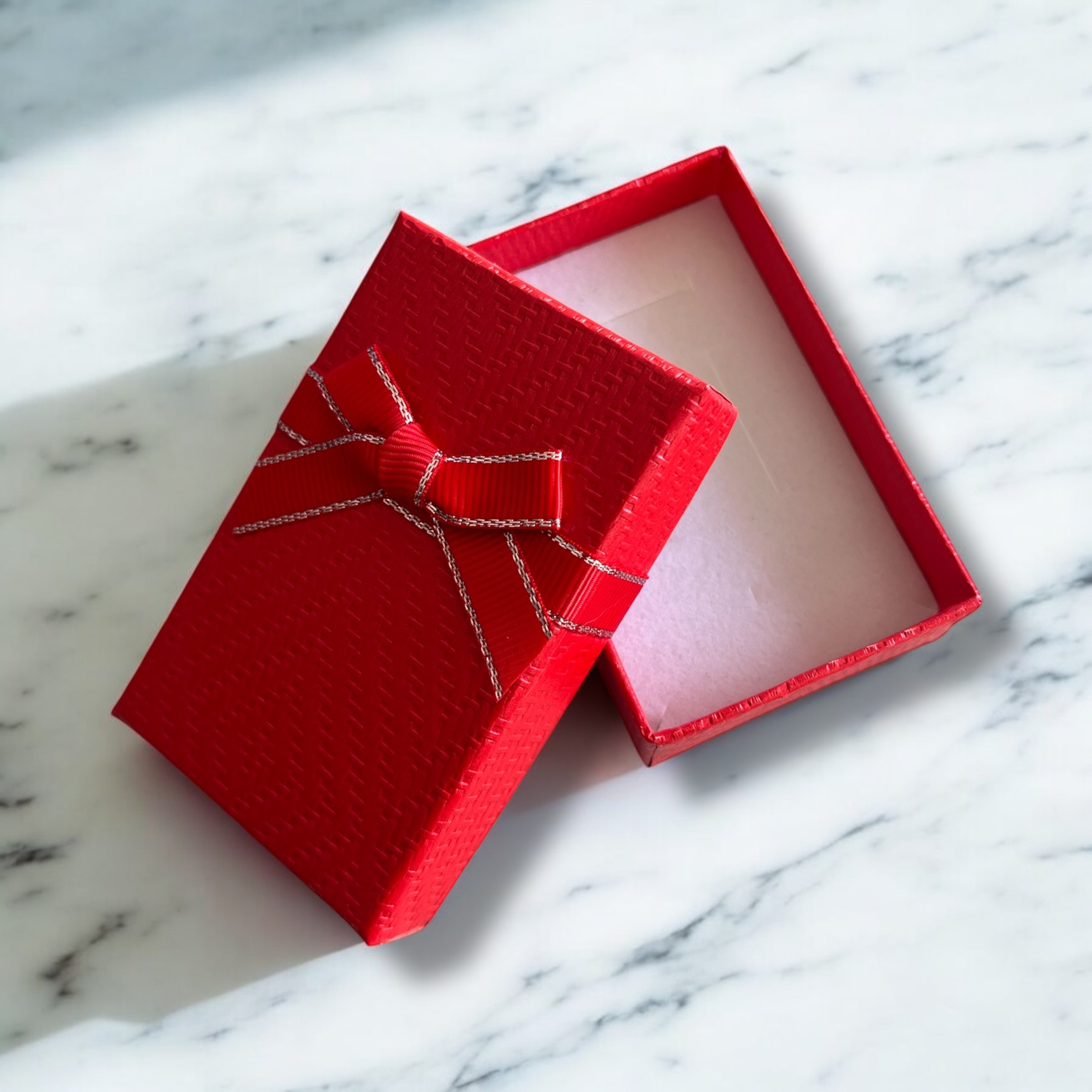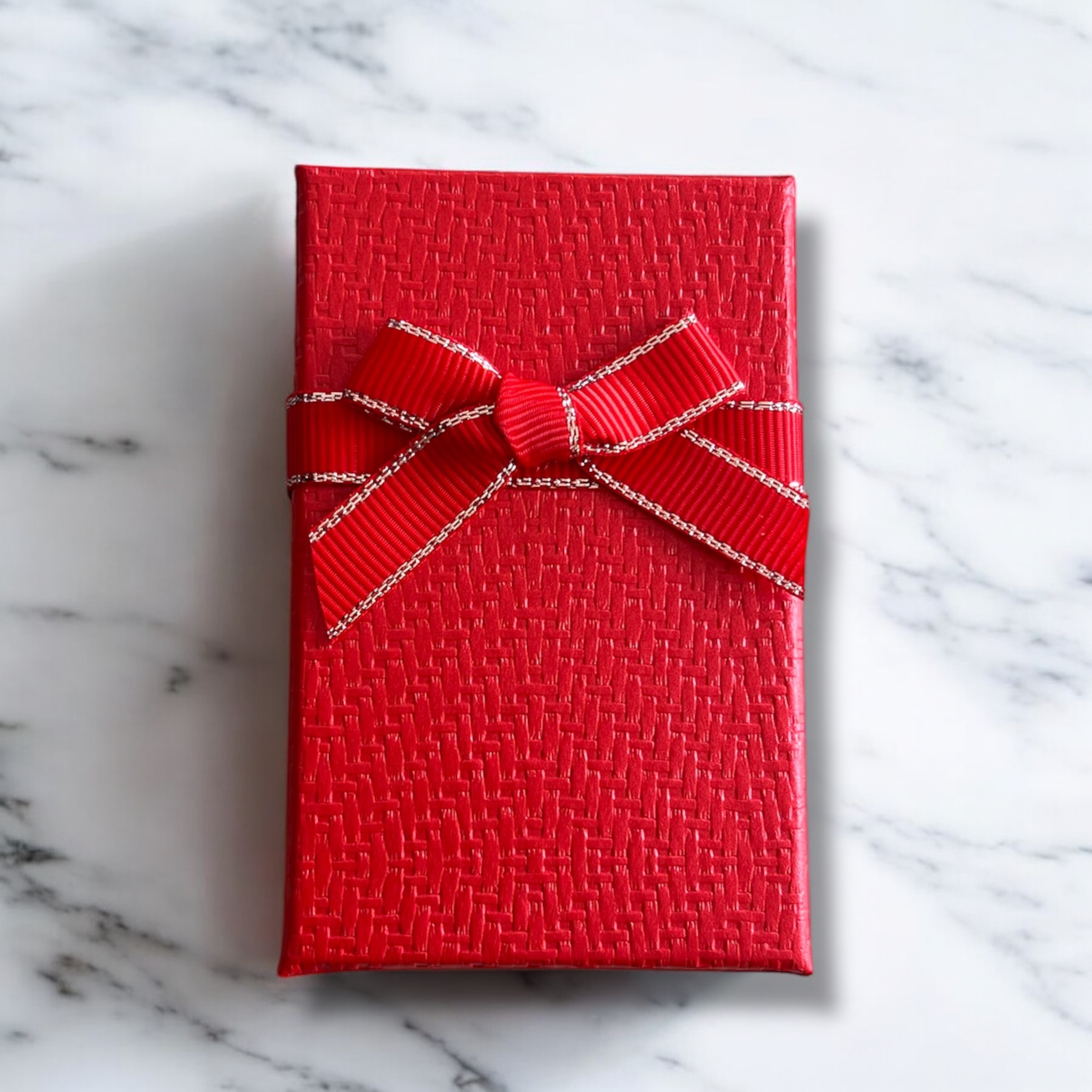 Pudełko prezentowe do zapakowania biżuterii w kolorze czerwonym z kokardką.