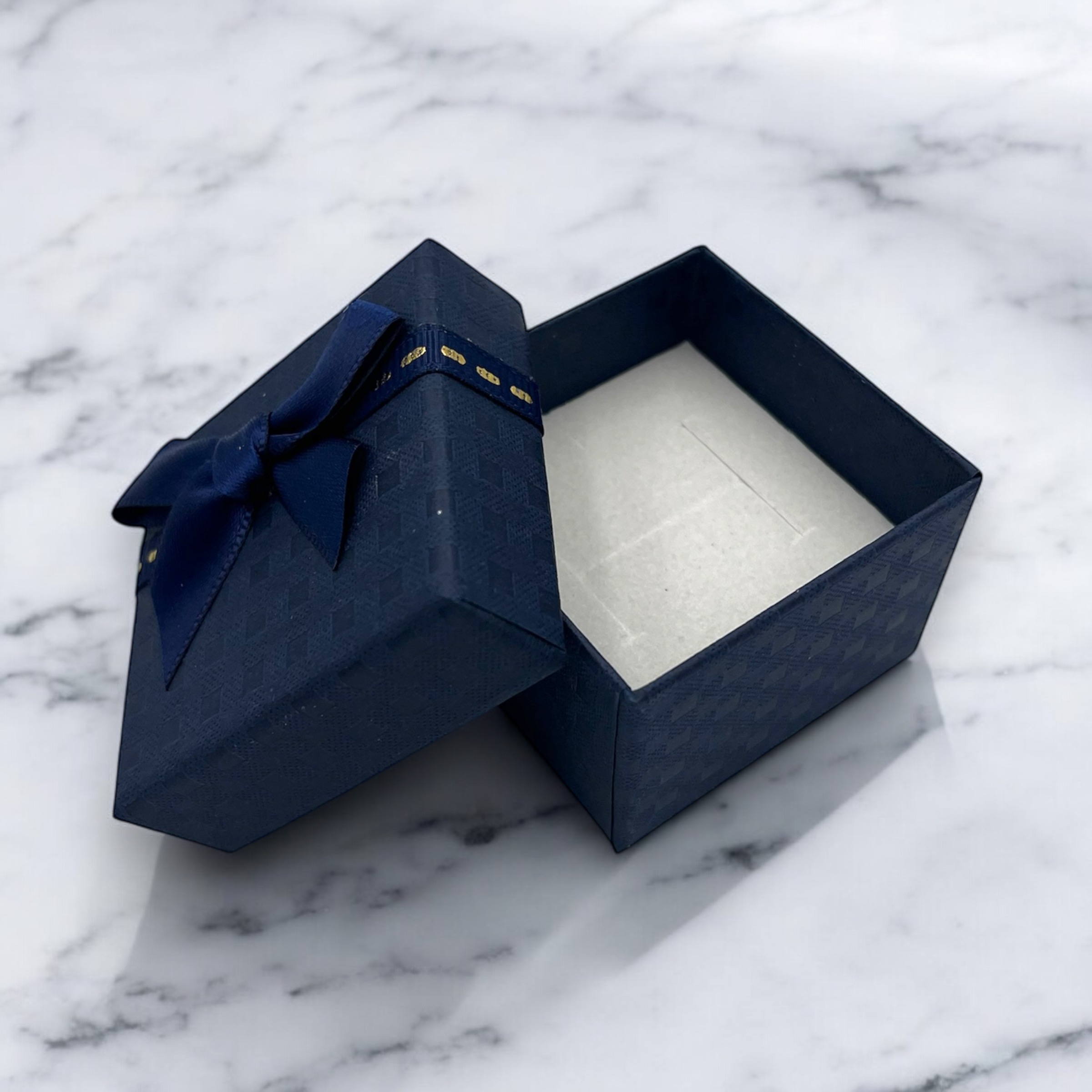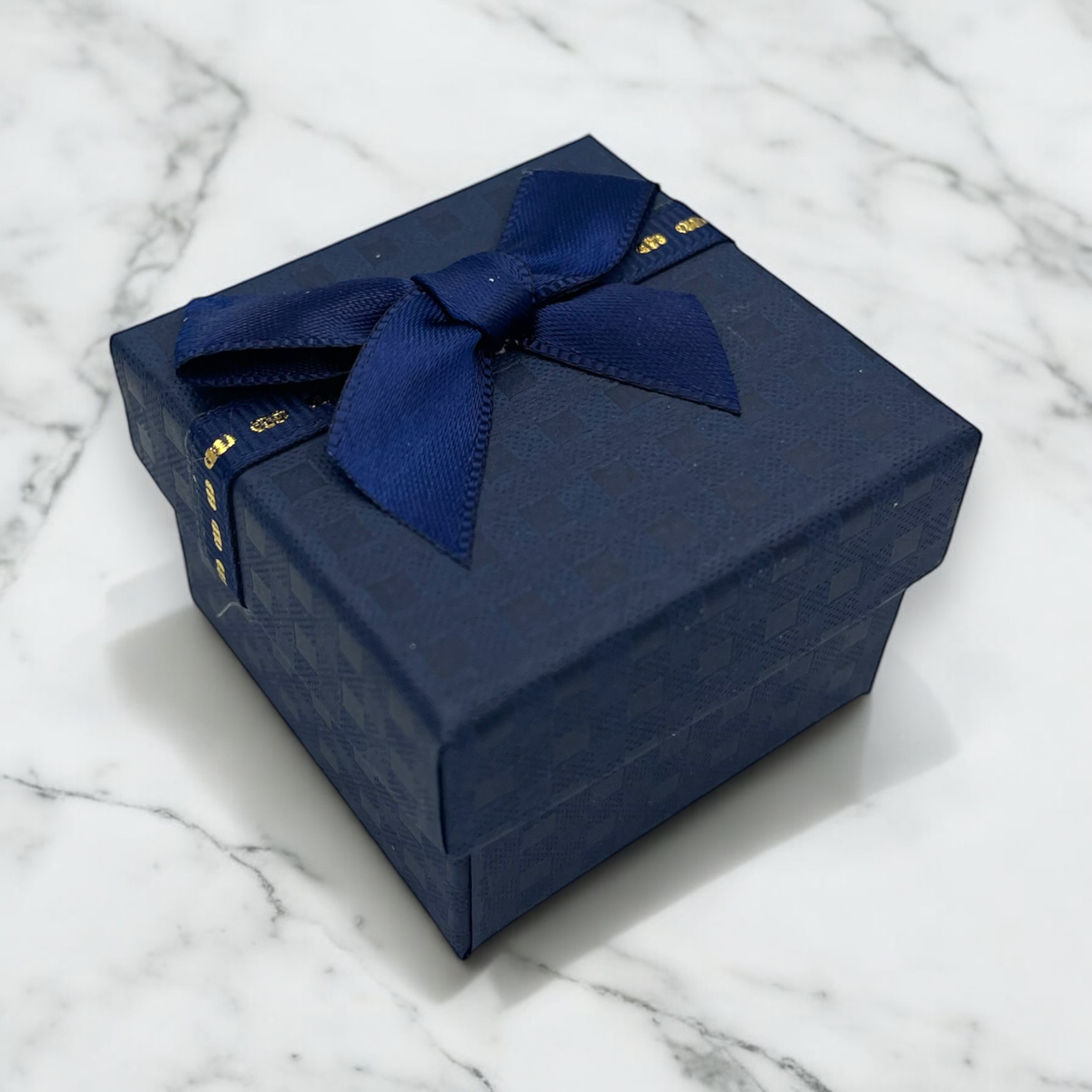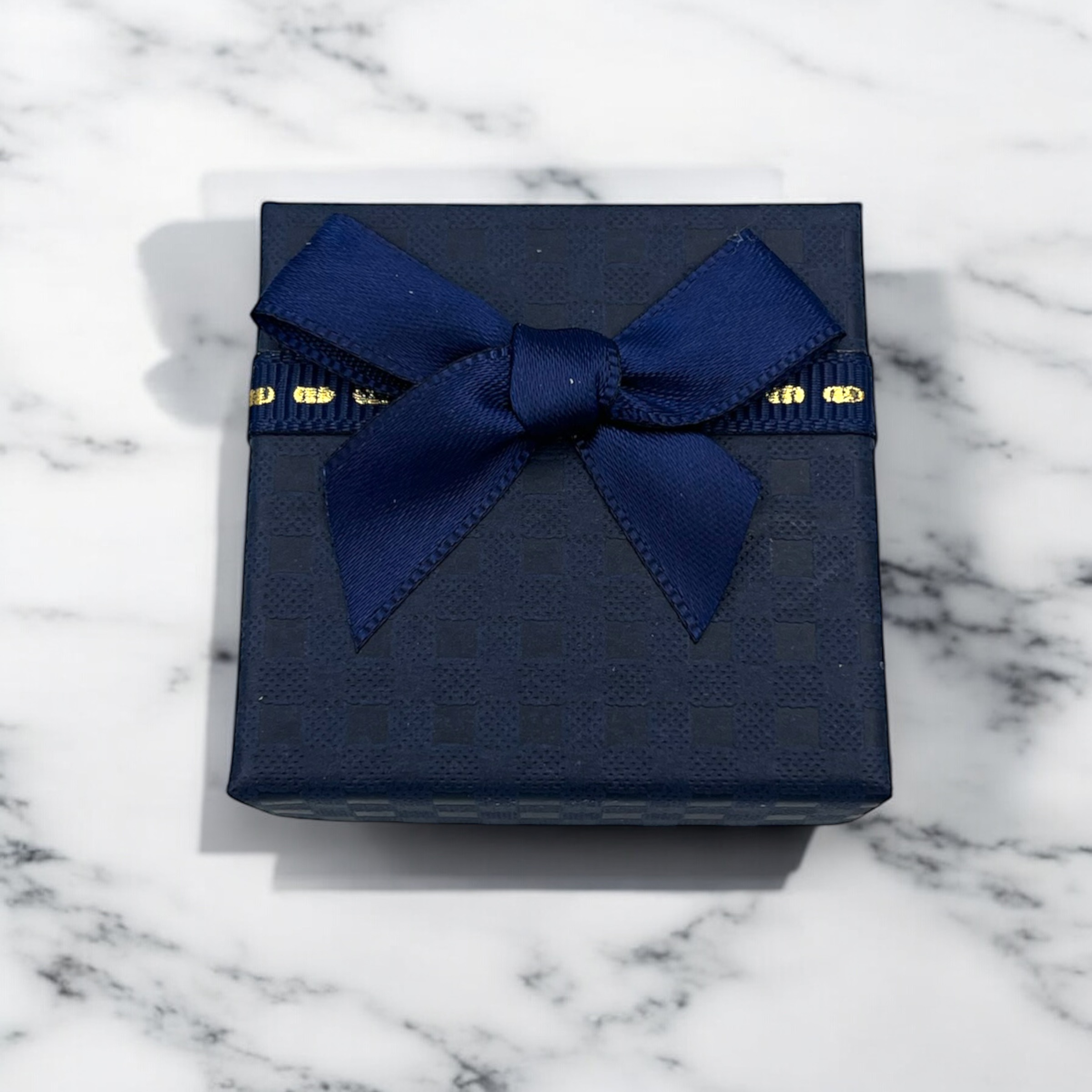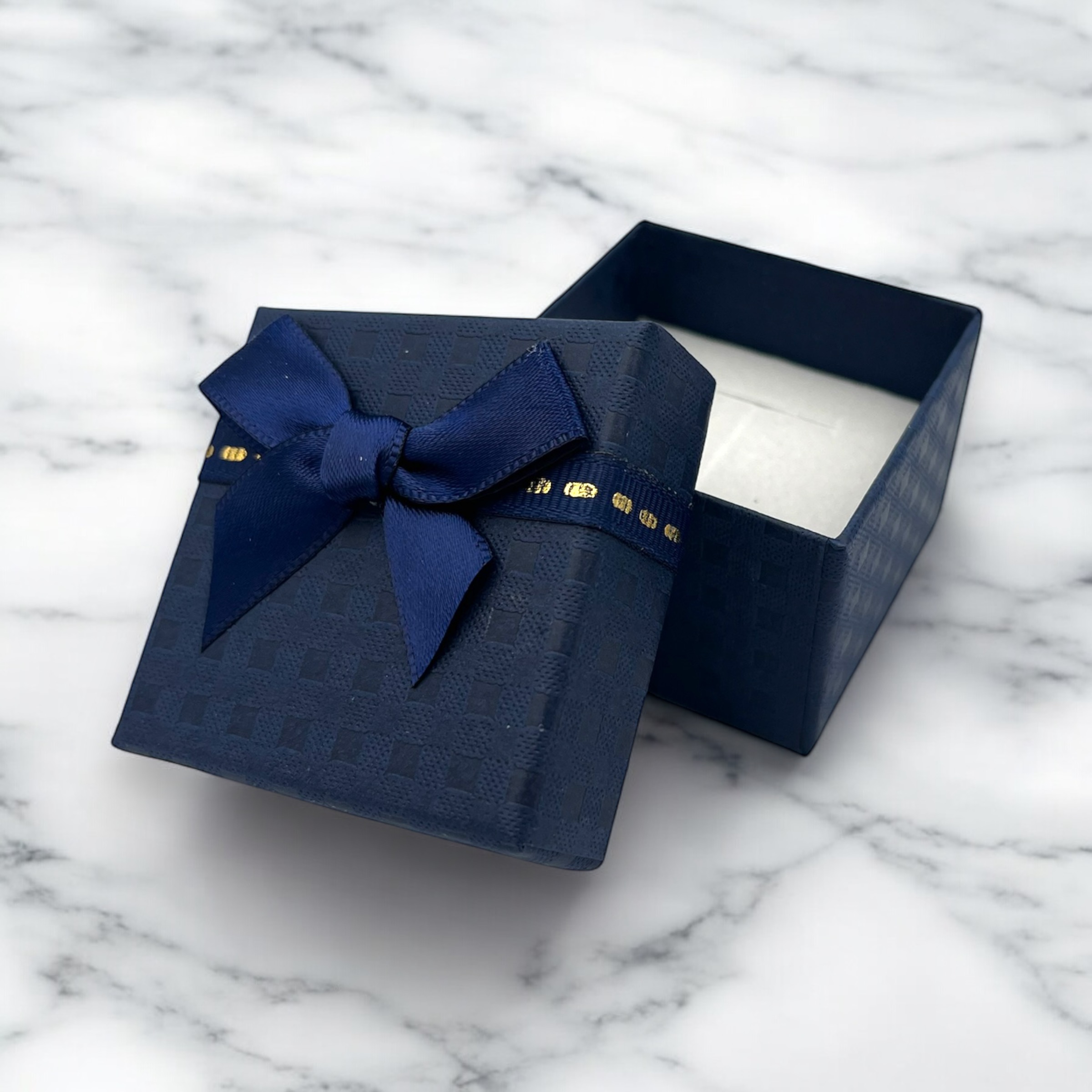 Pudełko prezentowe do zapakowania biżuterii w kolorze granatowym z kokardką.