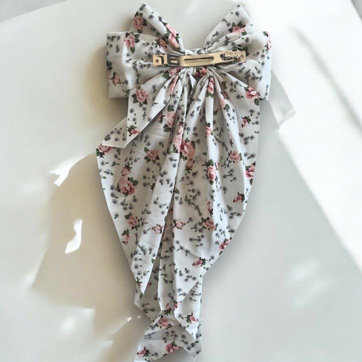 Spinka do włosów typu klamra, kremowa kokarda w drobne, kolorowe kwiatuszki.