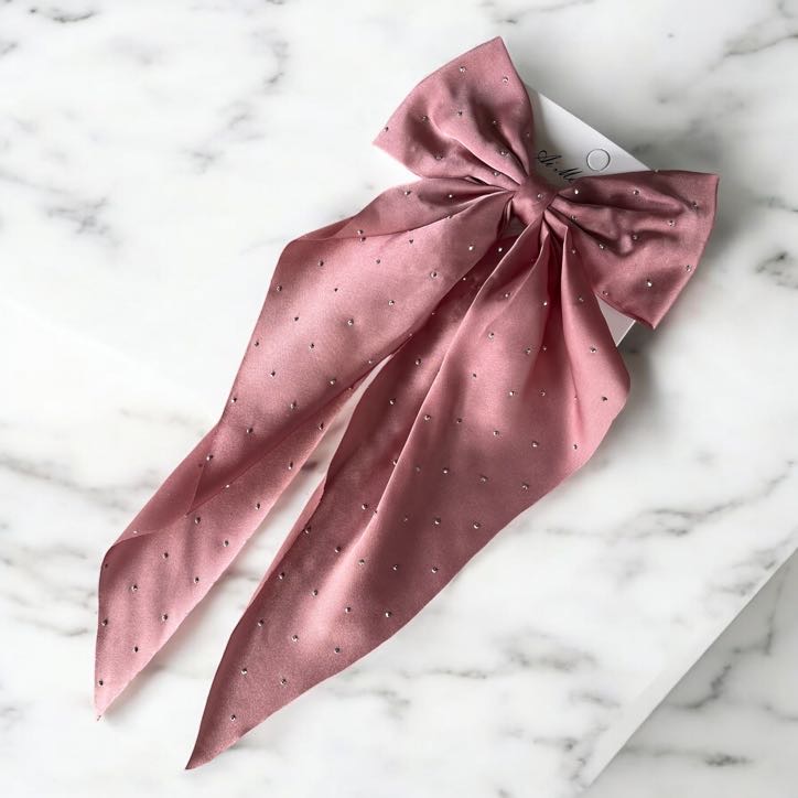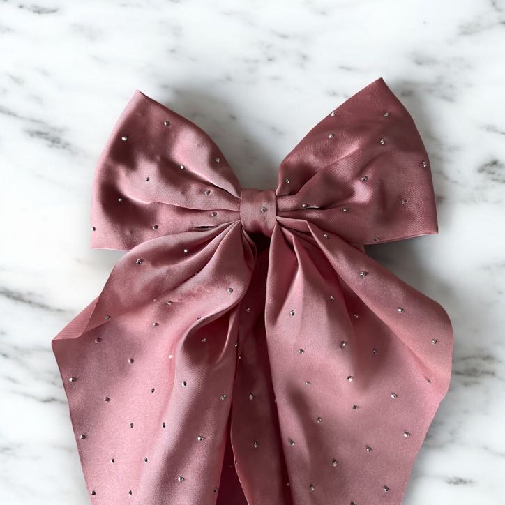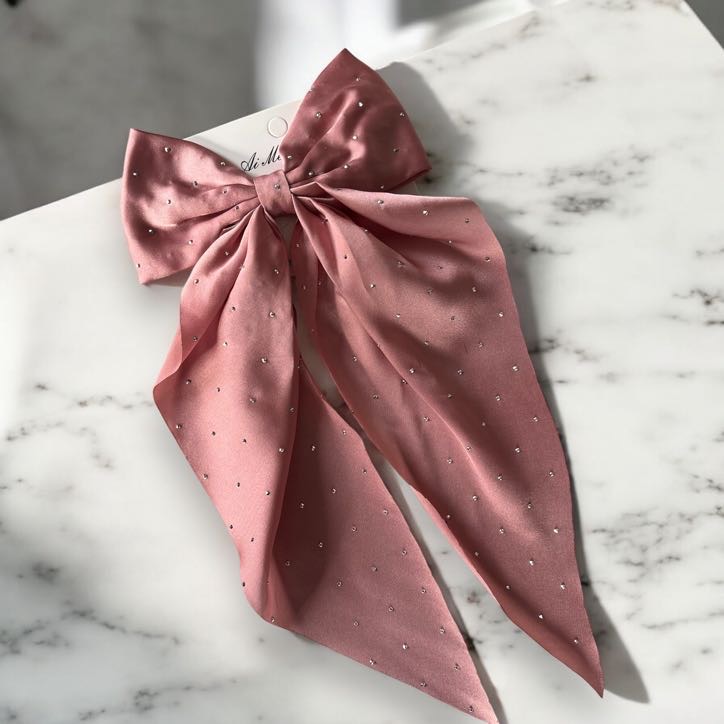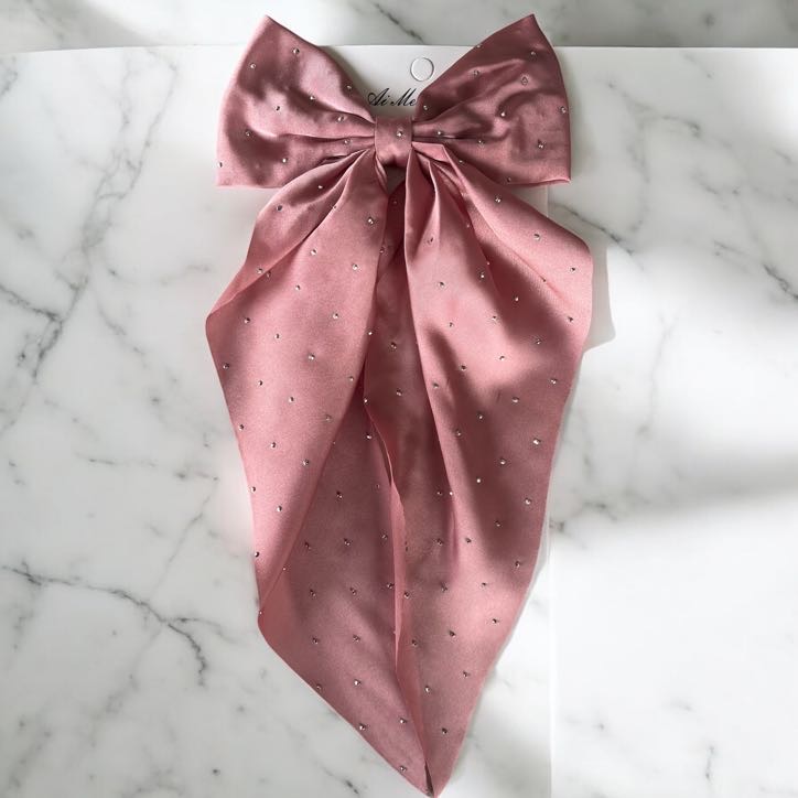 Spinka do włosów typu wsuwka, duża kokarda z satyny w kolorze różowym z dżetami.