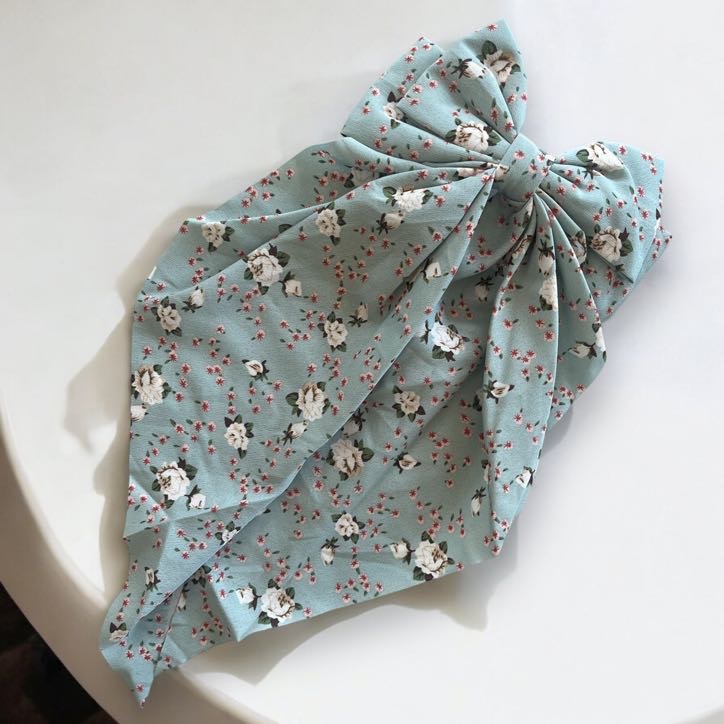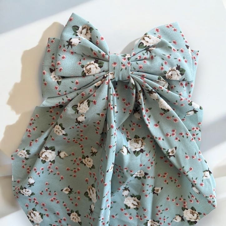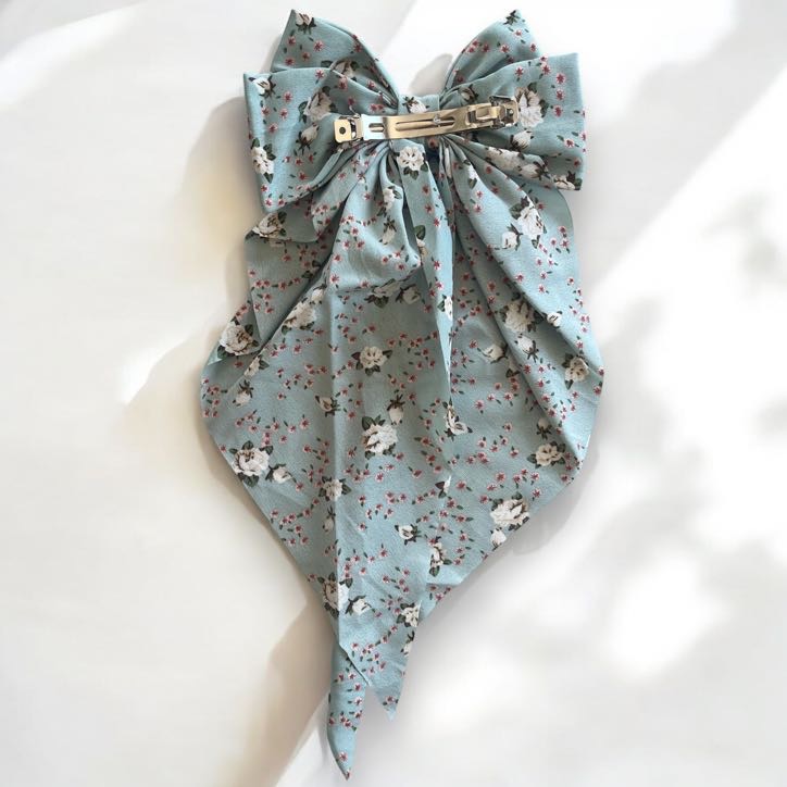 Spinka do włosów typu klamra, seledynowa kokarda w drobne, kolorowe kwiatuszki.