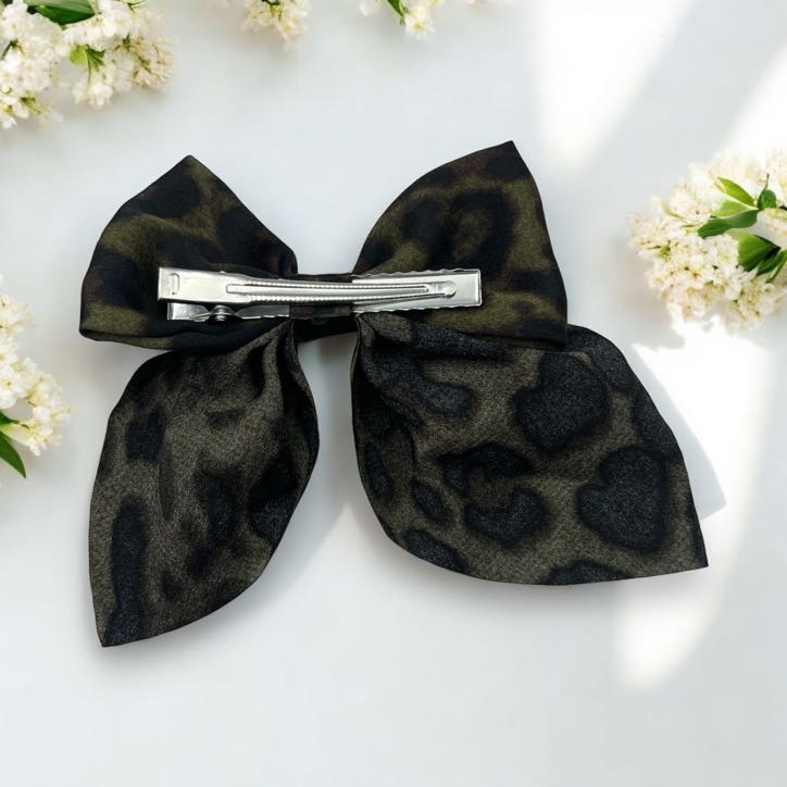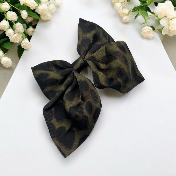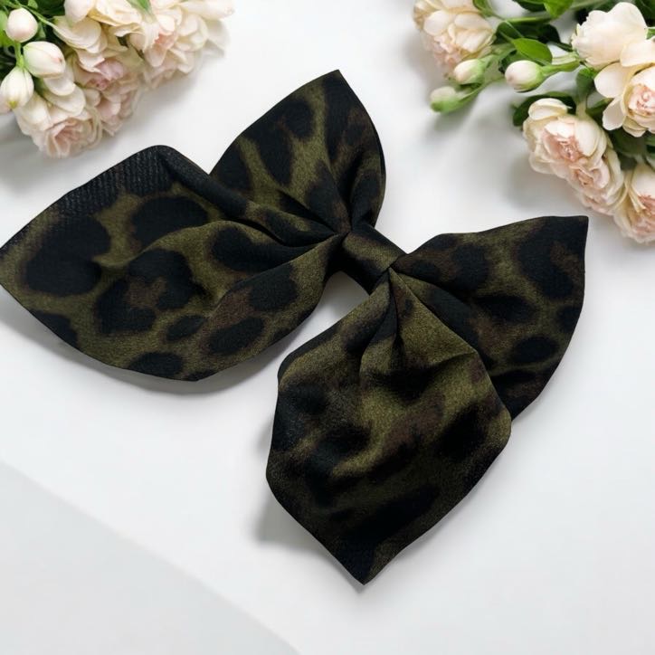 Spinka do włosów – oliwkowa kokarda z motywem w panterkę.