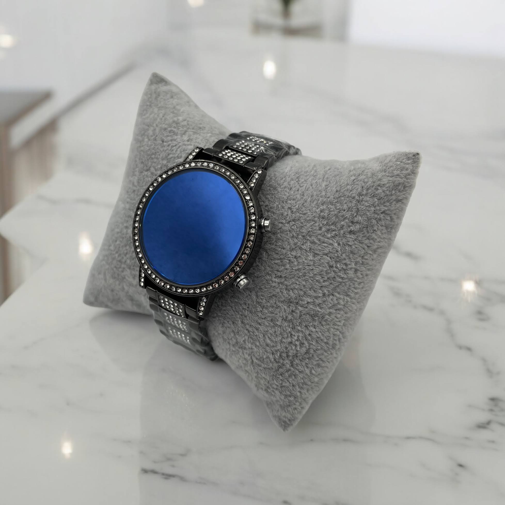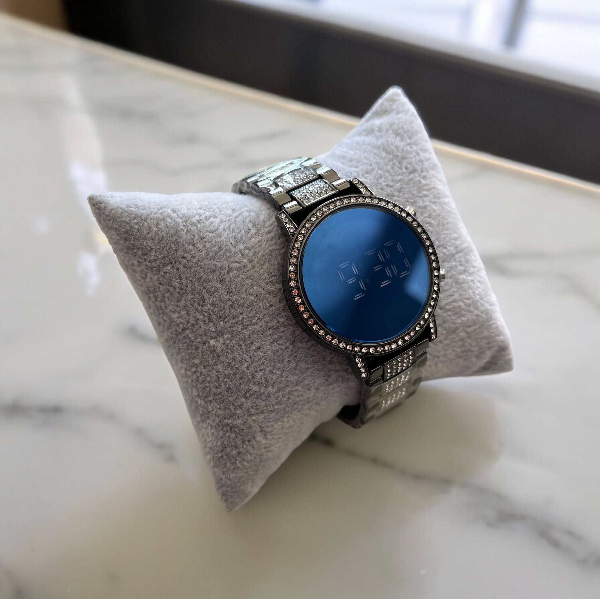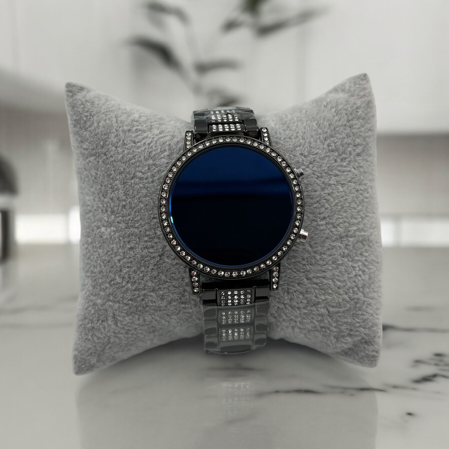 Damski zegarek ledowy w kolorze grafitowym. Koperta z wyświetlaczem LED. Zdobiony cyrkoniami.