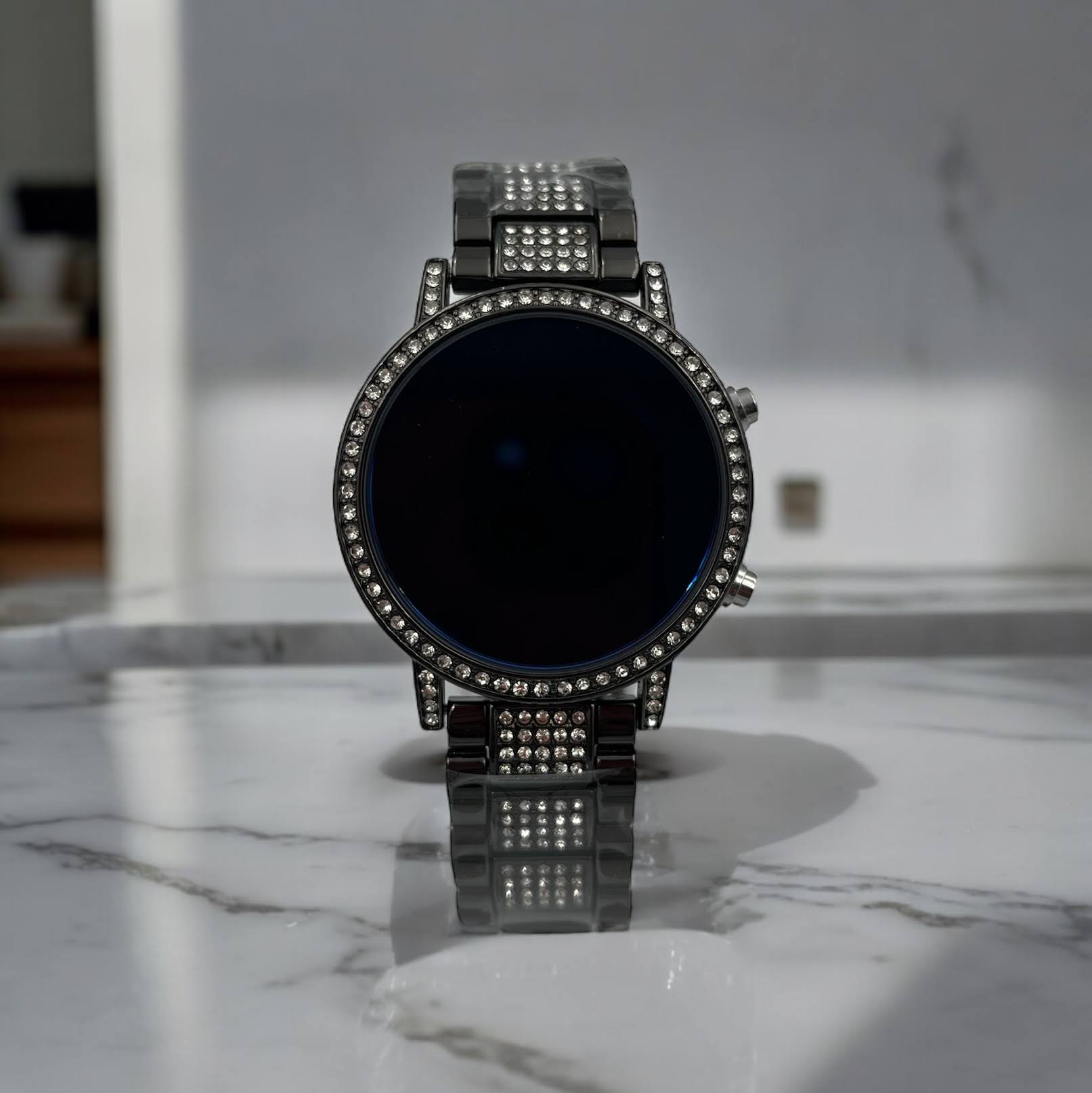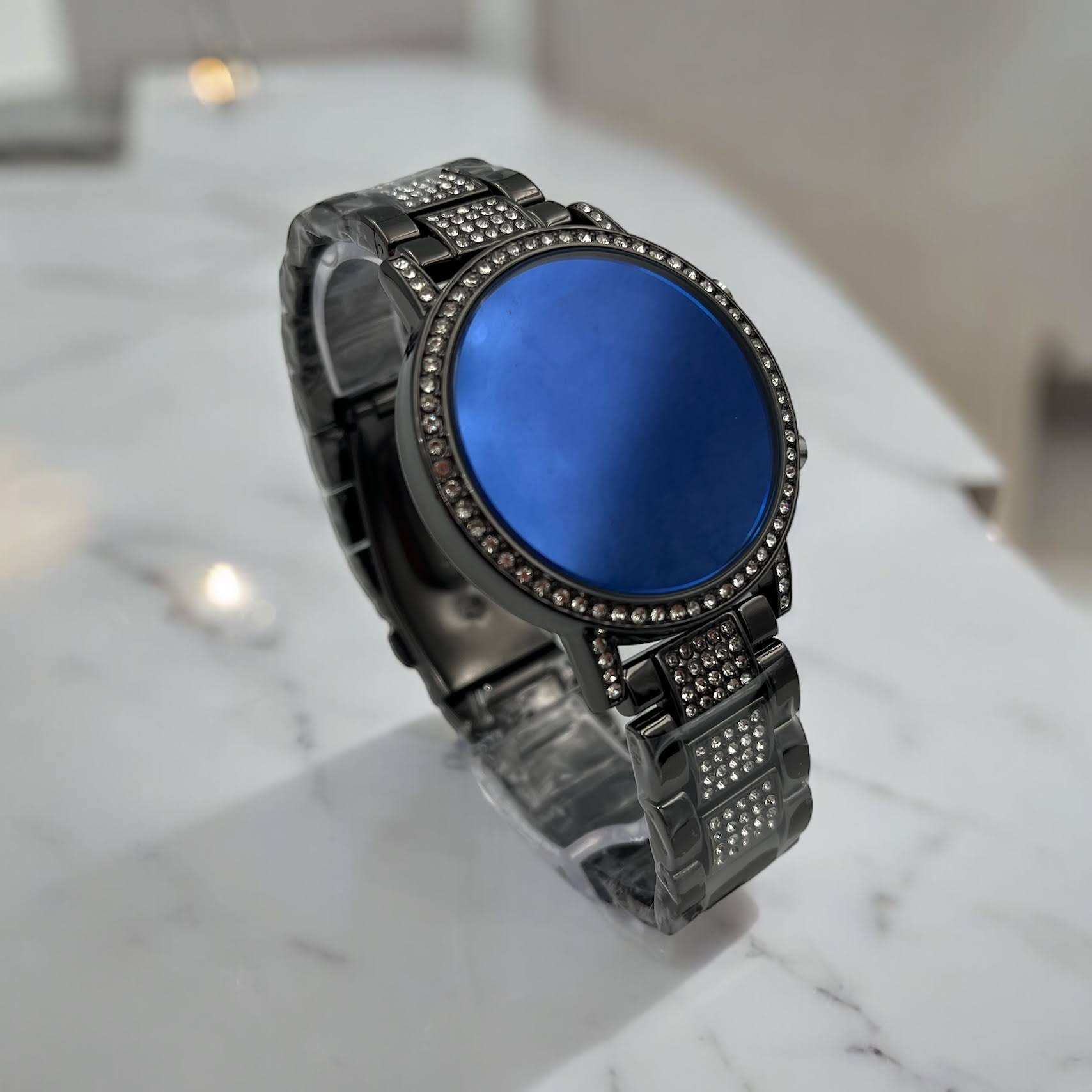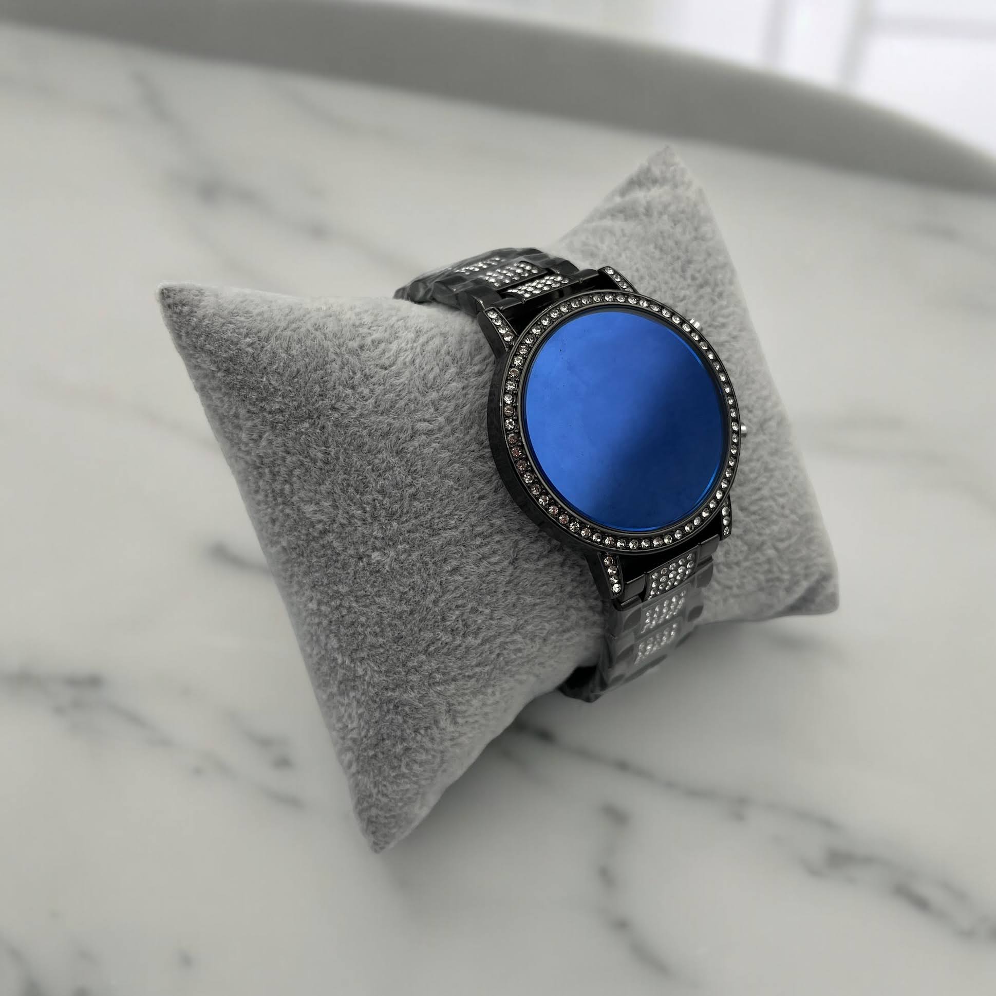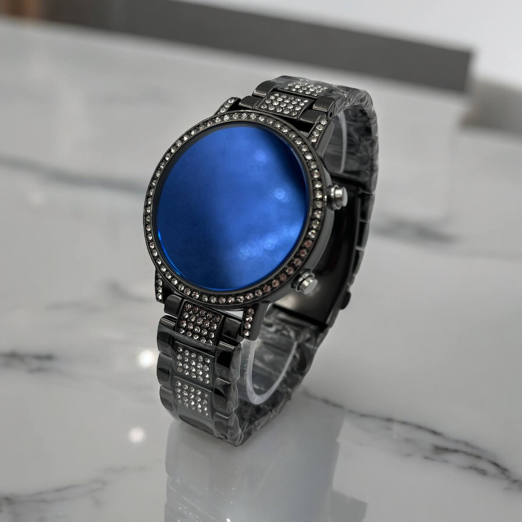 Damski zegarek ledowy w kolorze grafitowym. Koperta z wyświetlaczem LED. Zdobiony cyrkoniami.