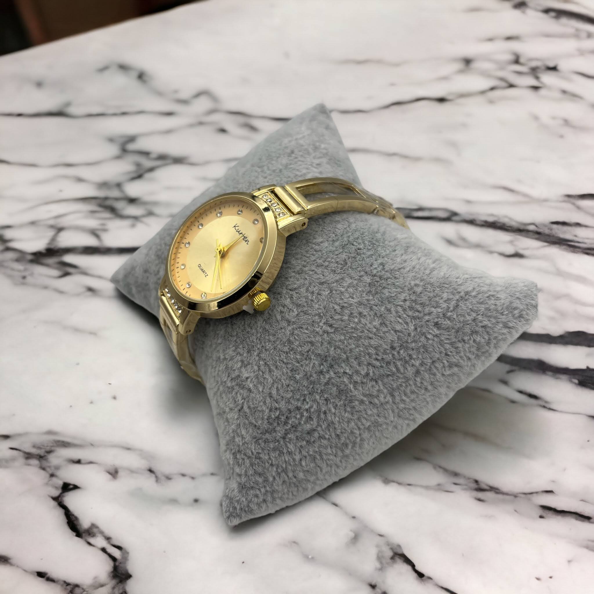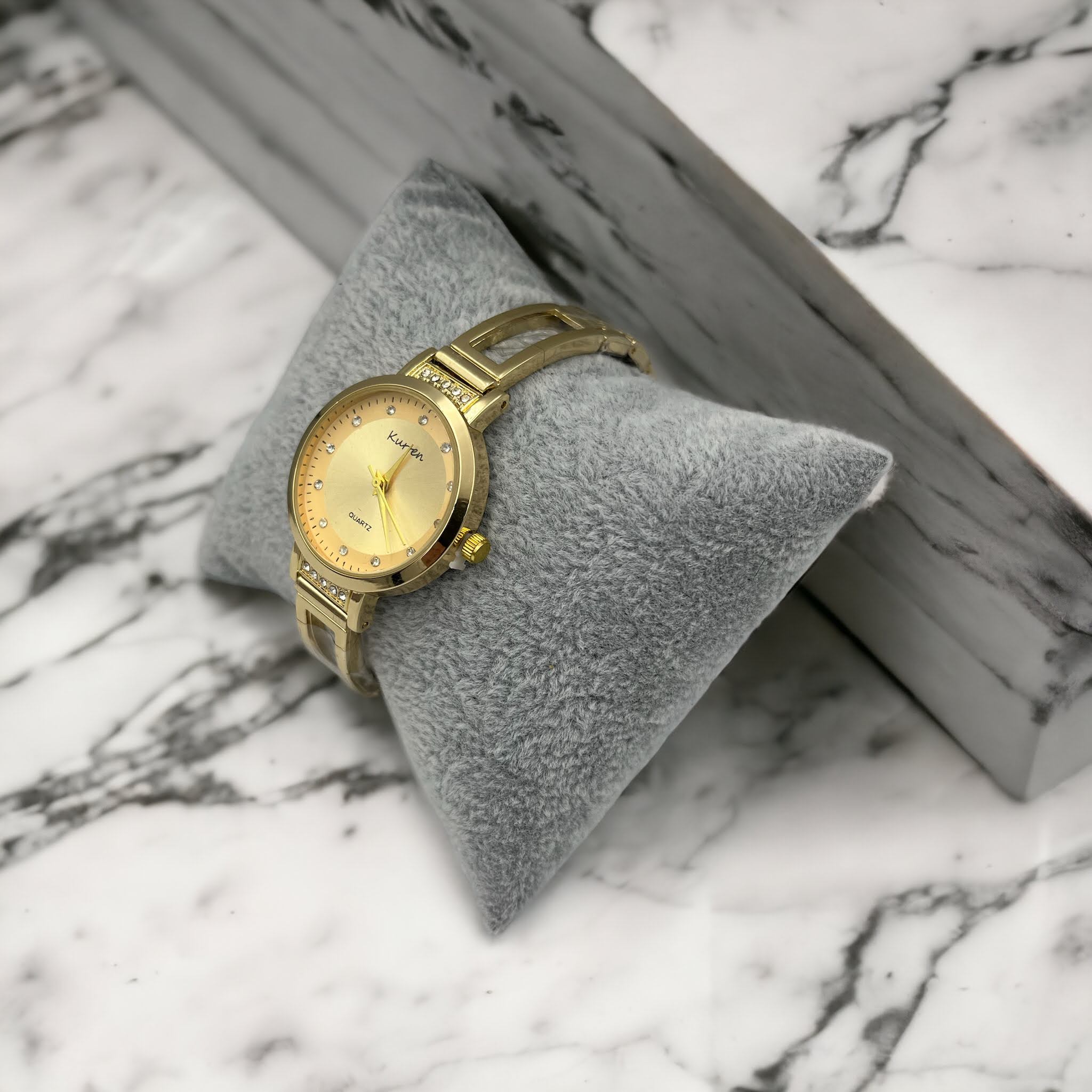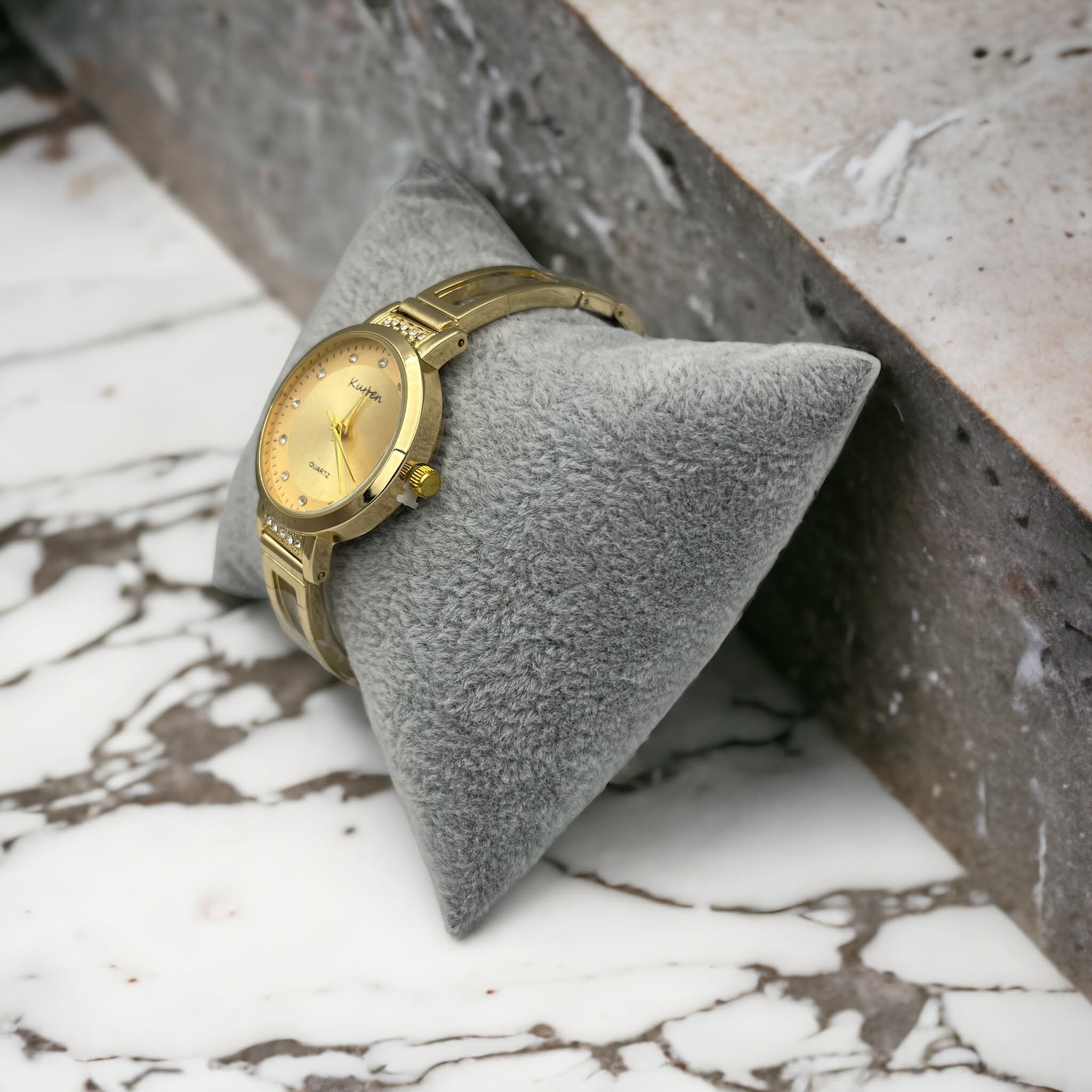 Zegarek na złotej, ciekawej bransolecie z cyrkoniami.
