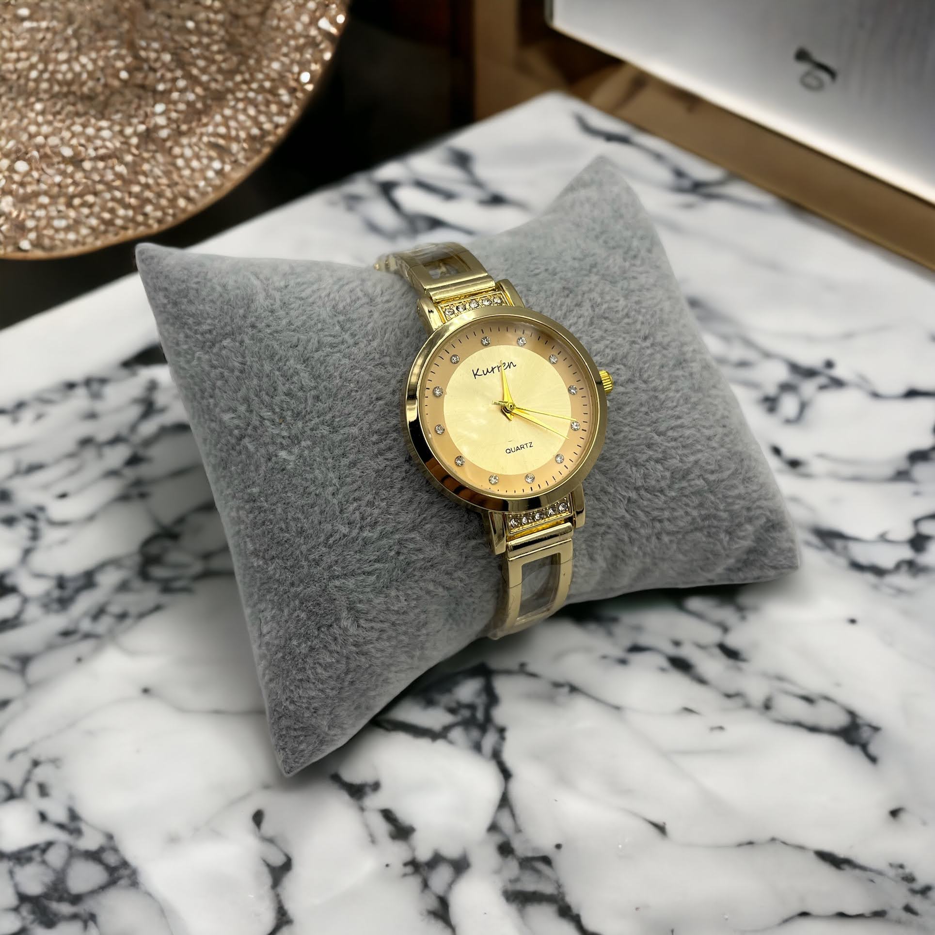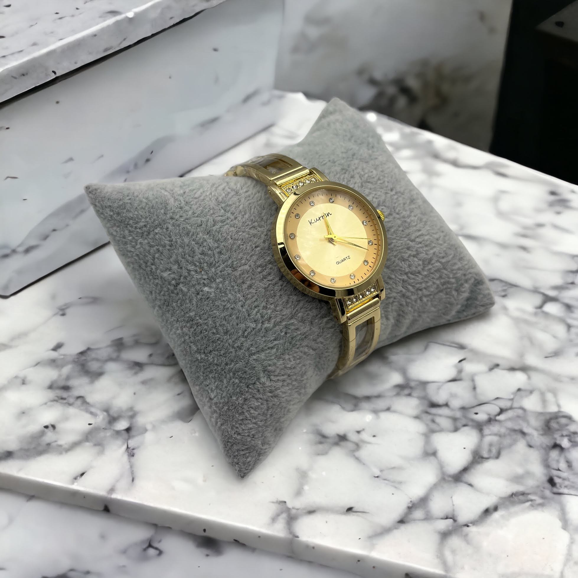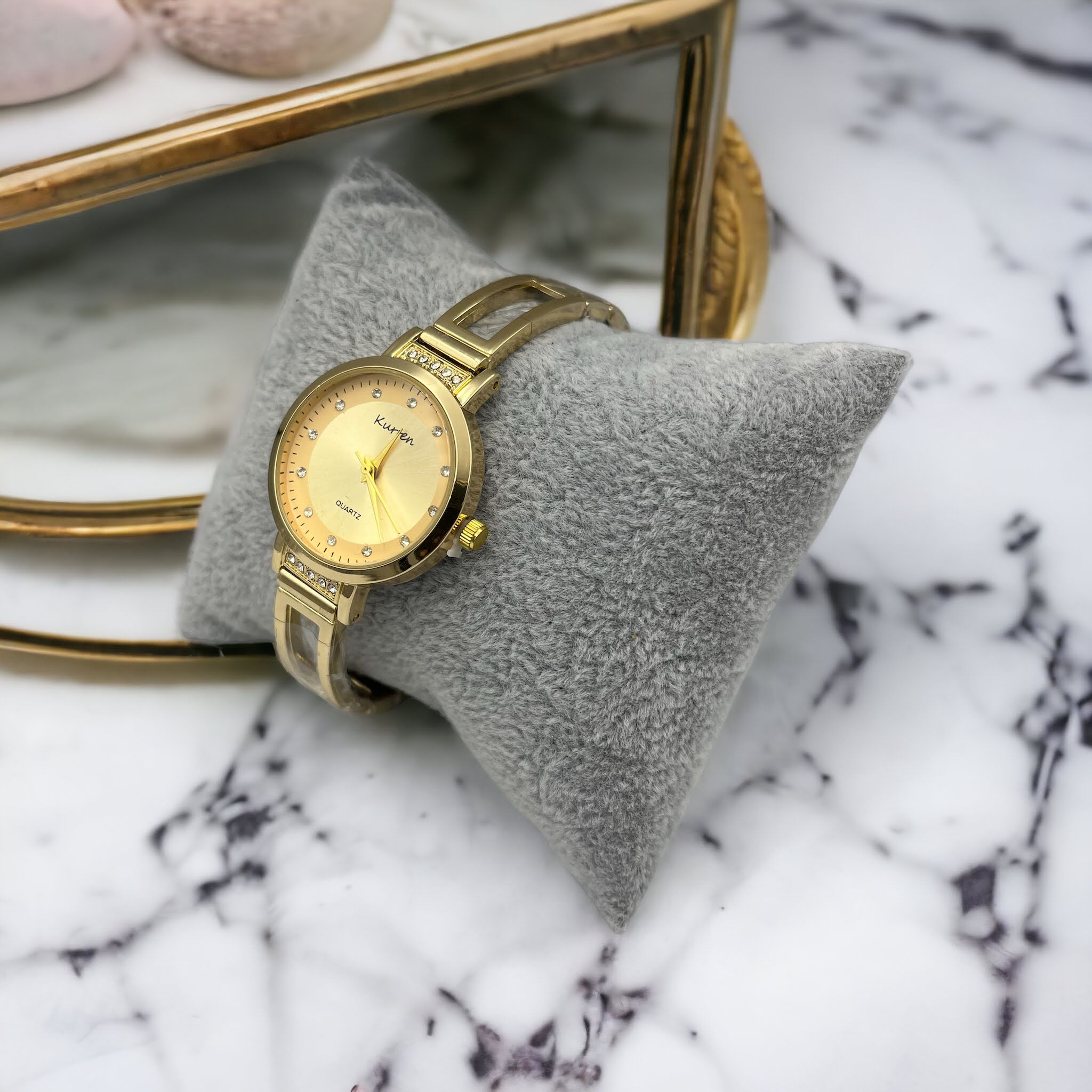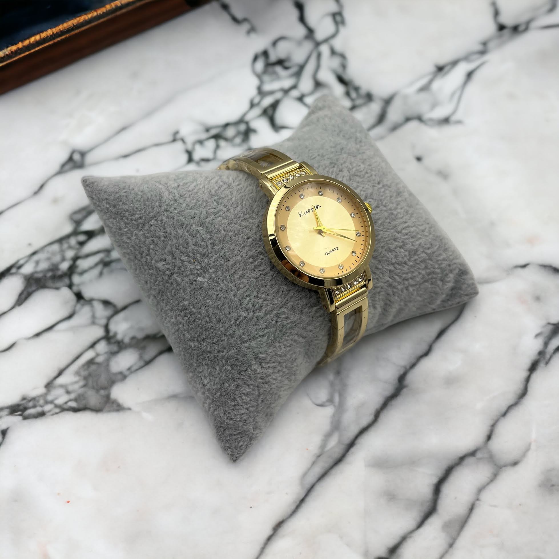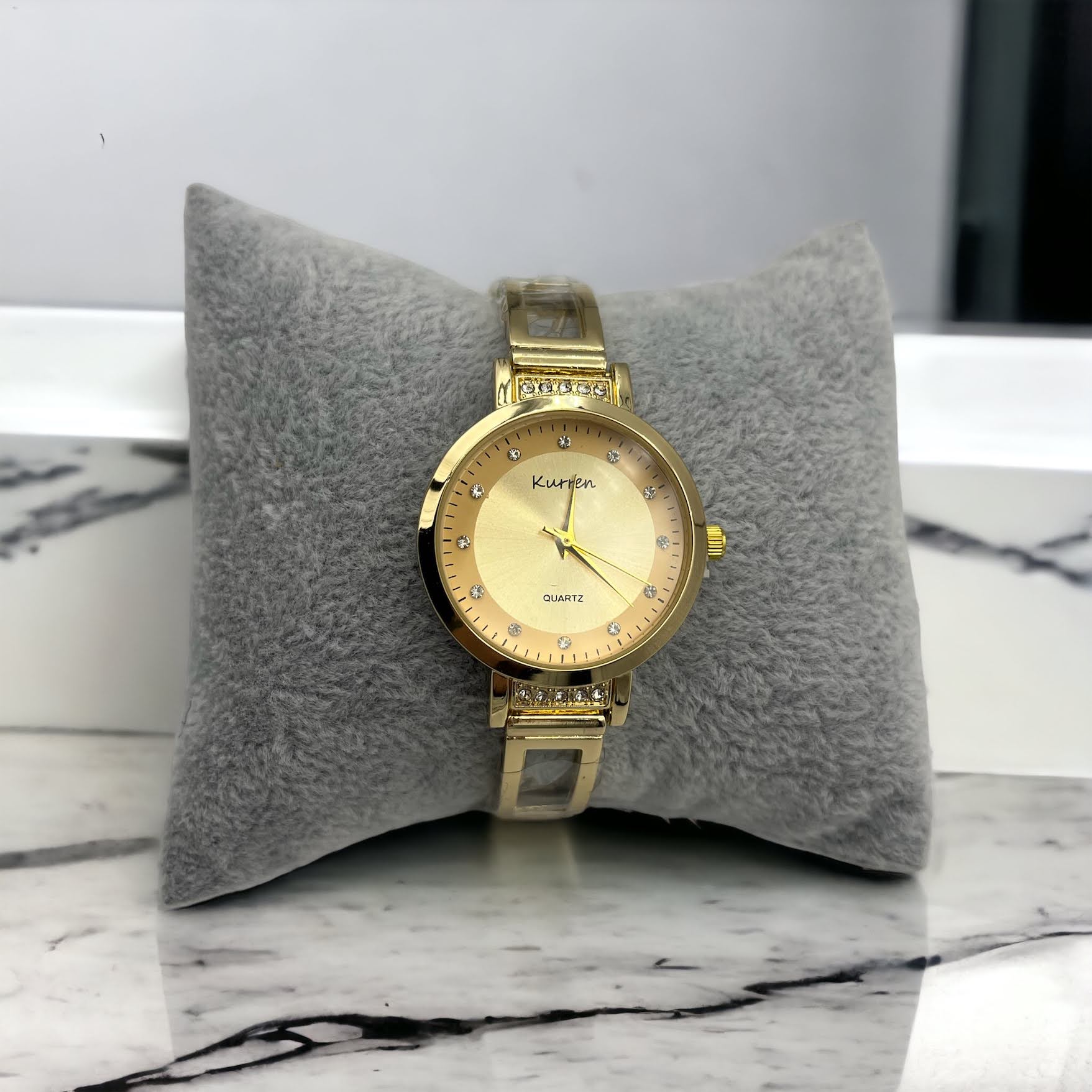 Damski zegarek analogowy w kolorze złotym. Koperta w kolorze złotym z cyrkoniami w miejscu indeksów.
