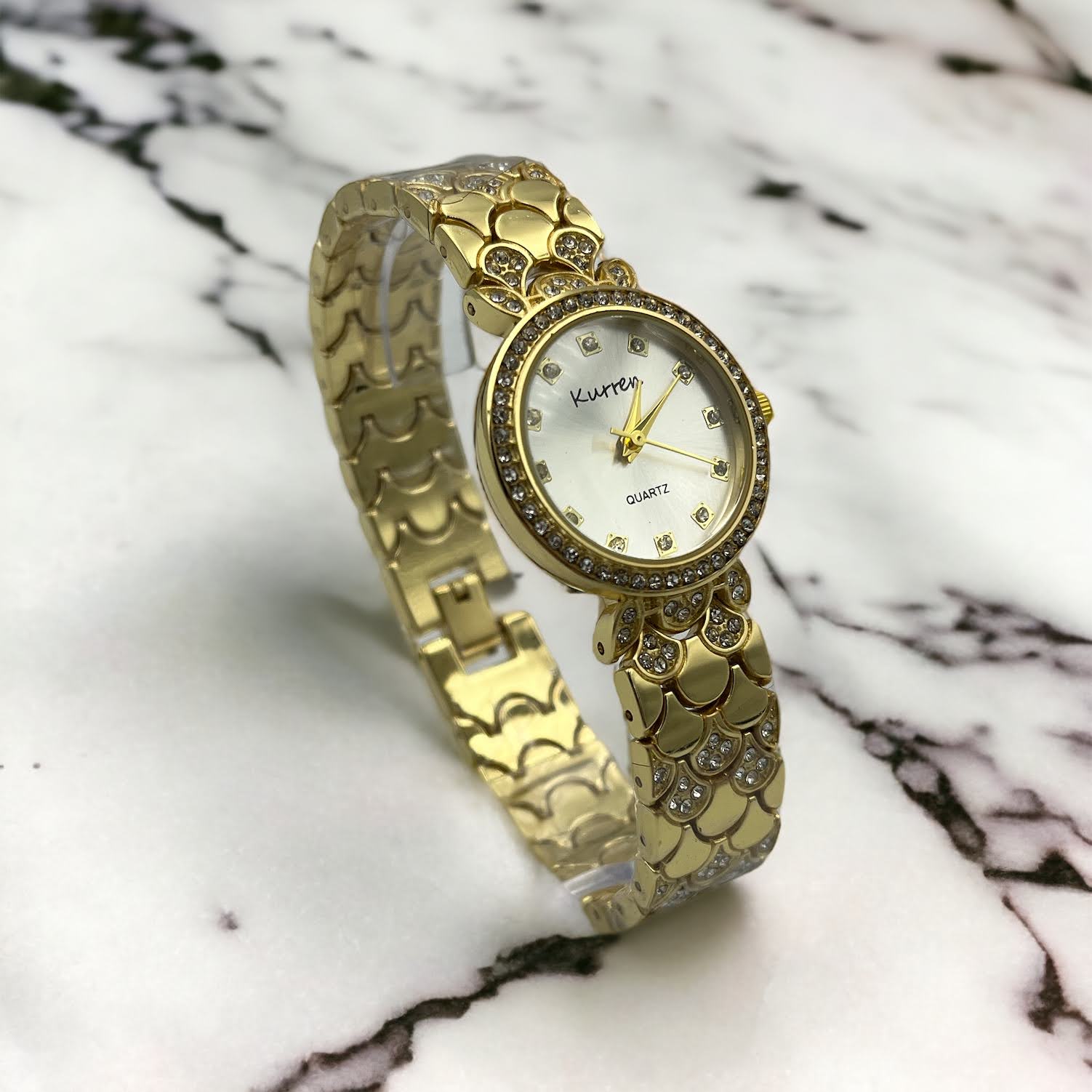 Damski zegarek analogowy w kolorze złotym. Koperta w kolorze srebrnym z cyrkoniami. Bransoleta na wzór rybich łusek.