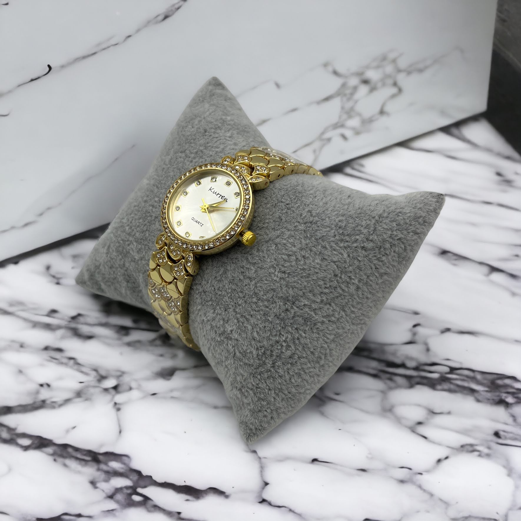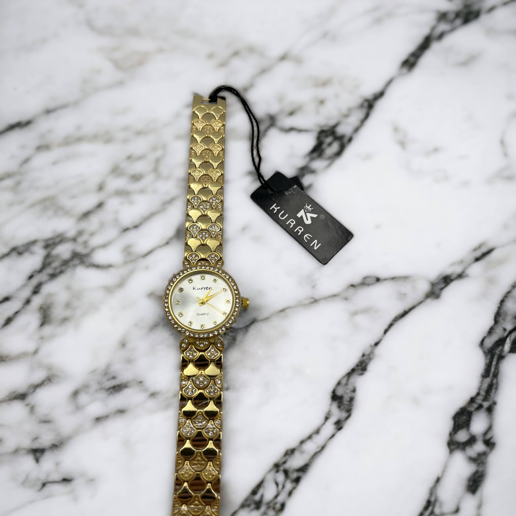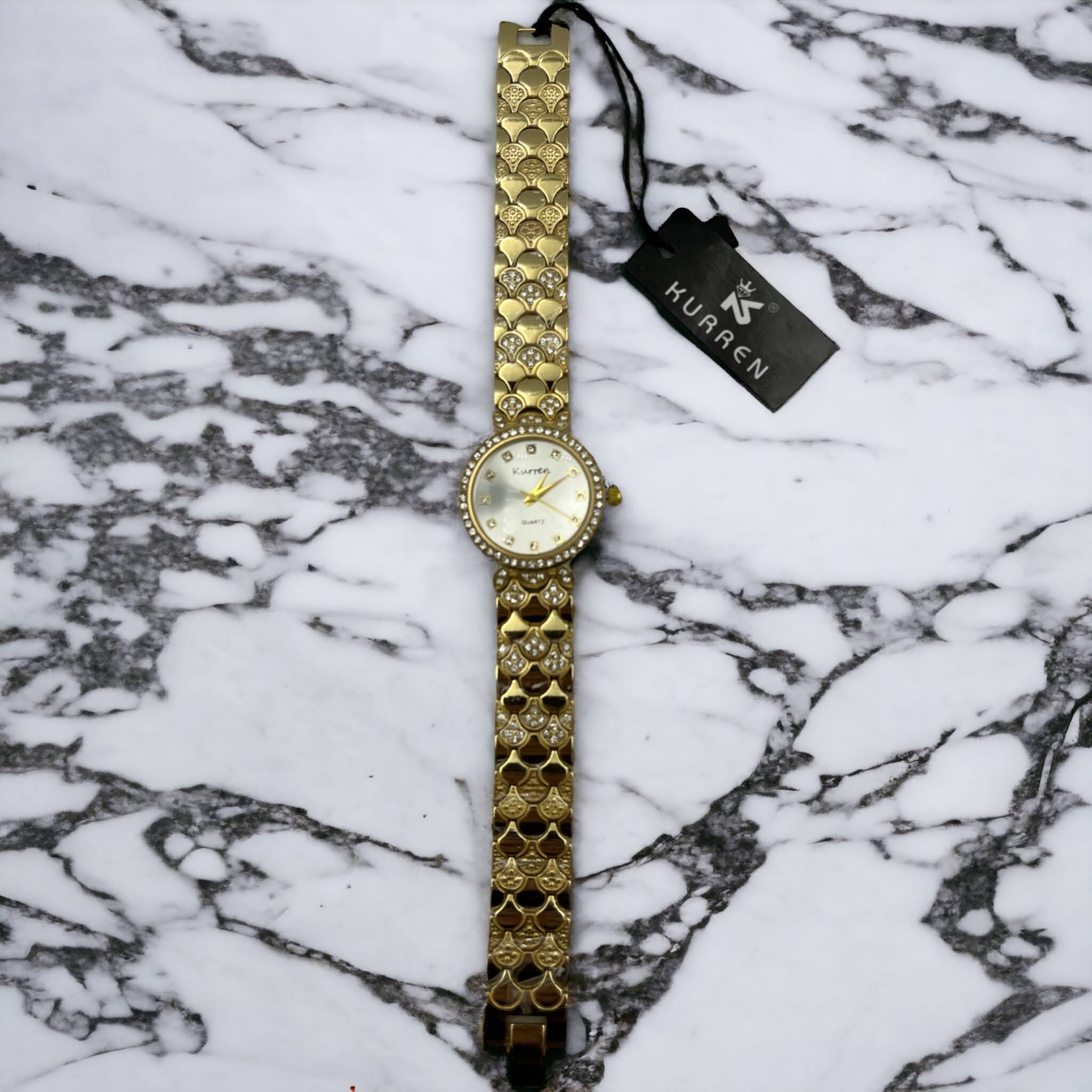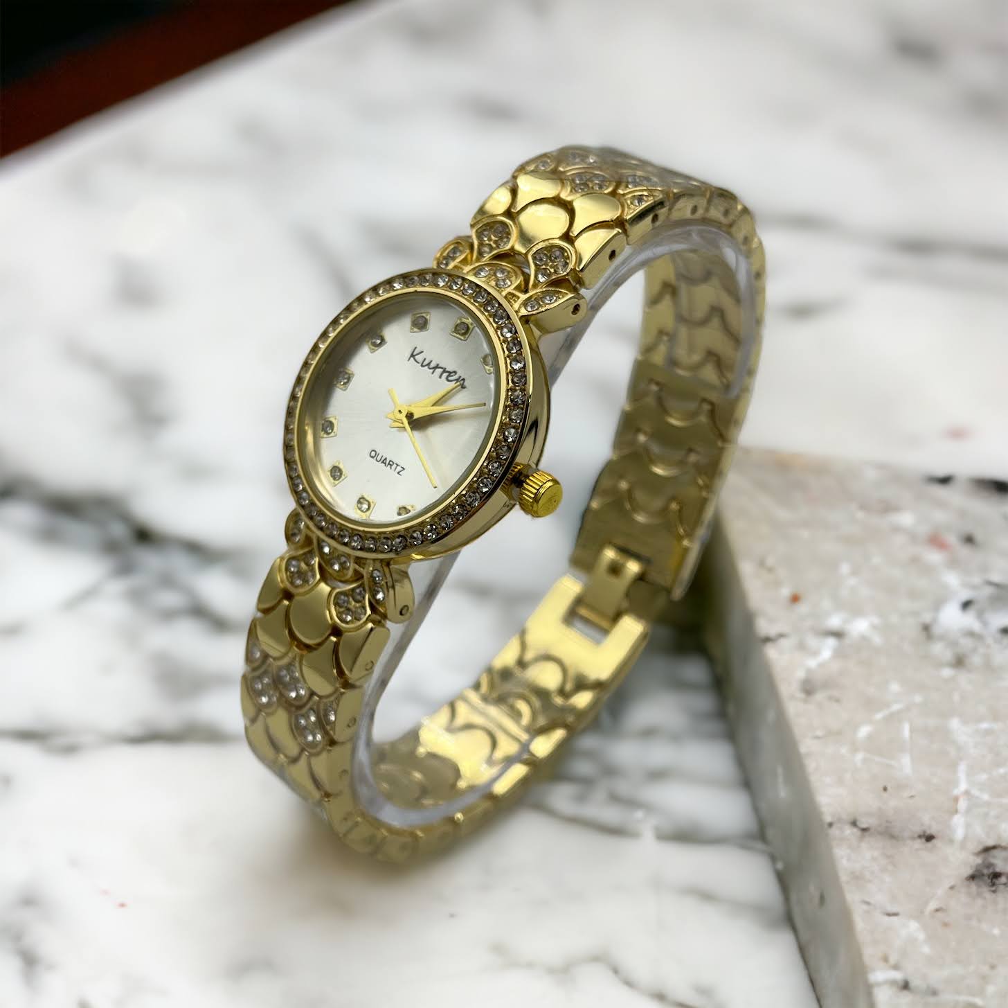 Zegarek na złotej, ciekawej bransolecie z cyrkoniami. Bransoleta z możliwością skrócenia we własnym zakresie.