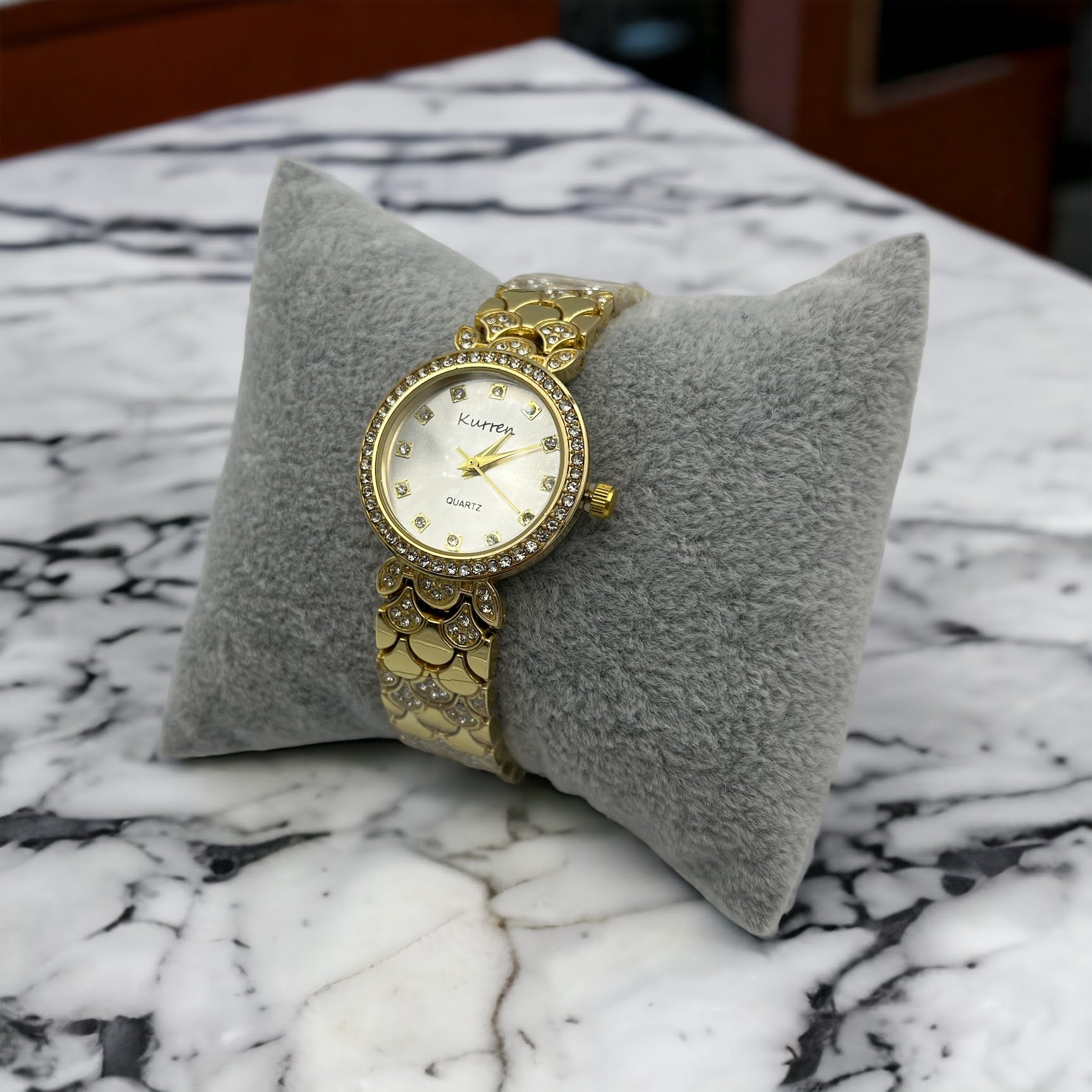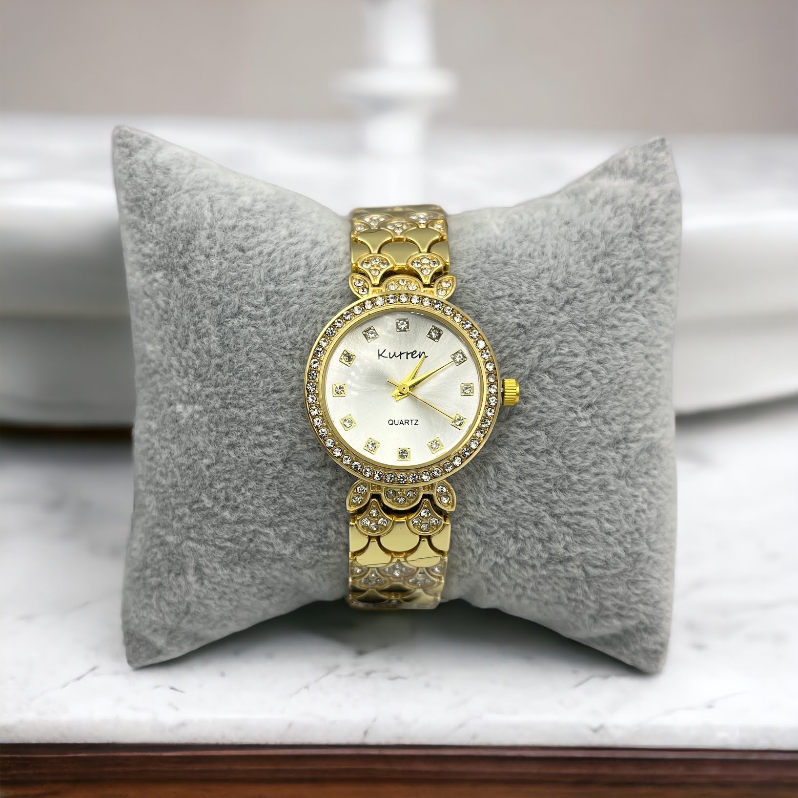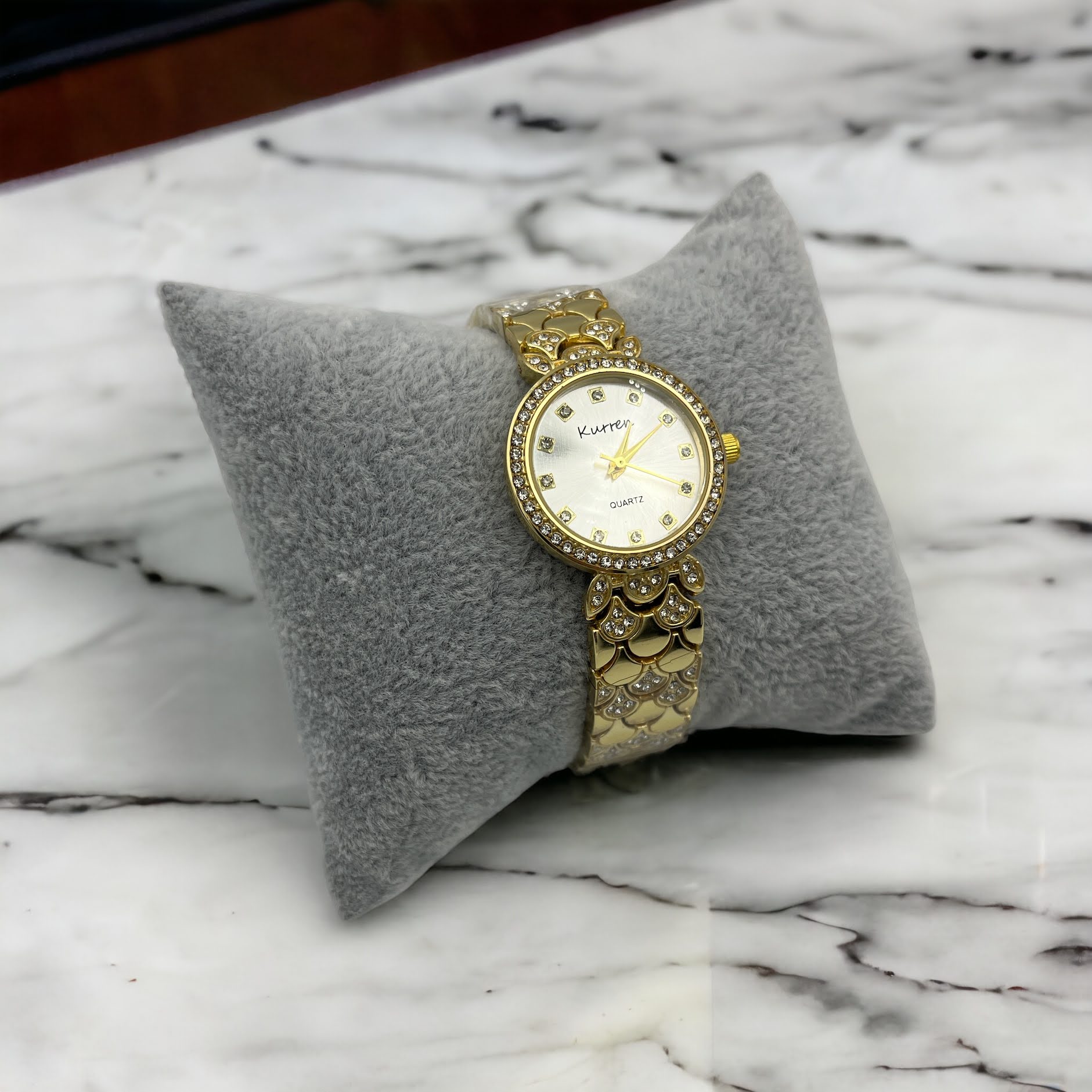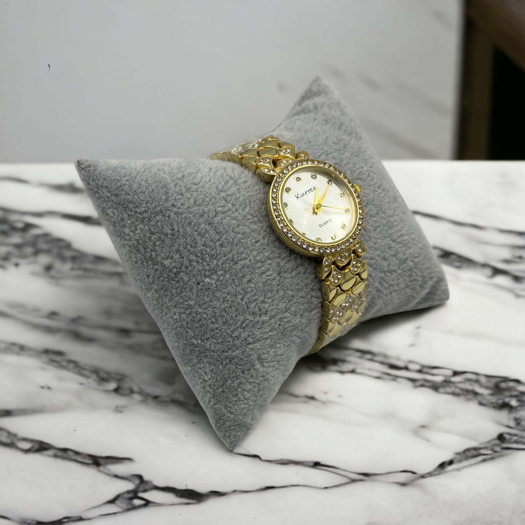 Zegarek na złotej, ciekawej bransolecie z cyrkoniami. Bransoleta z możliwością skrócenia we własnym zakresie.