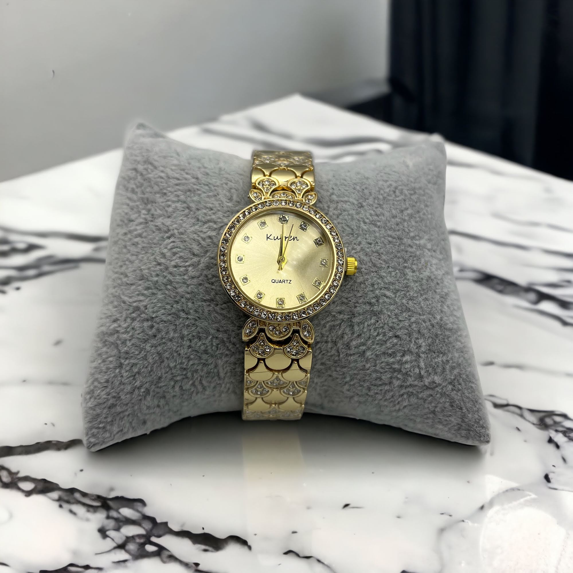 Damski zegarek analogowy w kolorze złotym. Koperta w kolorze złotym z cyrkoniami. Bransoleta na wzór rybich łusek.