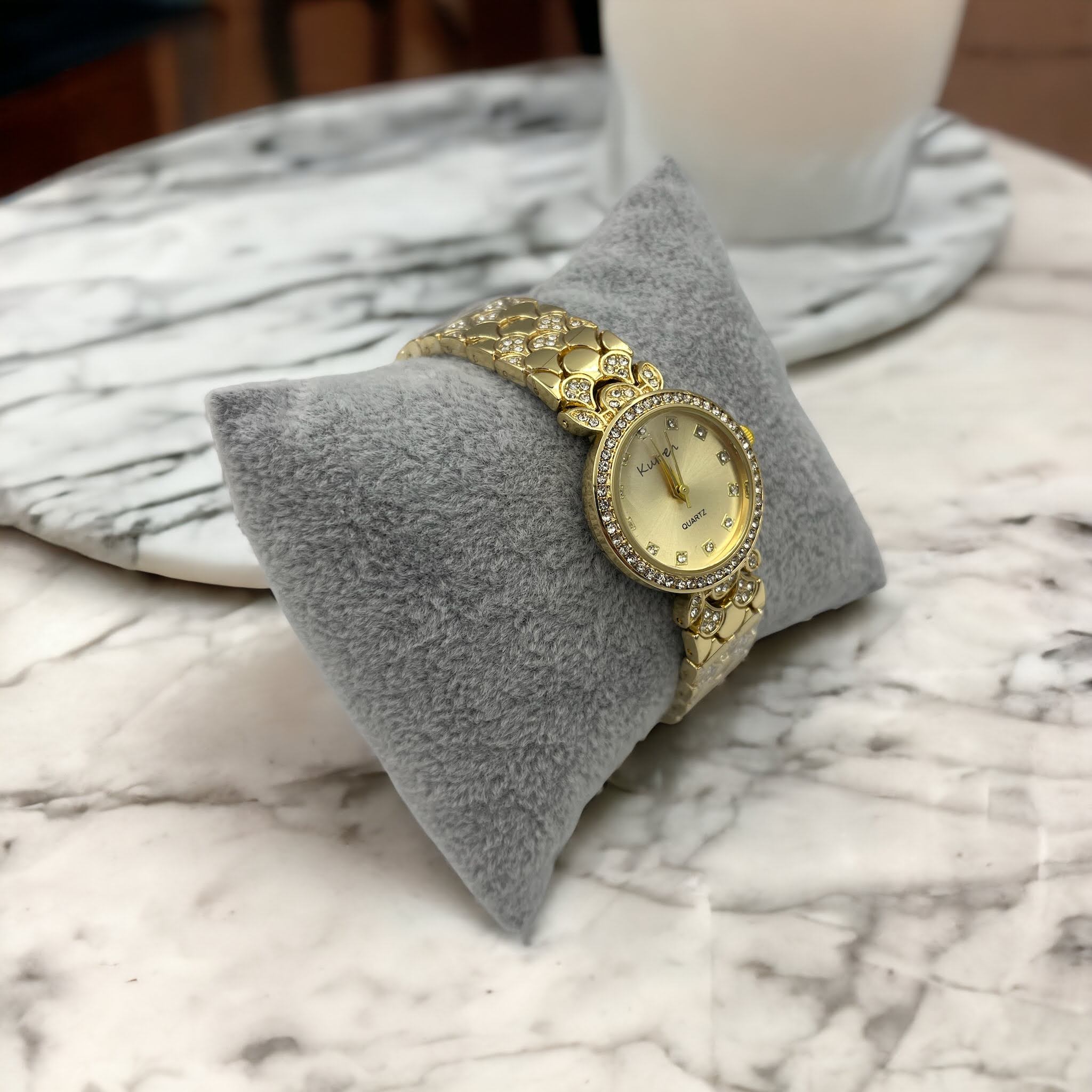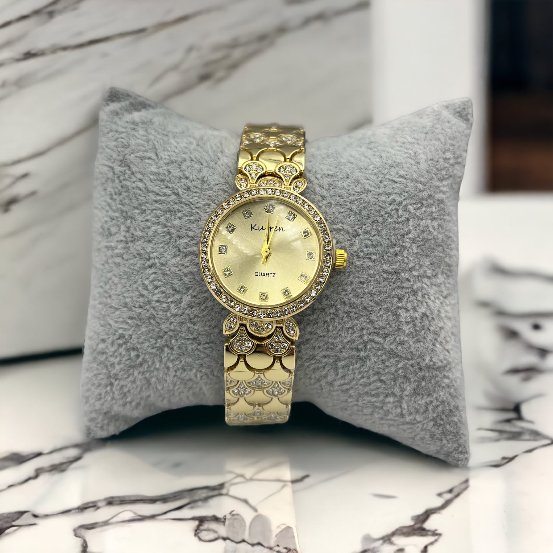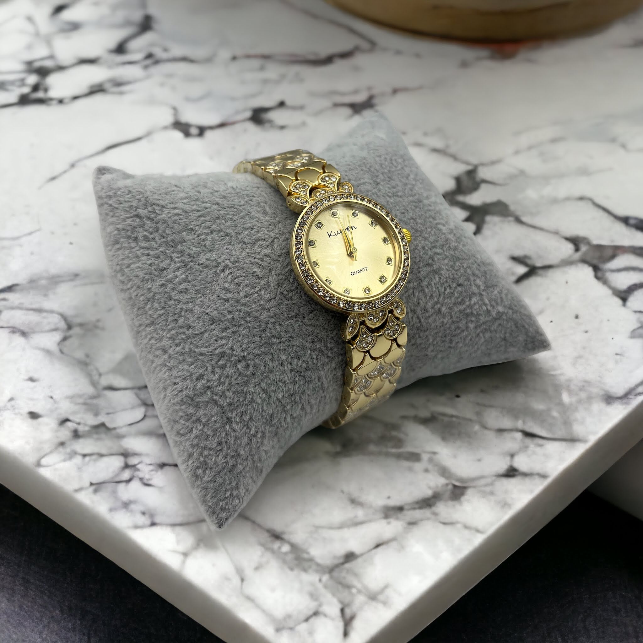 Zegarek na złotej, ciekawej bransolecie z cyrkoniami. Bransoleta z możliwością skrócenia we własnym zakresie.