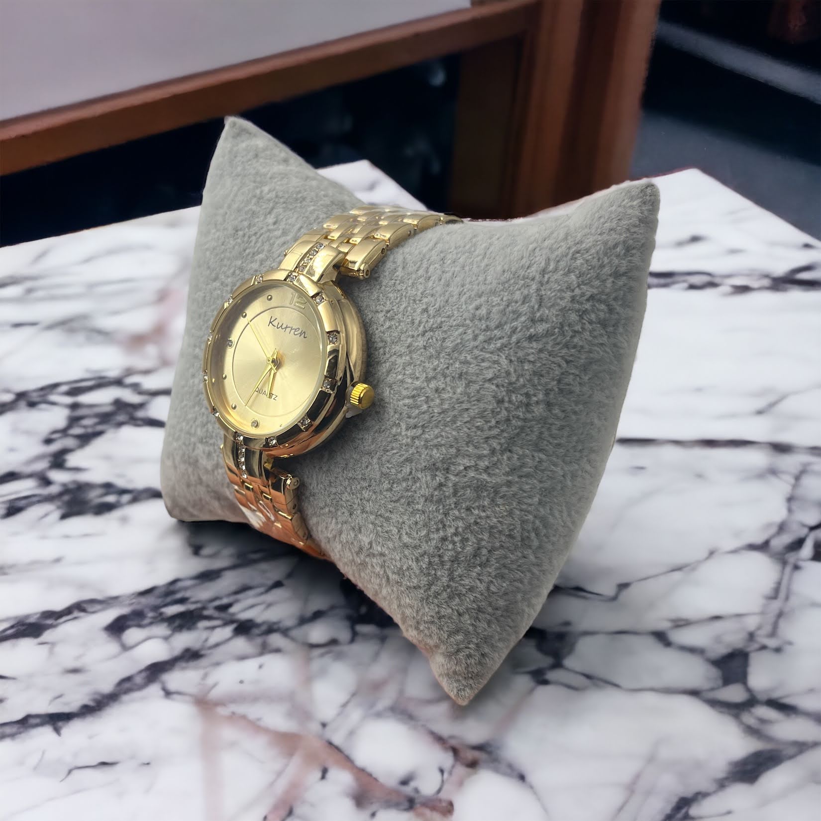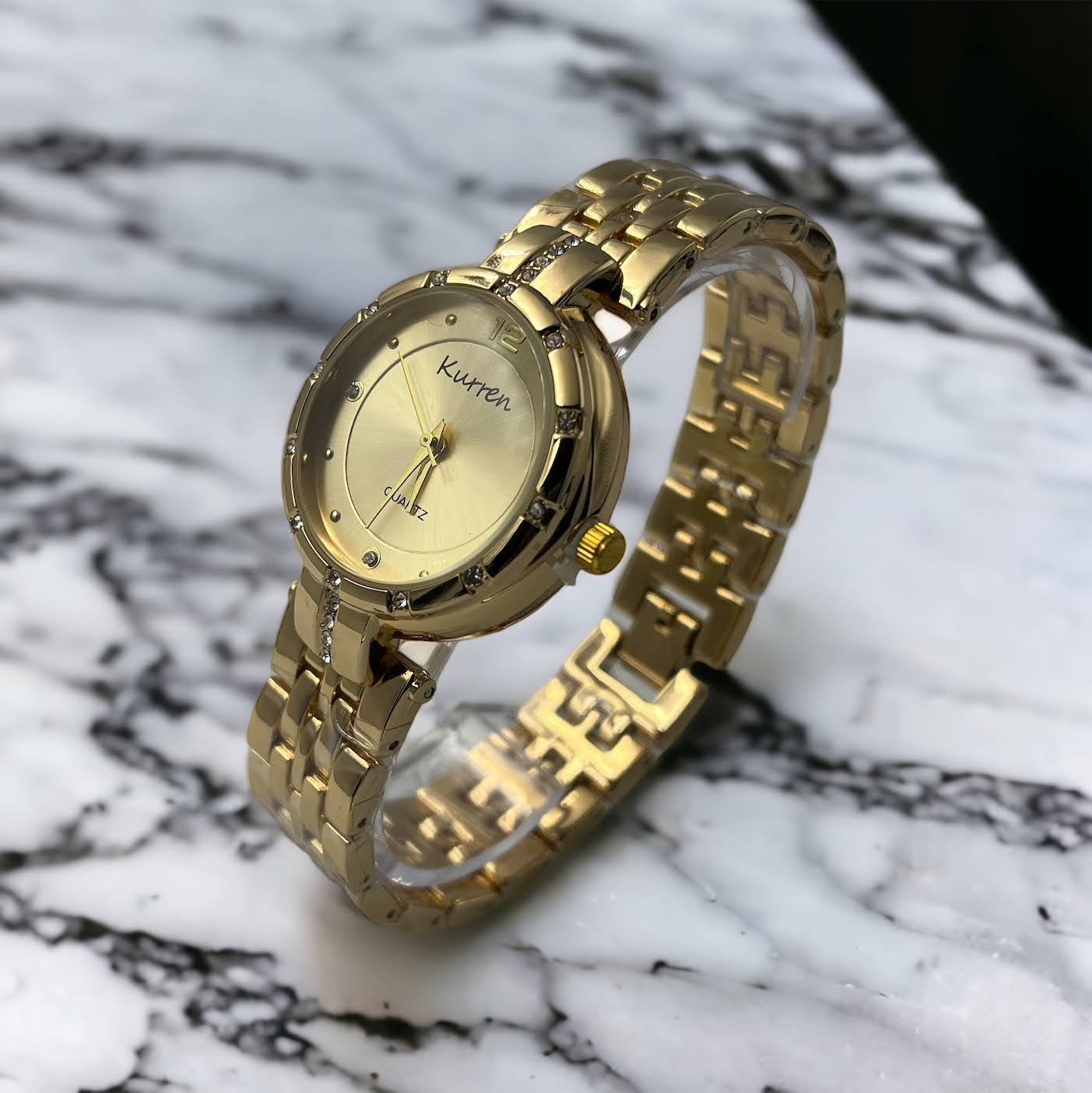 Damski zegarek analogowy w kolorze złotym. Koperta w kolorze złotym z cyrkoniami.