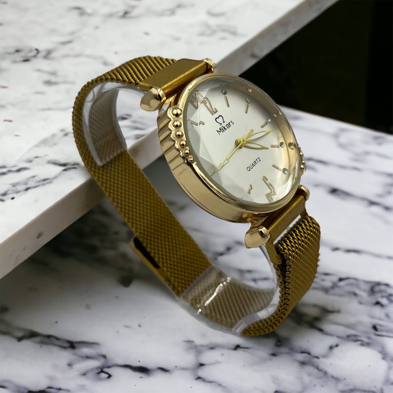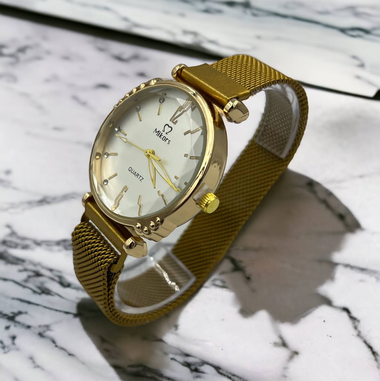 Damski zegarek analogowy w kolorze złotym. Koperta w kant w kolorze ecru. Zegarek z bransoletą z zapięciem magnetycznym.