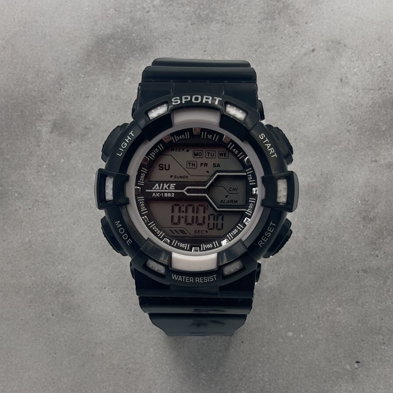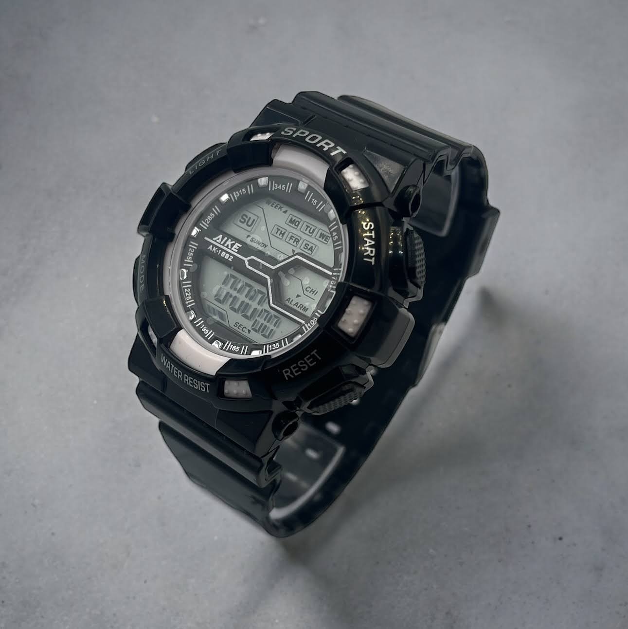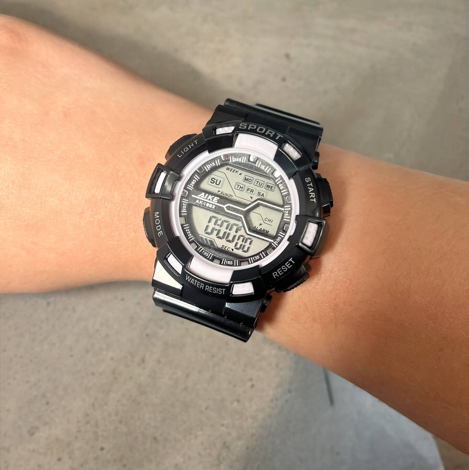 Sportowy zegarek elektroniczny w kolorze czarnym.
