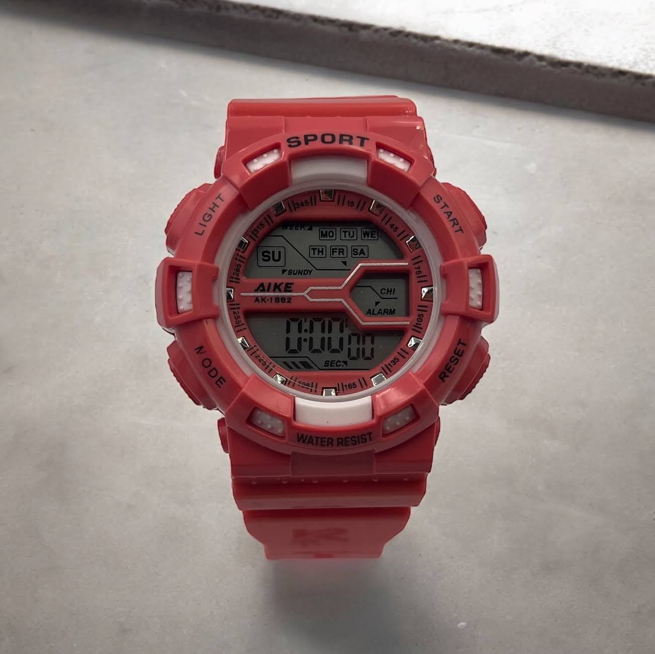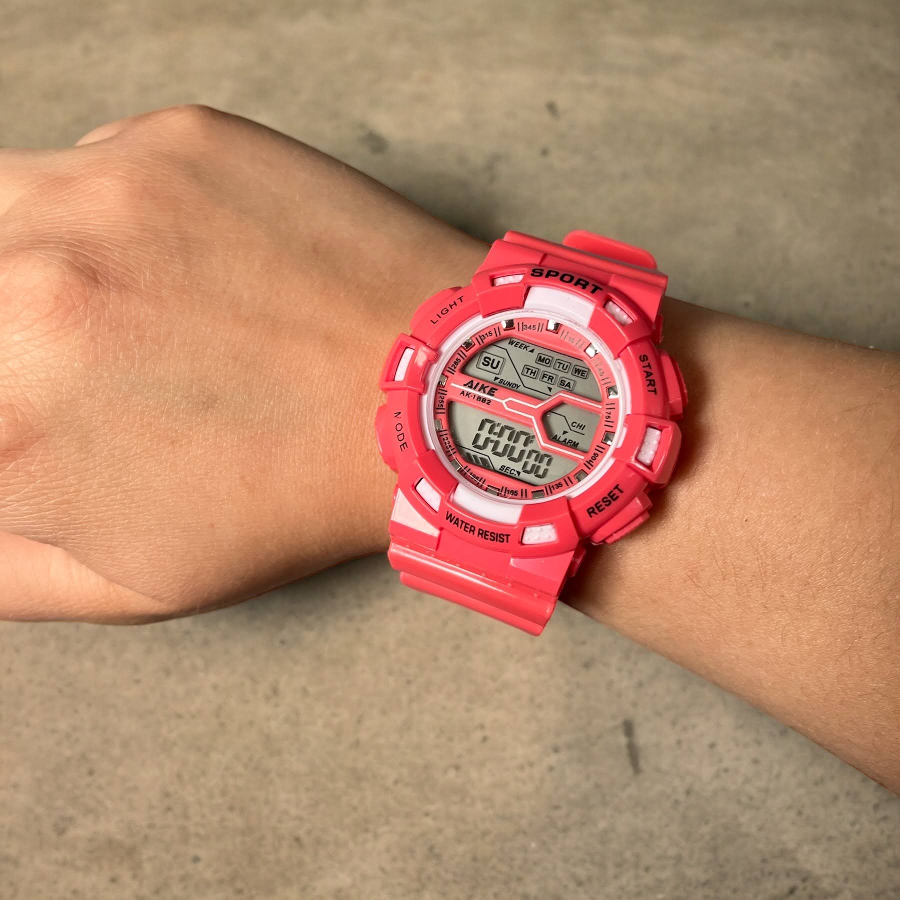 Sportowy zegarek elektroniczny w kolorze różowym.